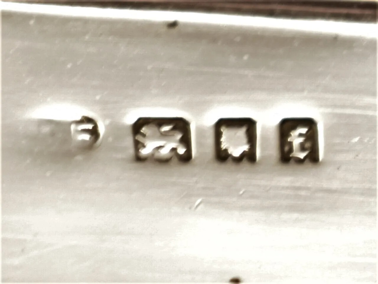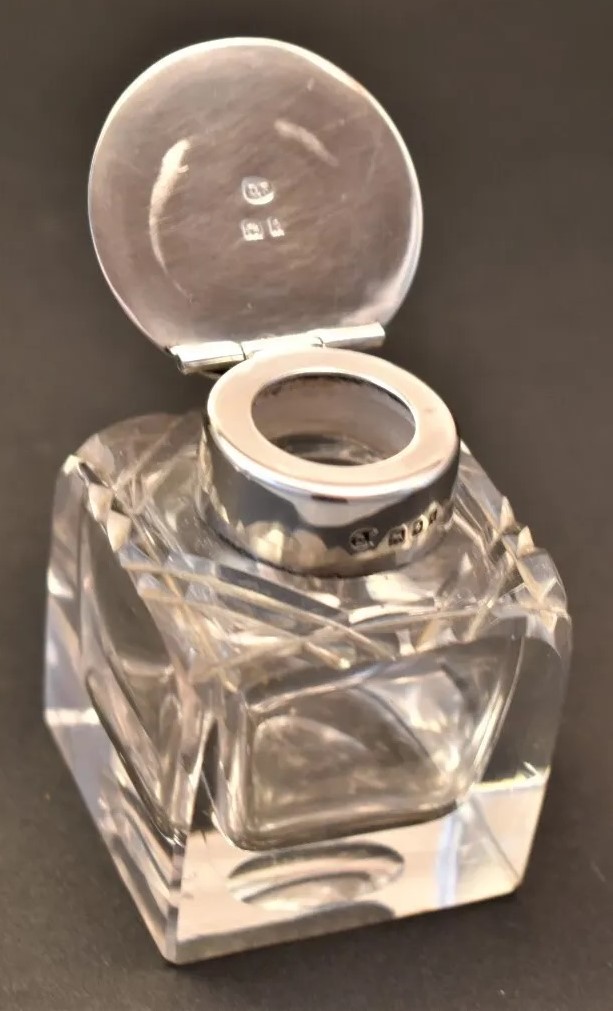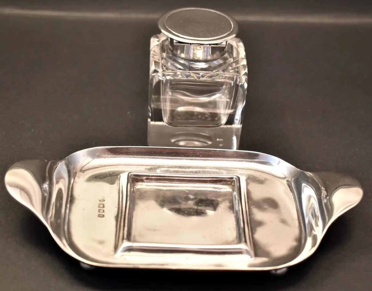 A clear, square-shaped glass inkwell with a hinged silver top rests on a silver tray with curved edges. Both pieces have hallmarks for Josiah Williams & Co. (David Fullerton), London, 1921.