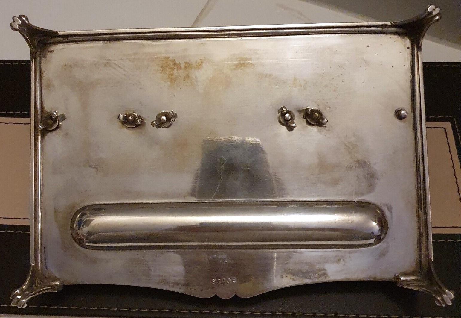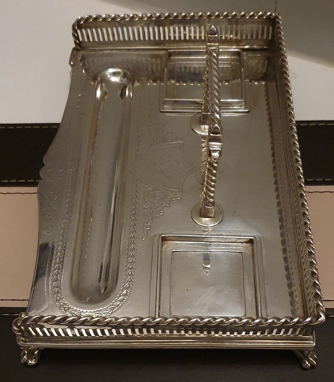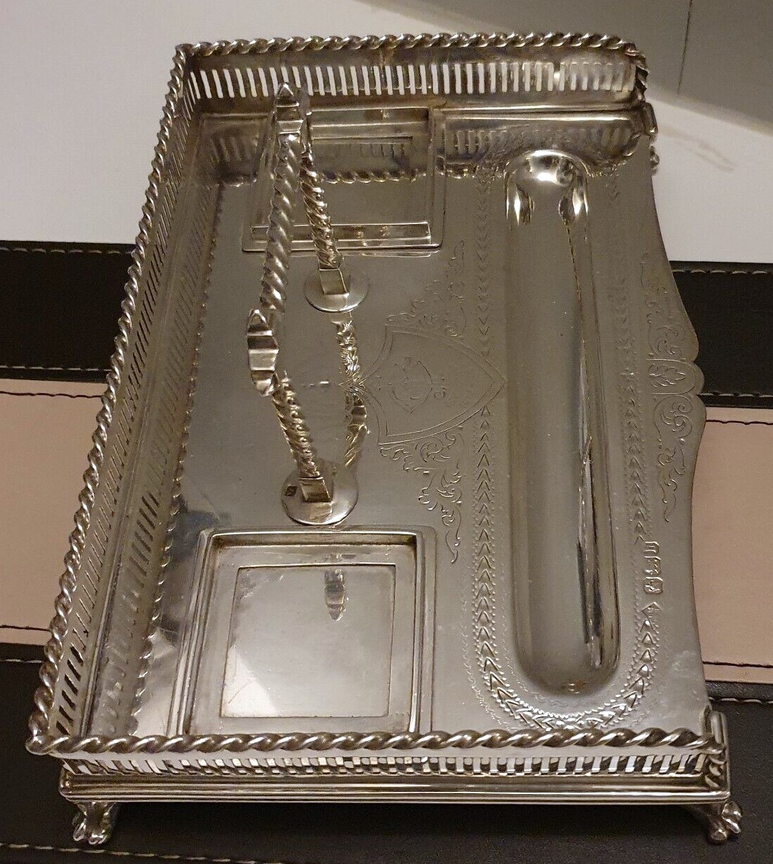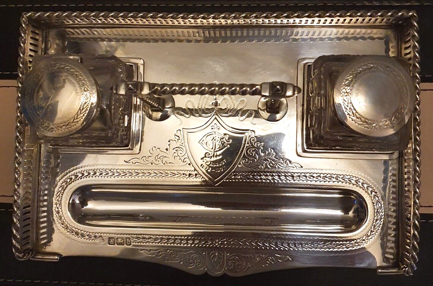 Late Victorian hallmarked silver double inkstand, rectangular in shape with three-quarter raised gallery with rope twist trim and central carrying handle, standing on four scroll bracket feet. Two glass inkwells with silver lids from Martin Hall & Co. Sheffield 1894.