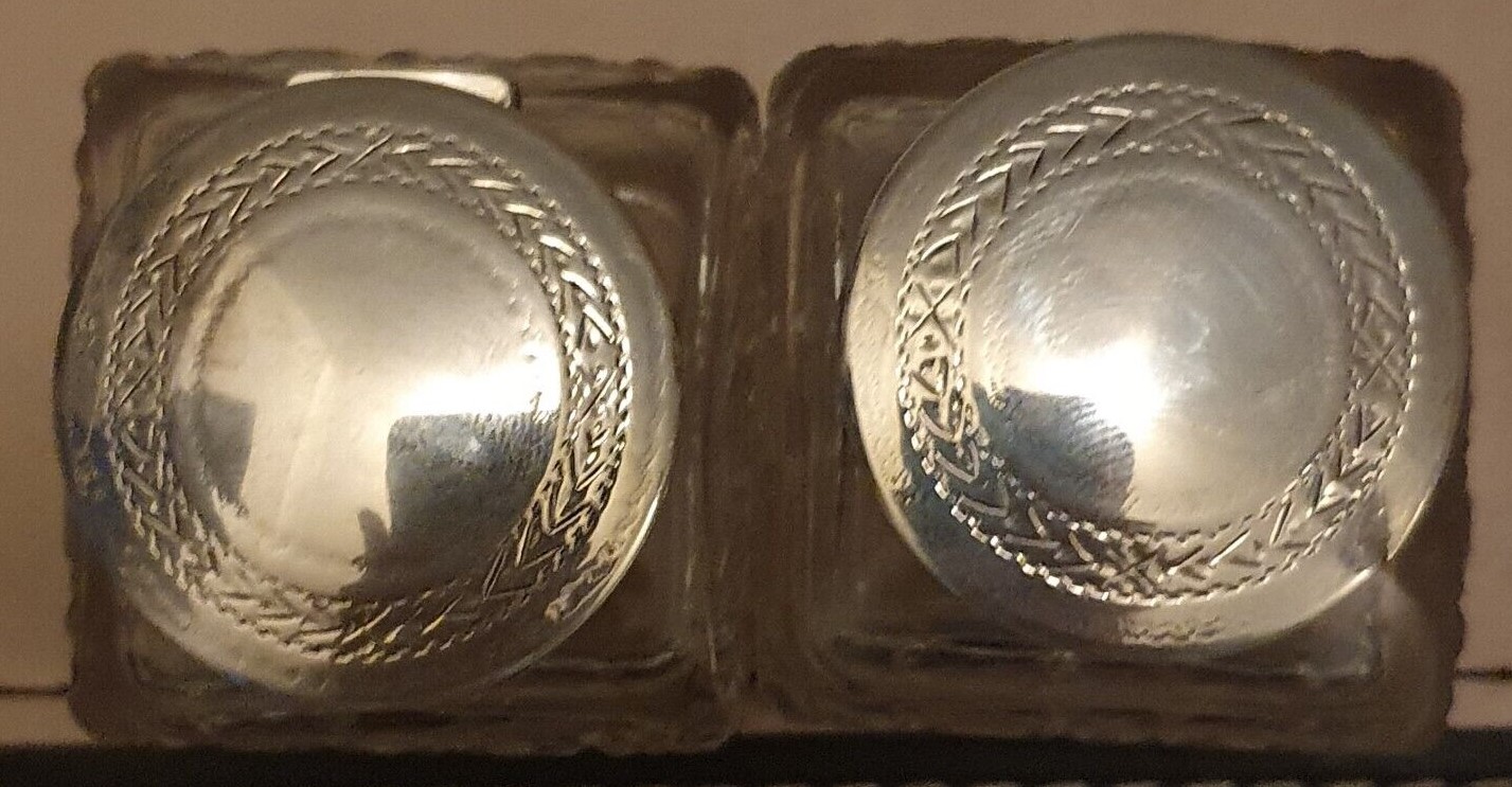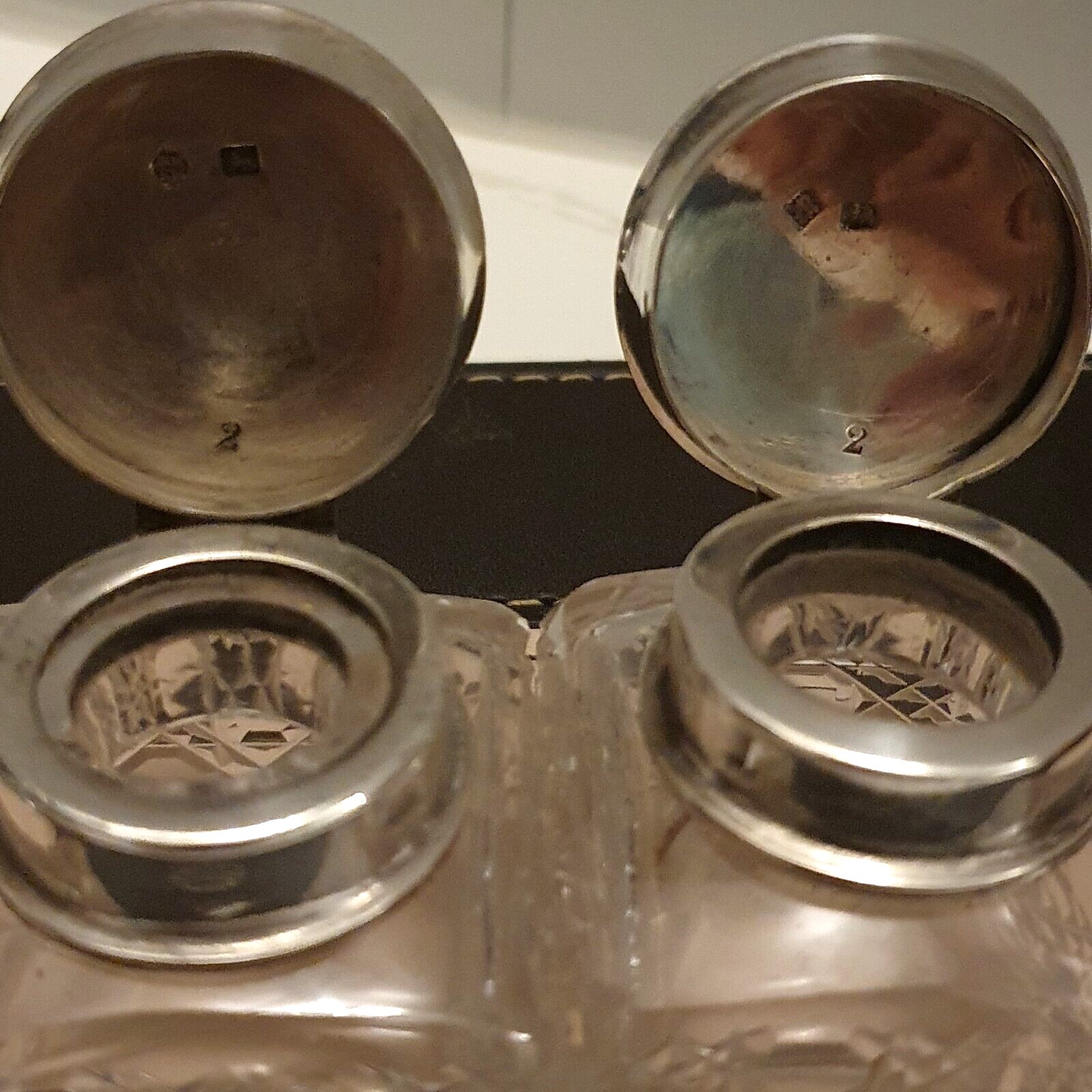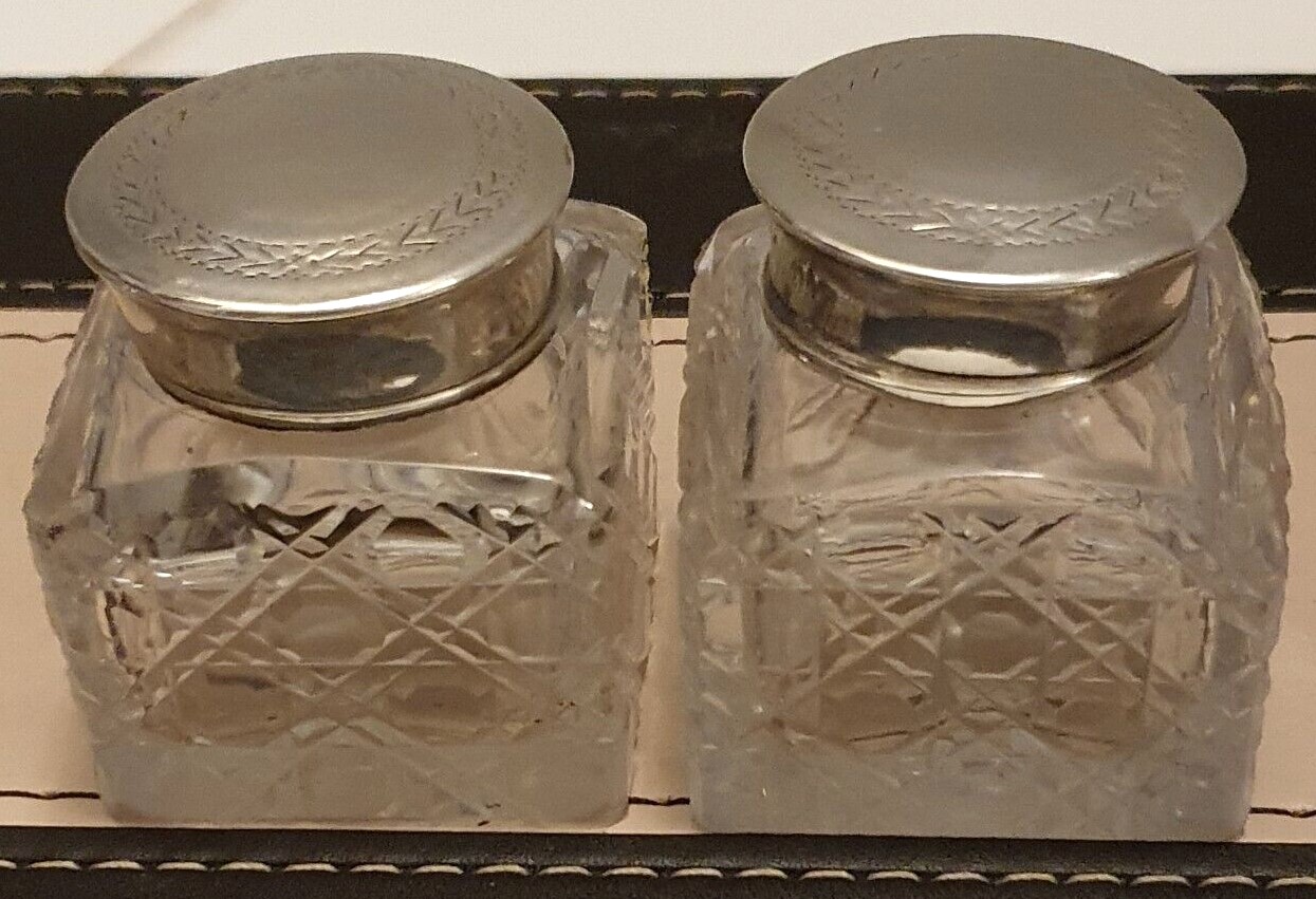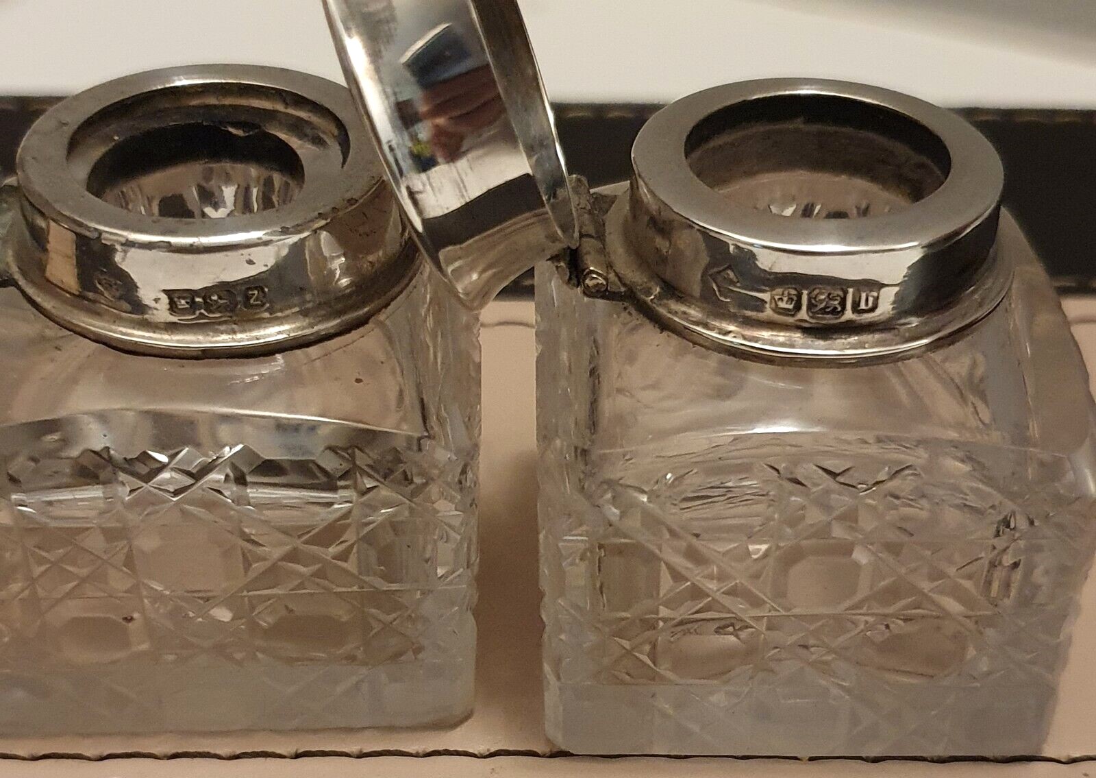 Late Victorian hallmarked silver double inkstand, rectangular in shape with three-quarter raised gallery with rope twist trim and central carrying handle, standing on four scroll bracket feet. Two glass inkwells with silver lids from Martin Hall & Co. Sheffield 1894.