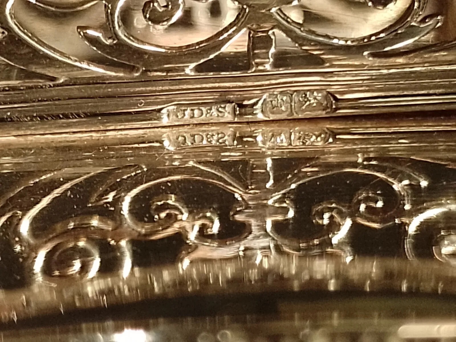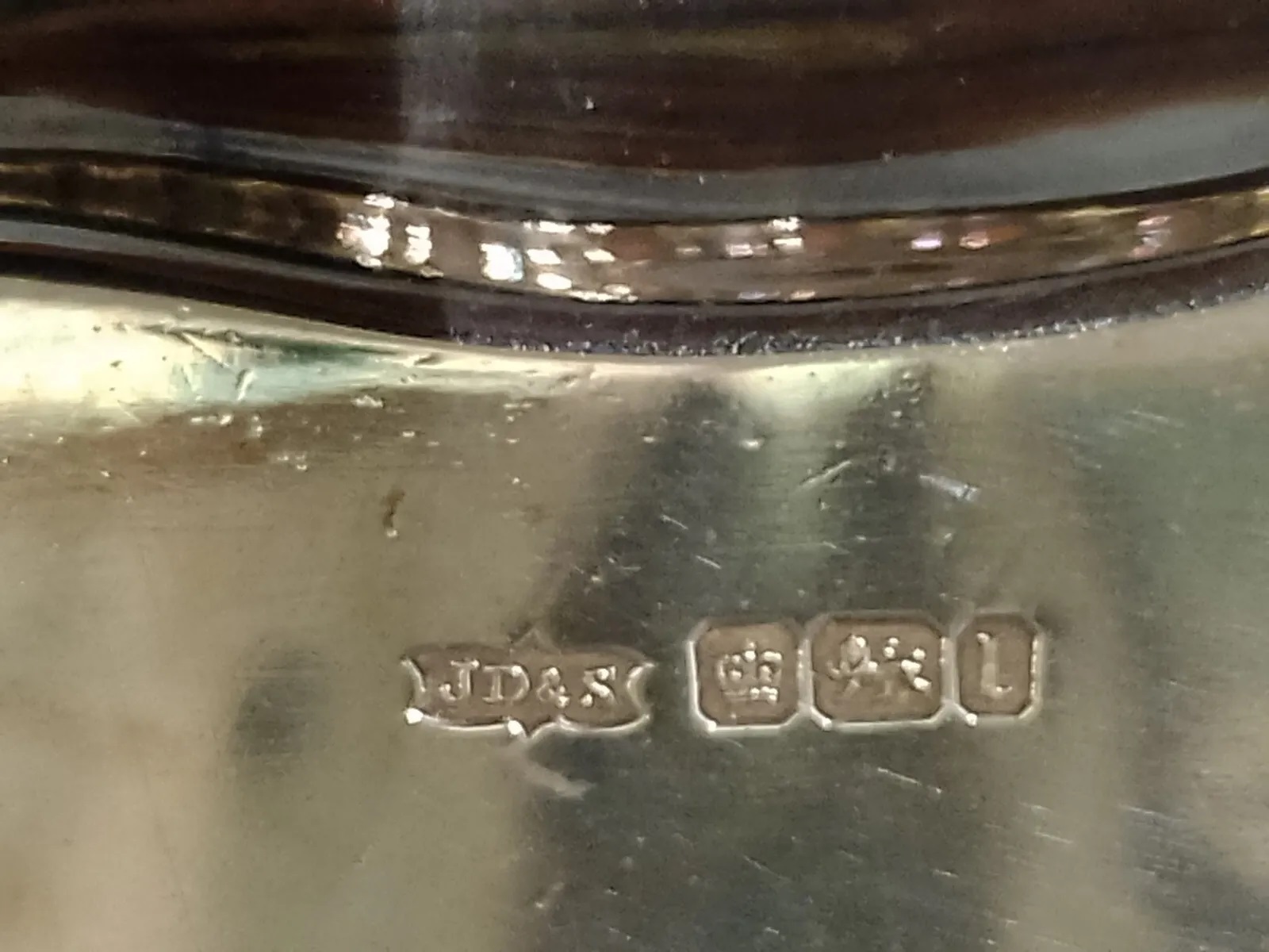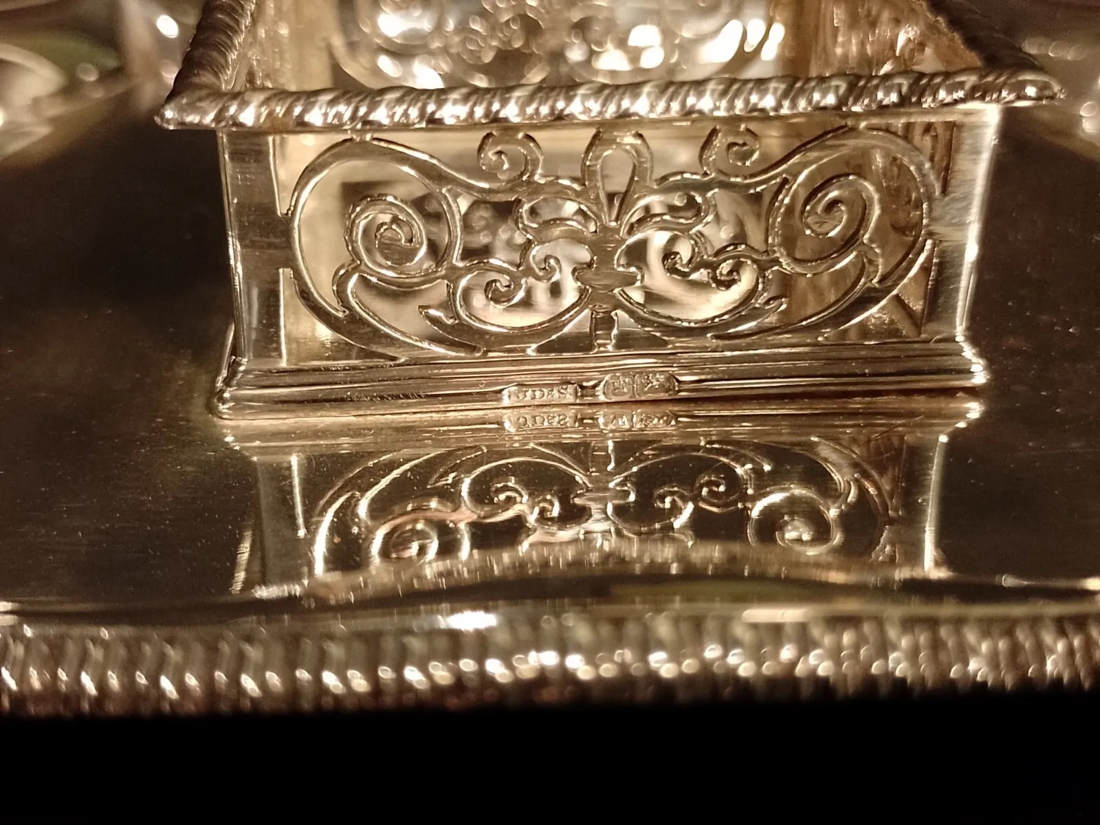 This inkstand sits on four out-swept beaded feet with a scalloped edge tray. In the center is a galleried platform to hold the glass inkwell with silver hallmarked fittings. The hallmarks are for James Dixon & Sons, Sheffield and Birmingham, date letter 1903.