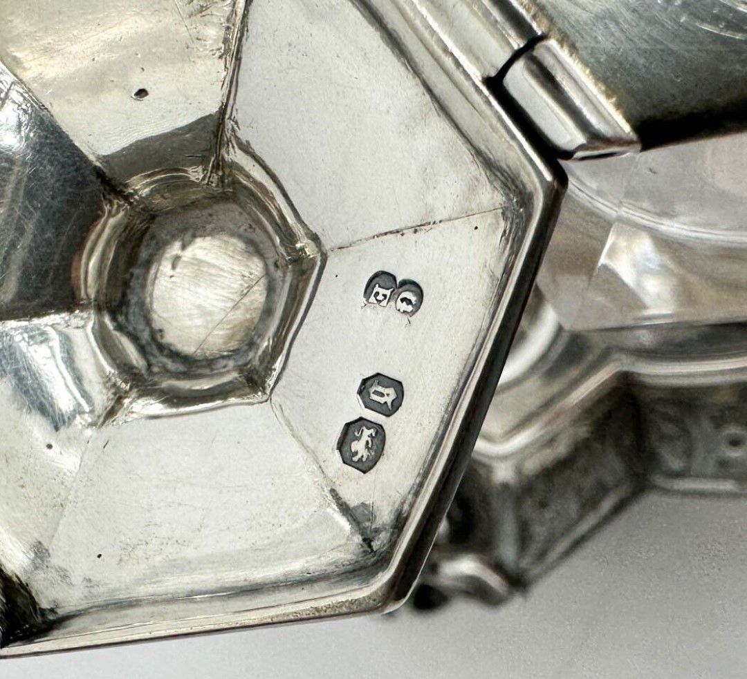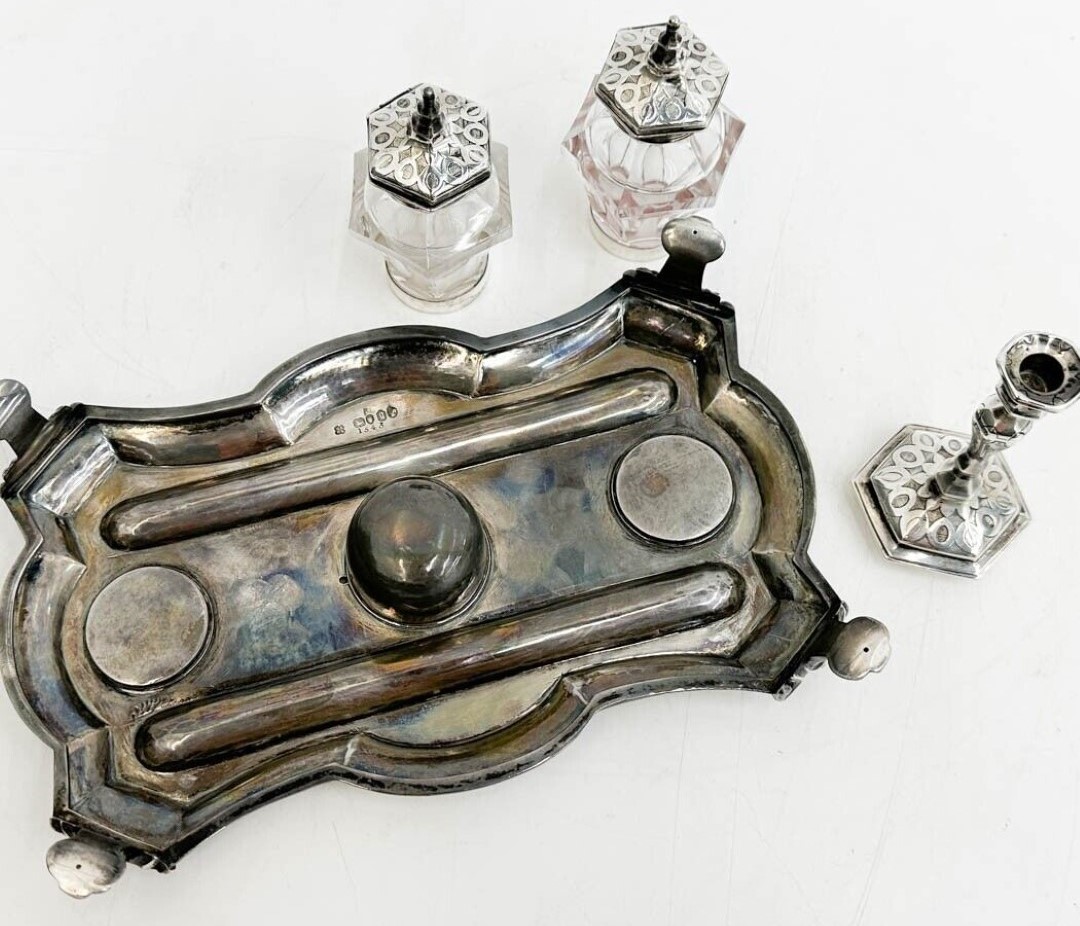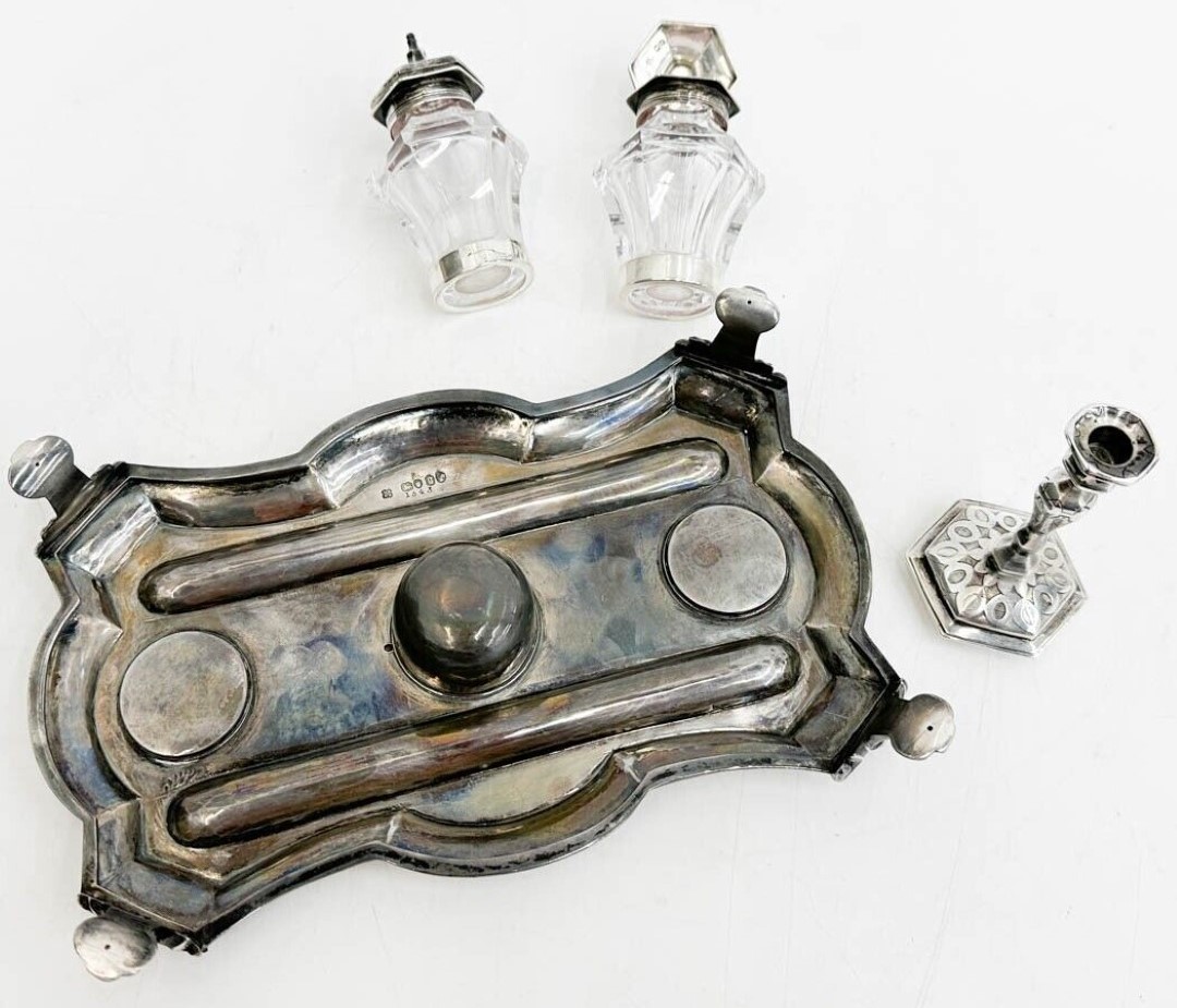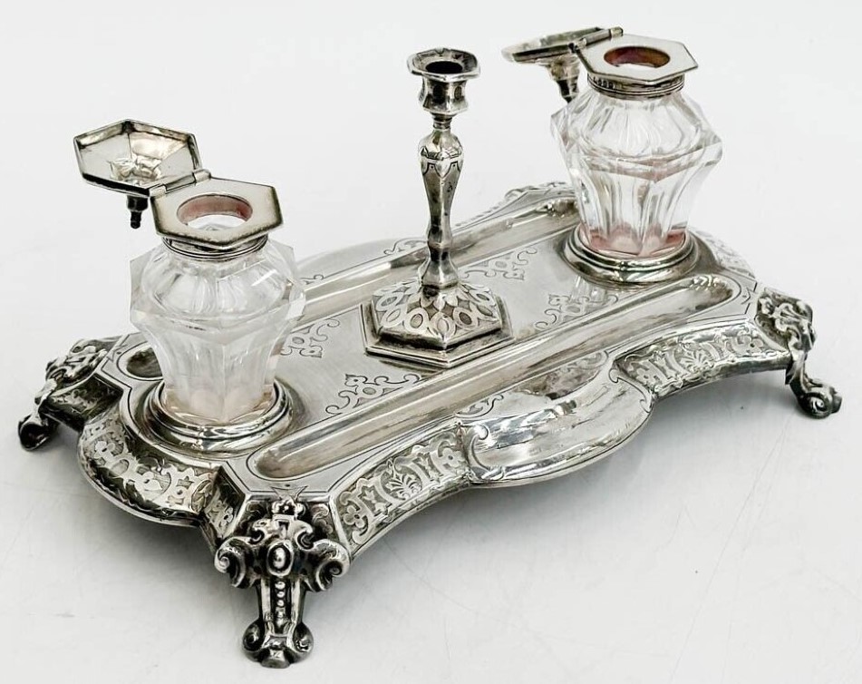 An English inkstand with twin glass inkwells with silver mounts and a candleholder. The inkstand bears hallmarks for George John Richards & Edward Charles Brown, dated 1862.