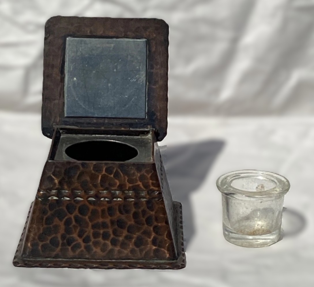 - Aesthetic and Style: The inkwell’s overall design, with its visible hammer marks and emphasis on a natural material like copper, is an example of the American Arts and Crafts movement. This style celebrated hand craftsmanship and rejected the ornate, mass-produced items of the Victorian era. The inkwell has the look of a Roycroft piece but is unmarked.