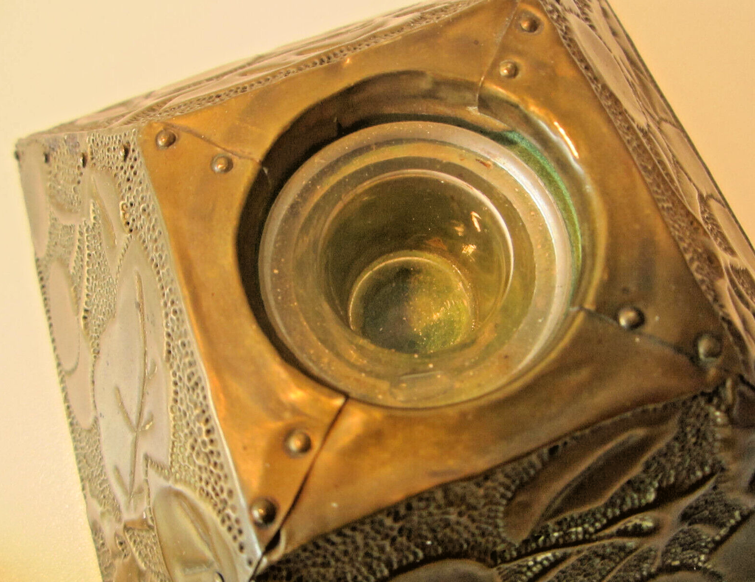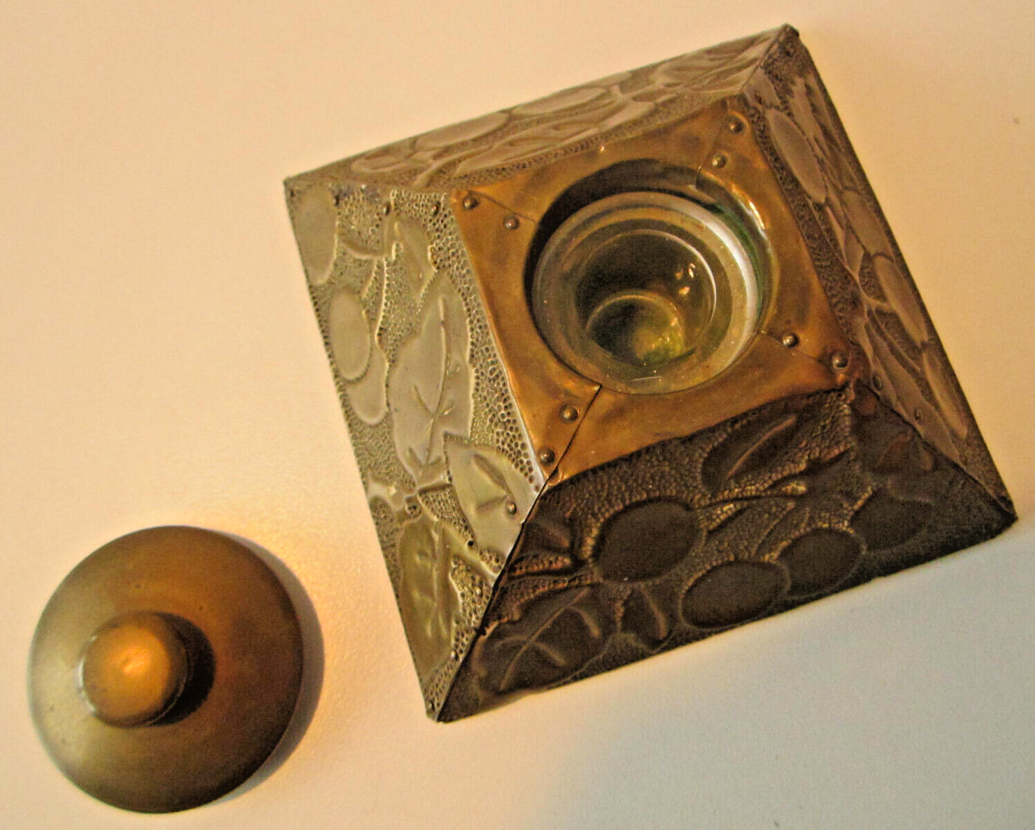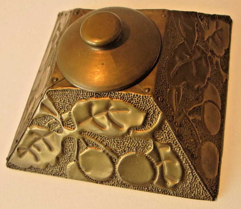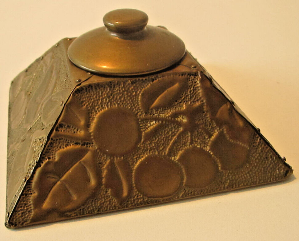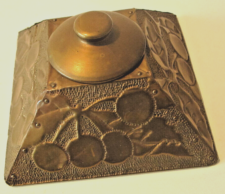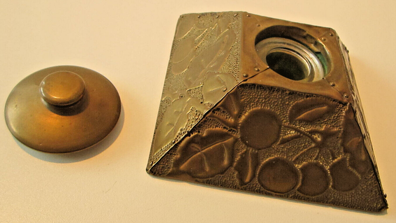 Four-sided pyramidal shaped inkwell with finely applied copper leaves and embossed cherries.