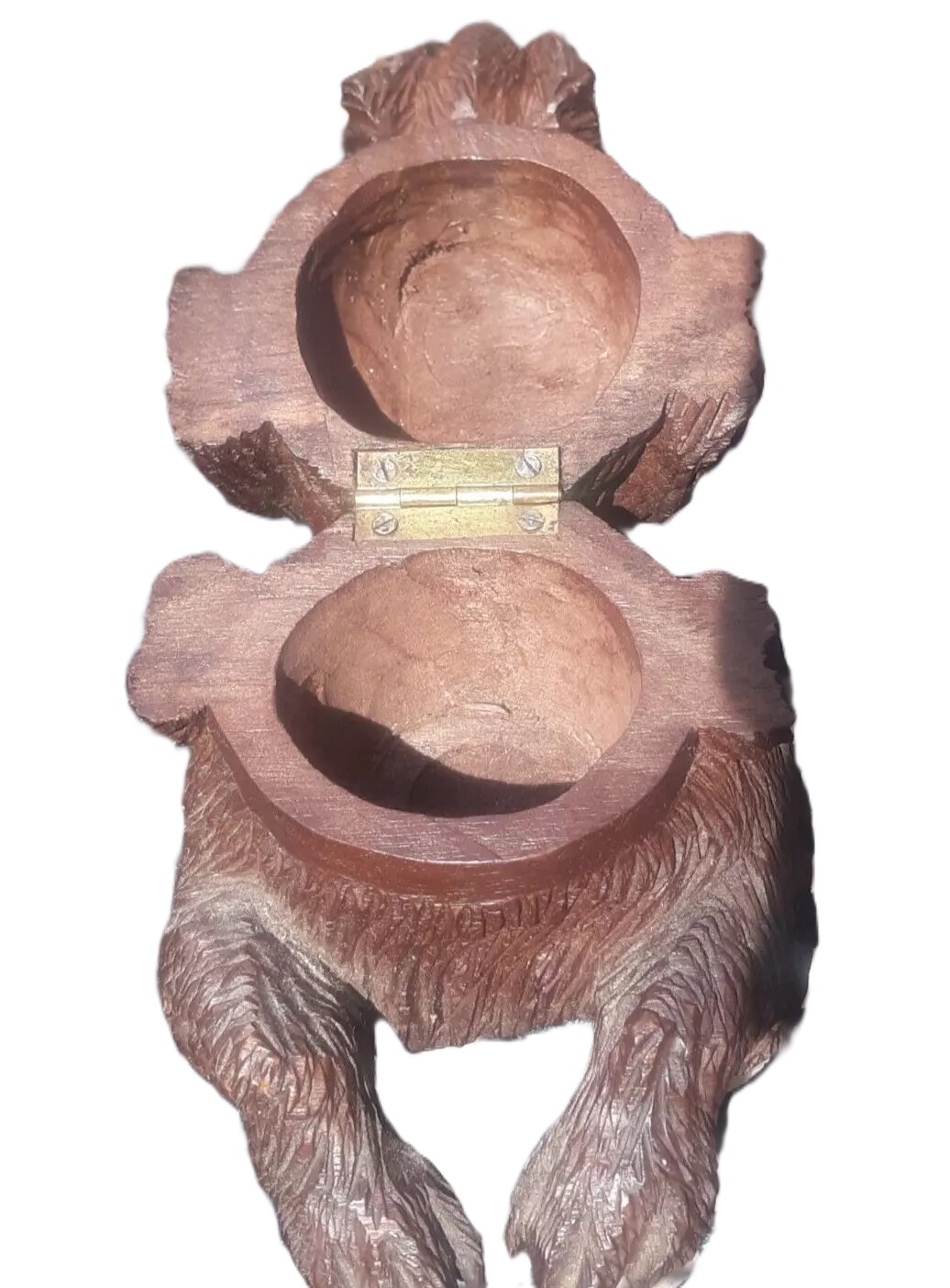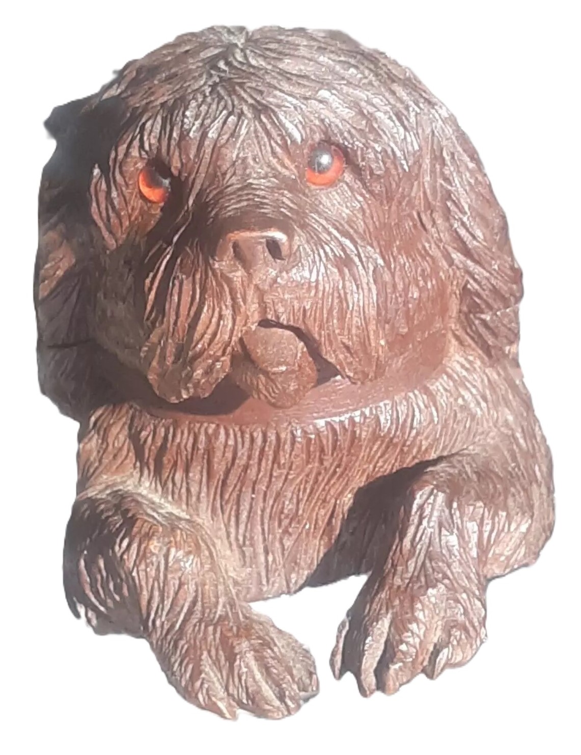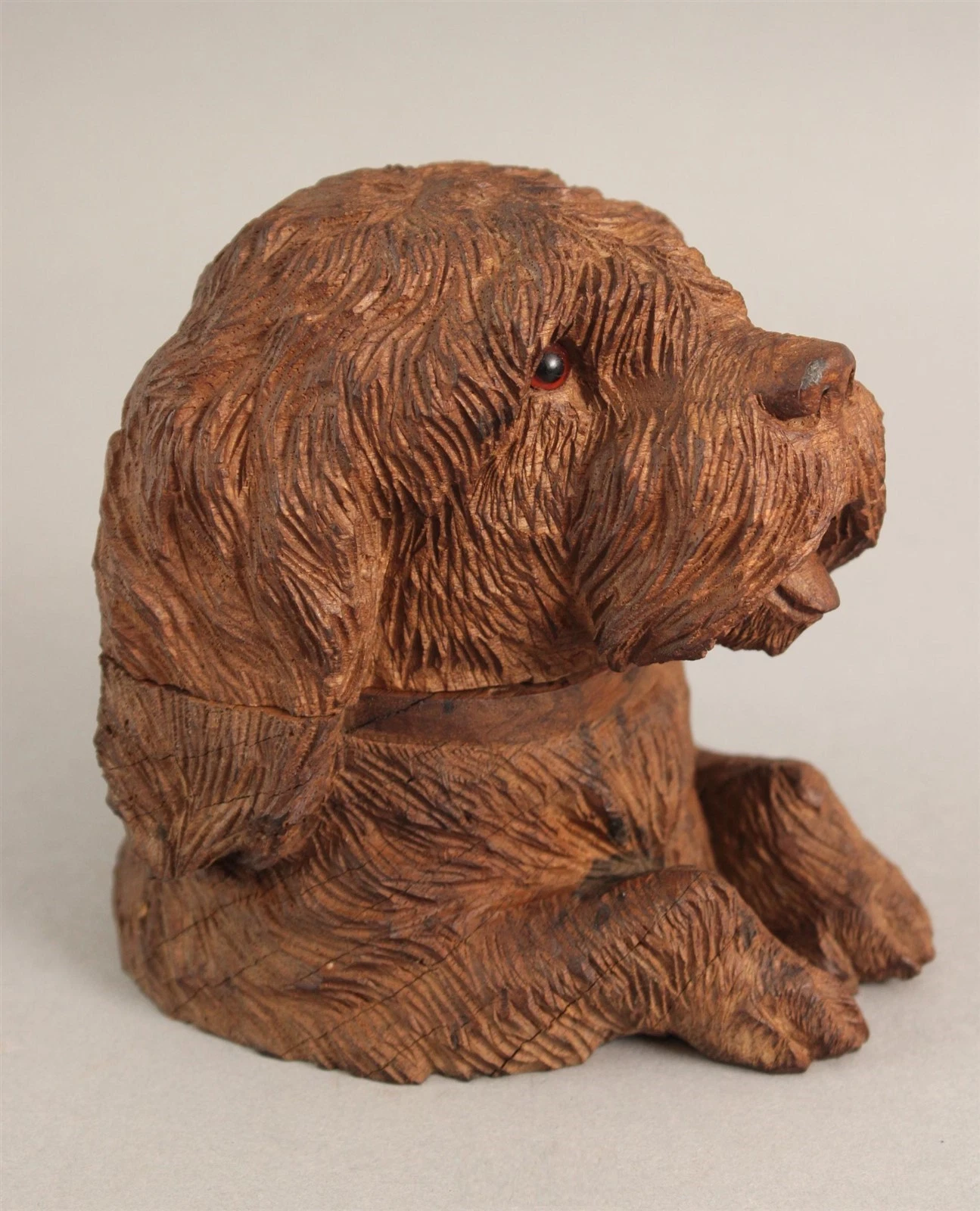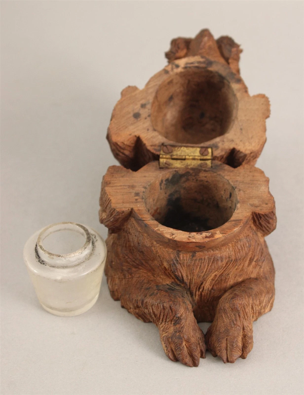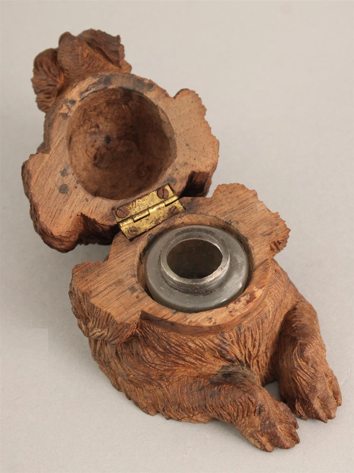 Black Forest hand-carved inkwell in the form of a dog’s upper body. The inkwell is intricately carved to resemble a dog, with detailed fur texture, panting tongue, and outstretched paws. The head of the dog is hinged and can be opened to access the ink compartment. Two examples are shown – one is missing the glass insert. The dog has amber glass eyes.