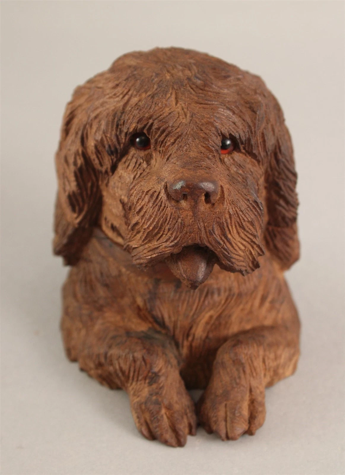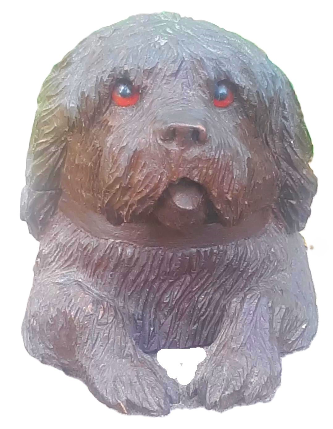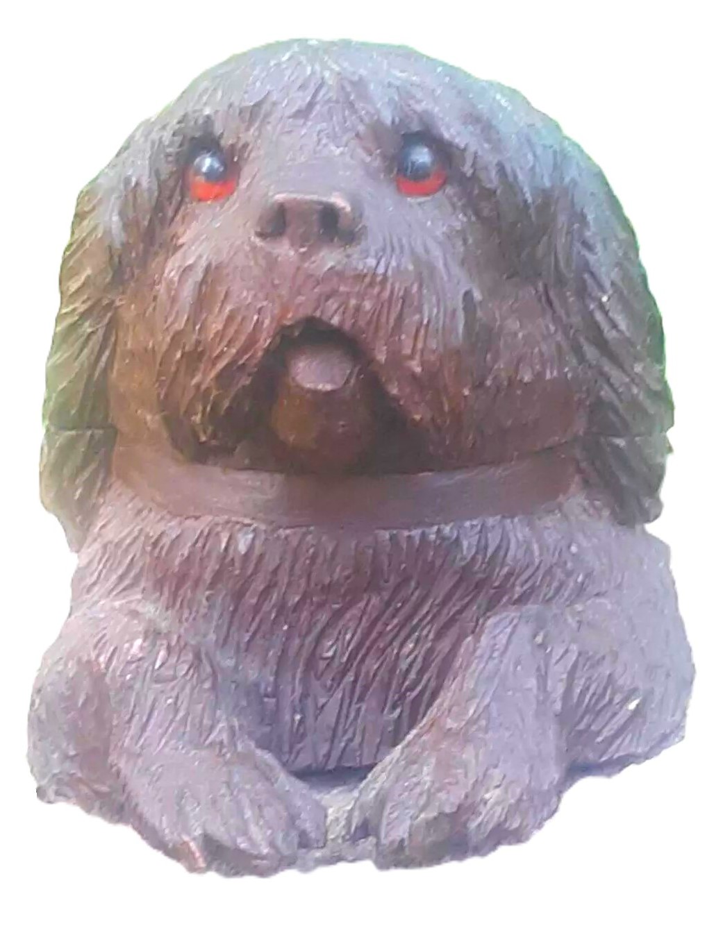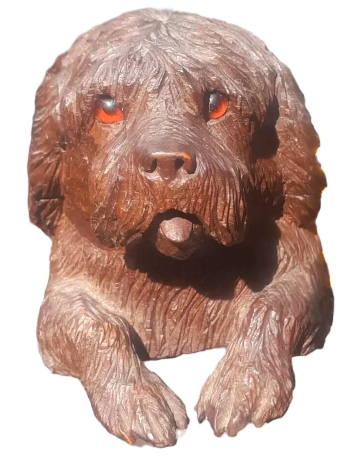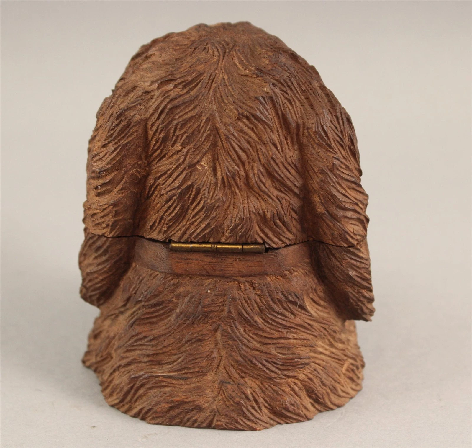 Black Forest hand-carved inkwell in the form of a dog’s upper body. The inkwell is intricately carved to resemble a dog, with detailed fur texture, panting tongue, and outstretched paws. The head of the dog is hinged and can be opened to access the ink compartment. Two examples are shown – one is missing the glass insert. The dog has amber glass eyes.