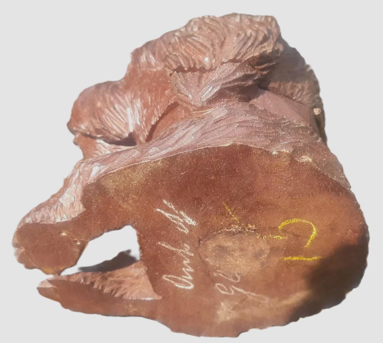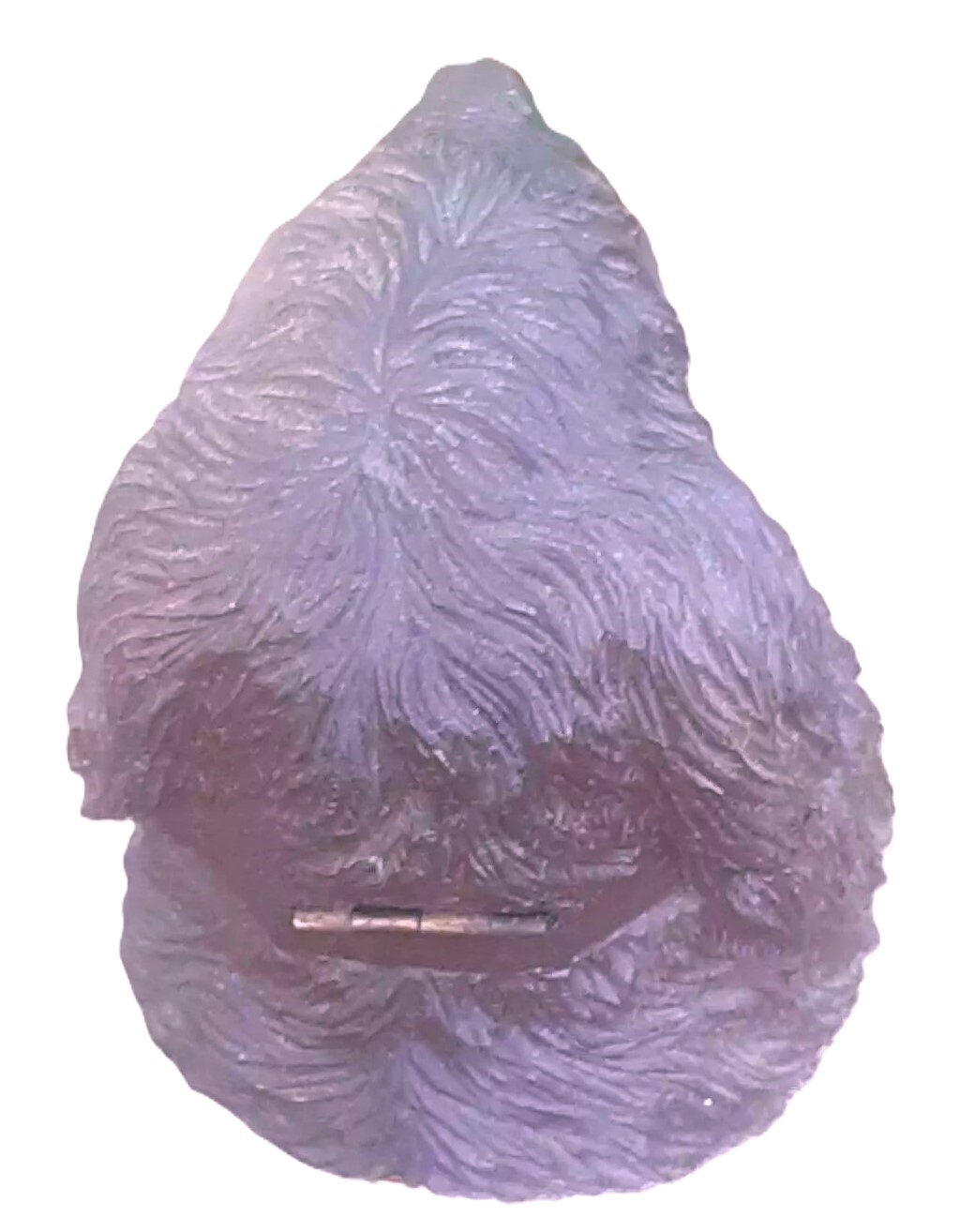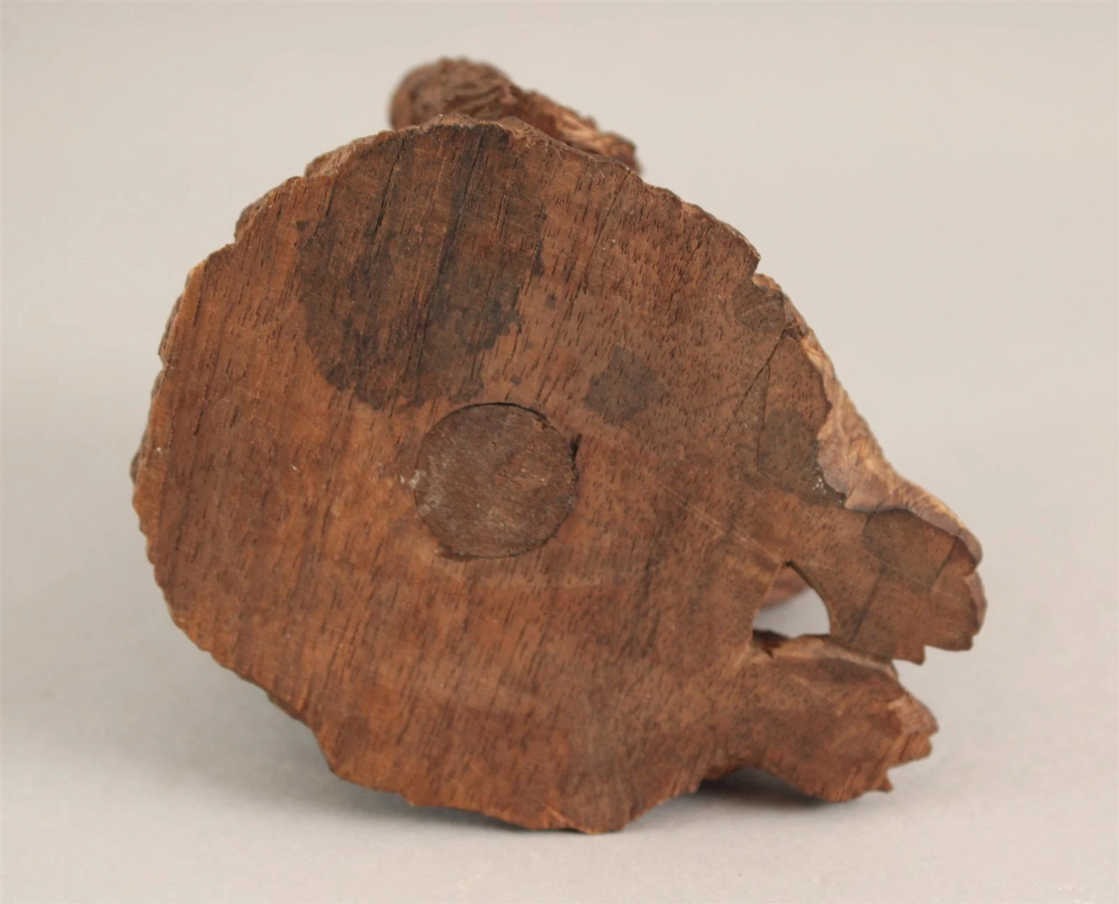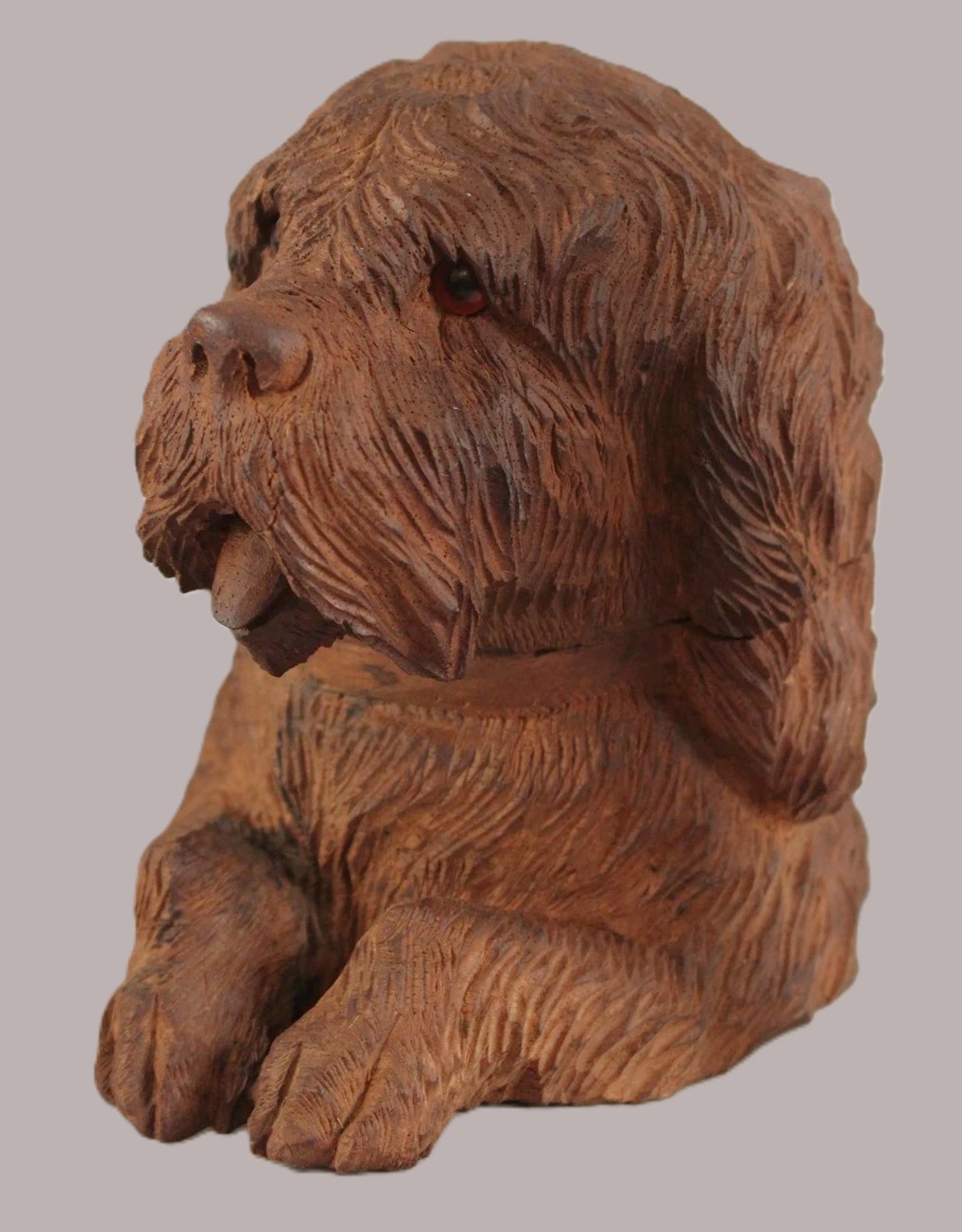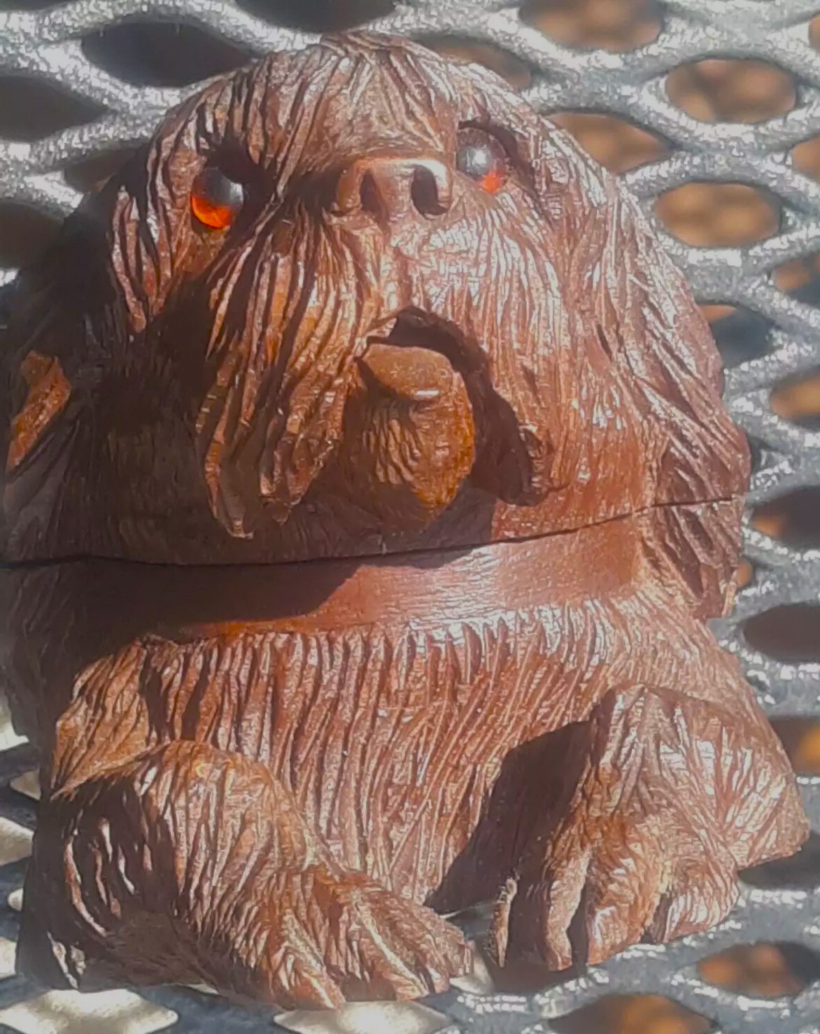Black Forest hand-carved inkwell in the form of a dog’s upper body. The inkwell is intricately carved to resemble a dog, with detailed fur texture, panting tongue, and outstretched paws. The head of the dog is hinged and can be opened to access the ink compartment. Two examples are shown – one is missing the glass insert. The dog has amber glass eyes.