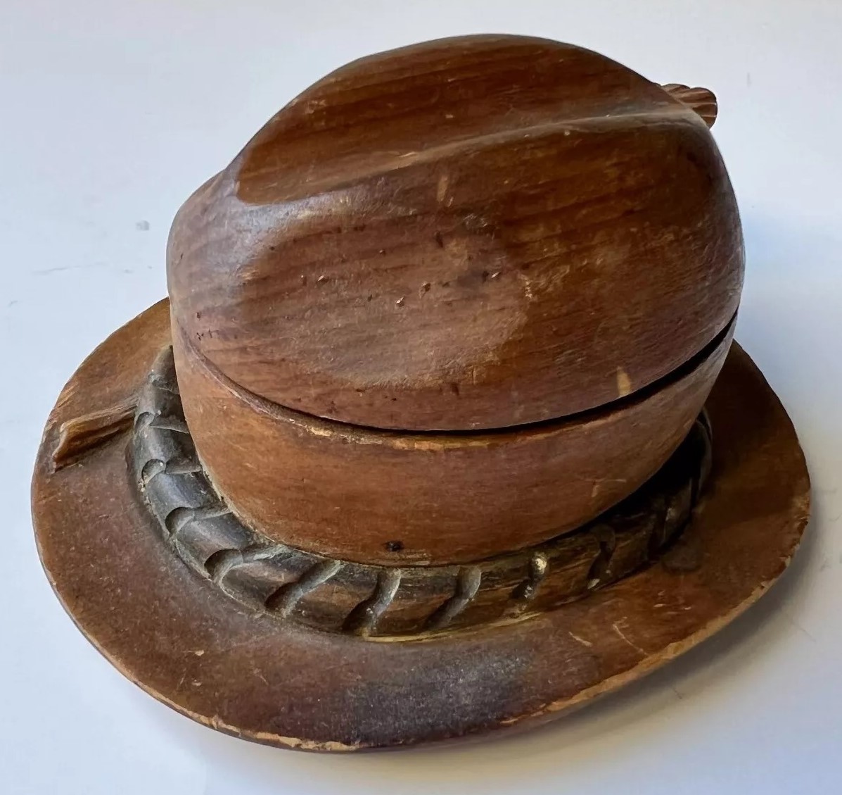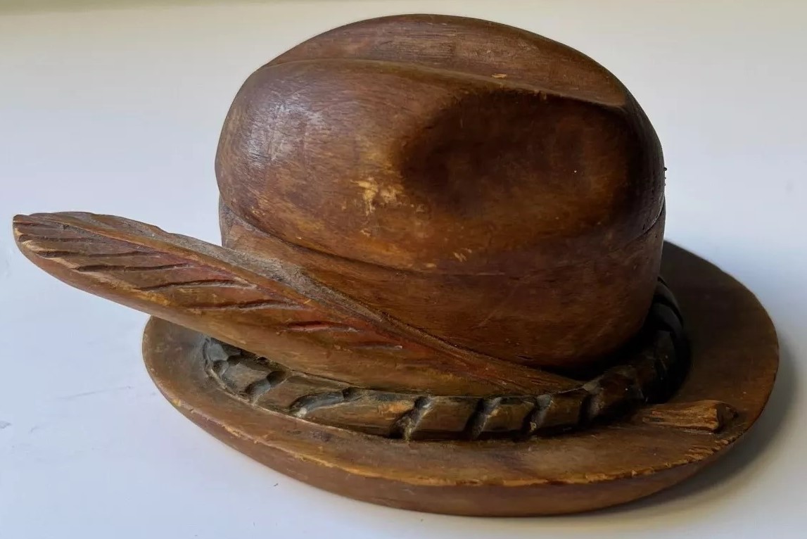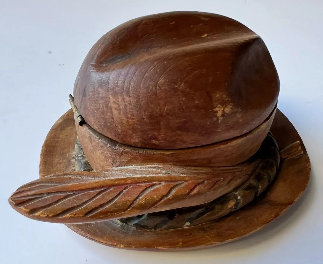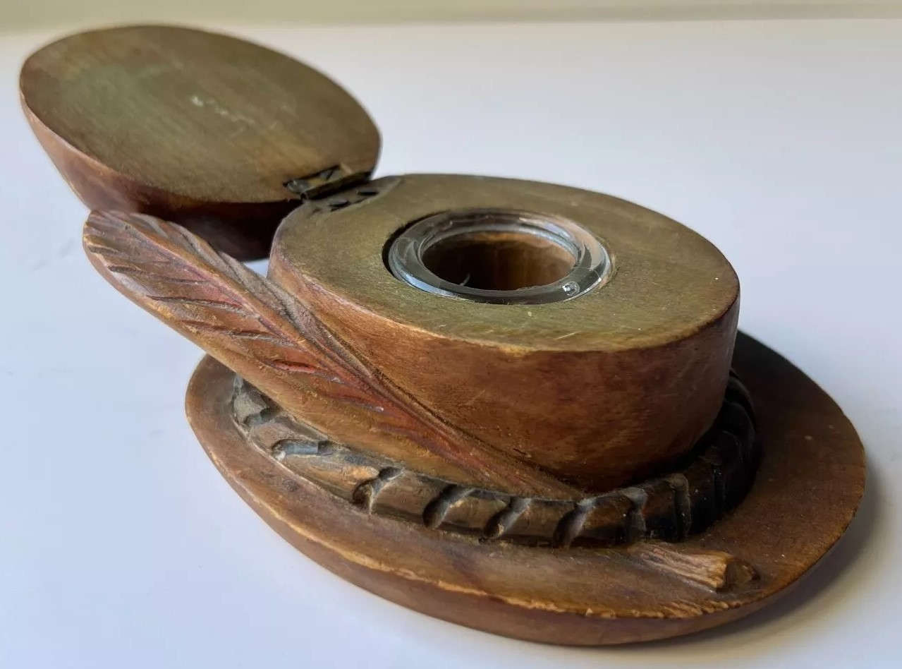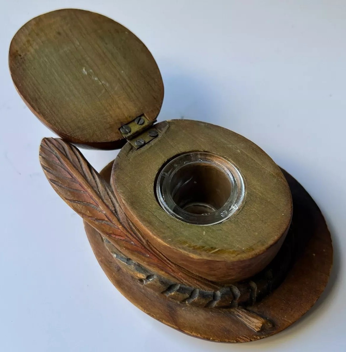 This hand-carved Black Forest inkwell is designed to resemble a traditional Alpine or Bavarian hat. The hat features a wide brim and a band around the base of the crown, which is intricately carved to mimic a braided or twisted texture. There’s also a feather protruding from the band. The “dent” at the top of the crown serves as a place to rest a pen. The upper half of the hat is hinged, allowing it to open and reveal the inkwell inside.