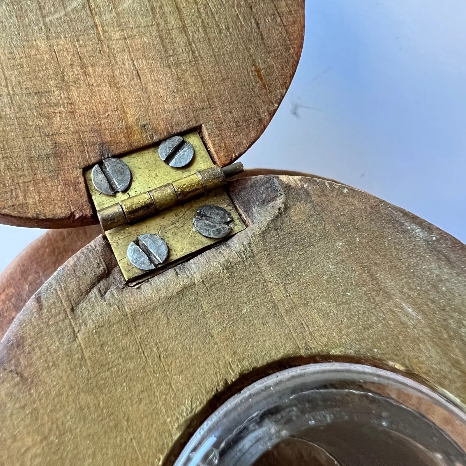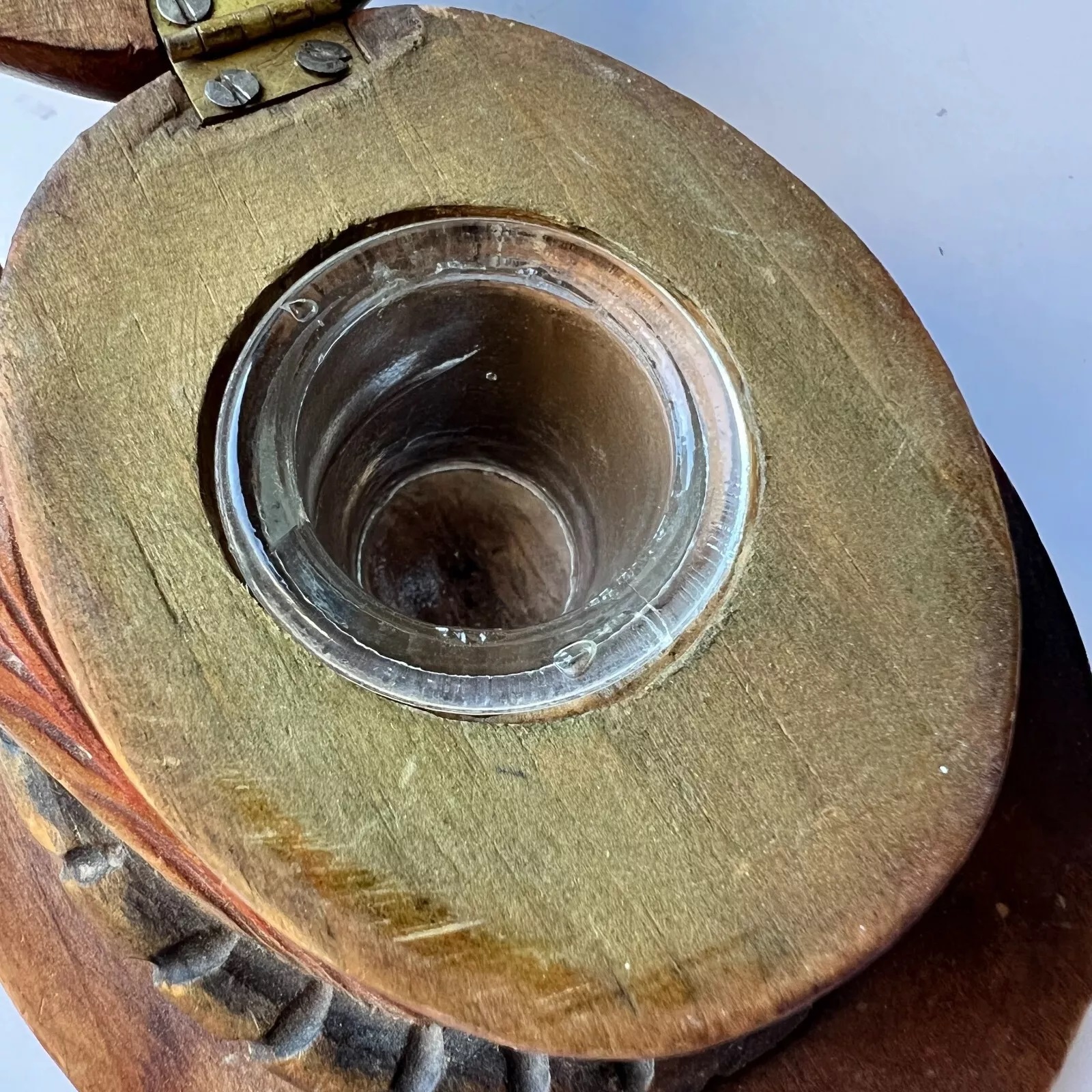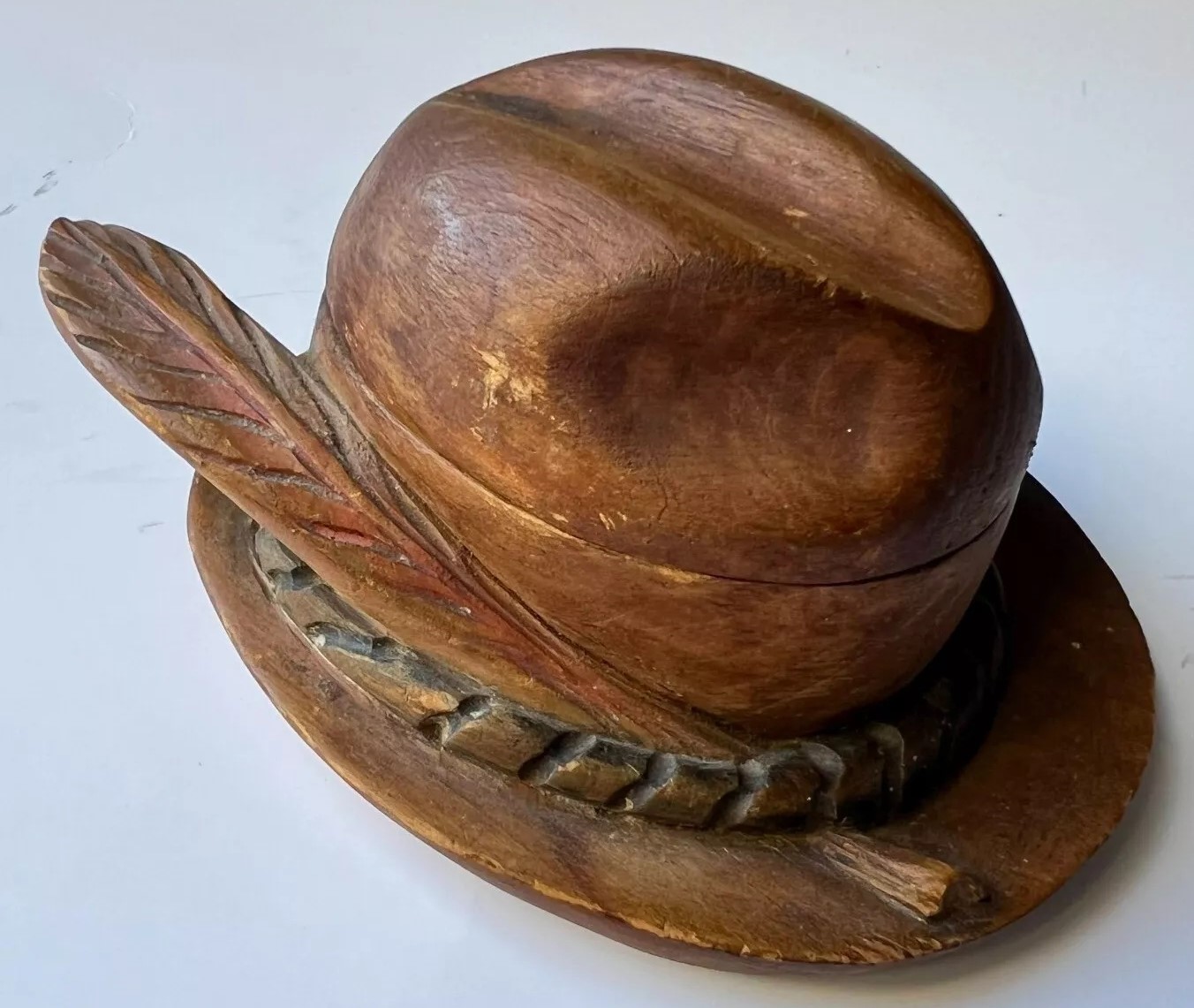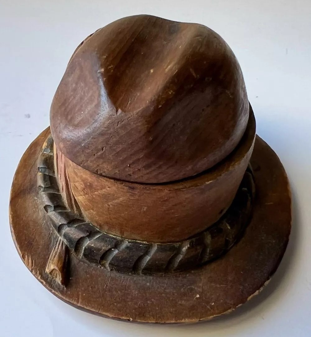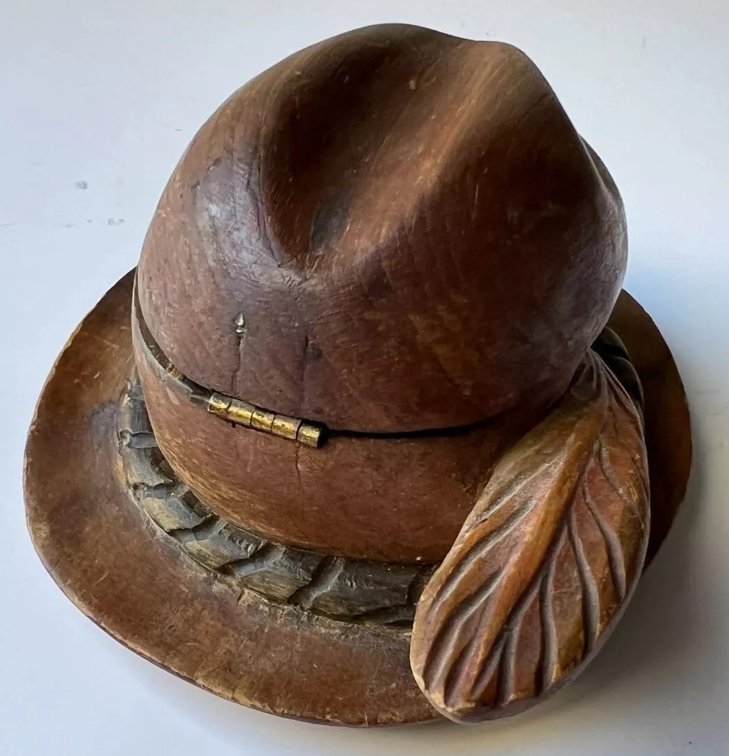 This hand-carved Black Forest inkwell is designed to resemble a traditional Alpine or Bavarian hat. The hat features a wide brim and a band around the base of the crown, which is intricately carved to mimic a braided or twisted texture. There’s also a feather protruding from the band. The “dent” at the top of the crown serves as a place to rest a pen. The upper half of the hat is hinged, allowing it to open and reveal the inkwell inside.