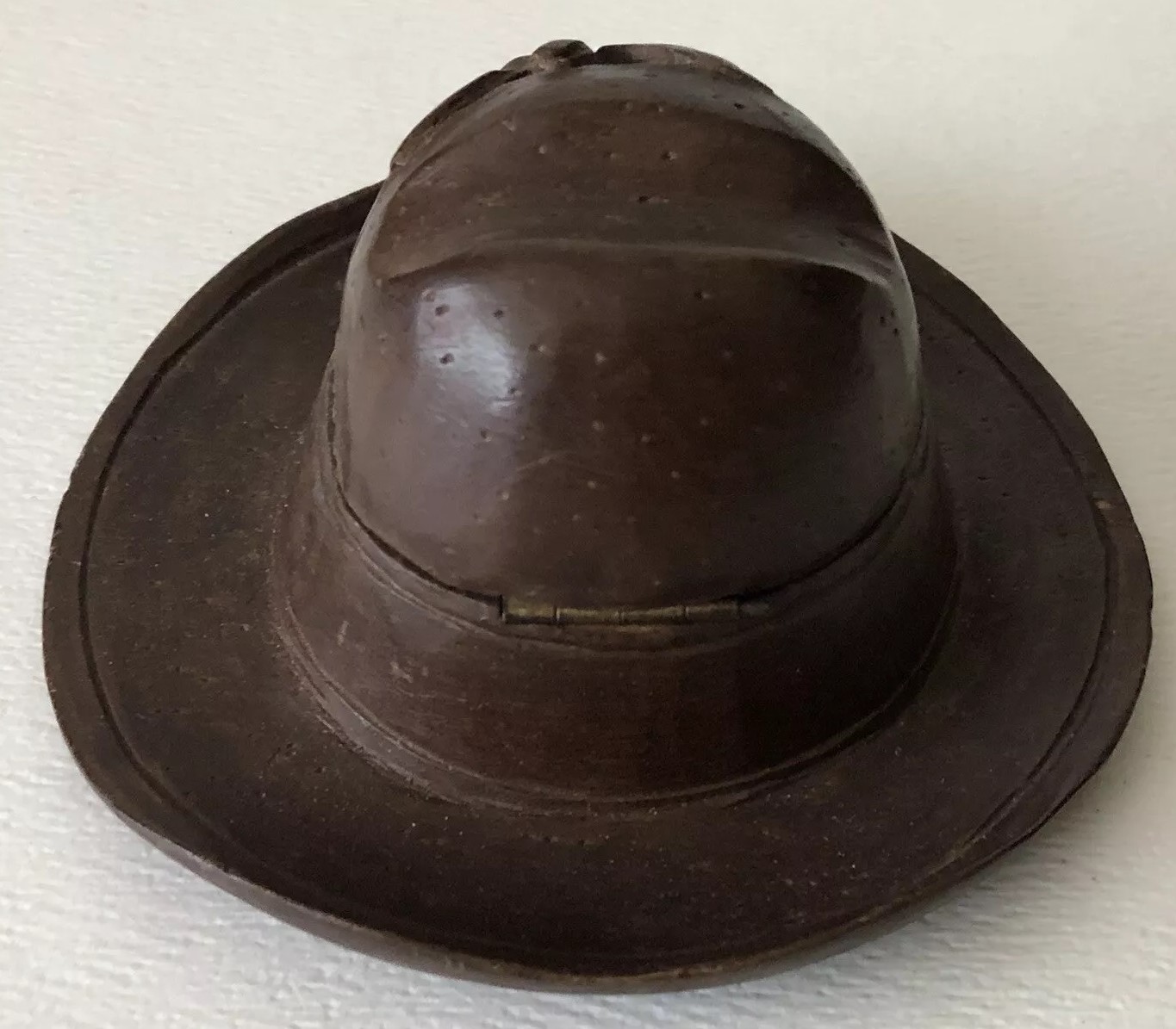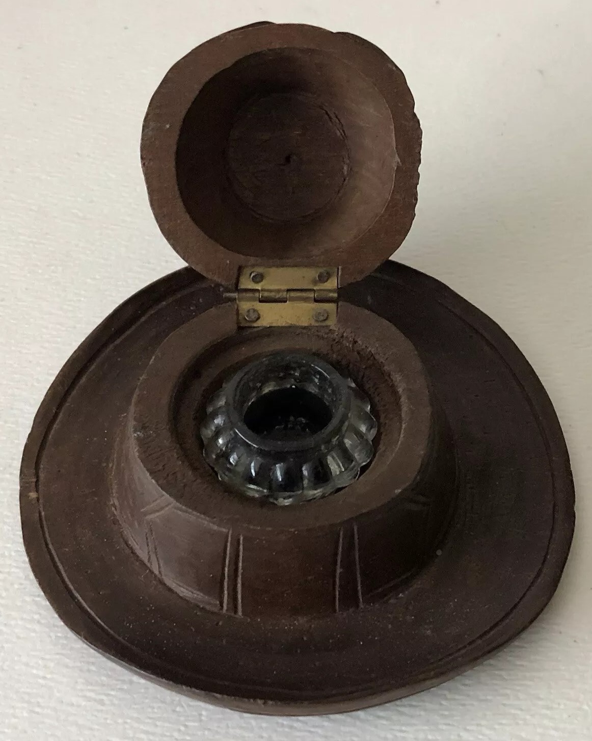 This hand-carved Black Forest inkwell is carved to mimic a hat, complete with a wide brim that curves upward at the edges. The crown of the hat features a detailed carved floral design. The upper half of the hat is hinged, allowing it to open and reveal the inkwell inside. The “pitch” or “dent” at the top of the hat not only adds to the hat’s realistic appearance but also serves a functional purpose, as it can be used to rest a pen.