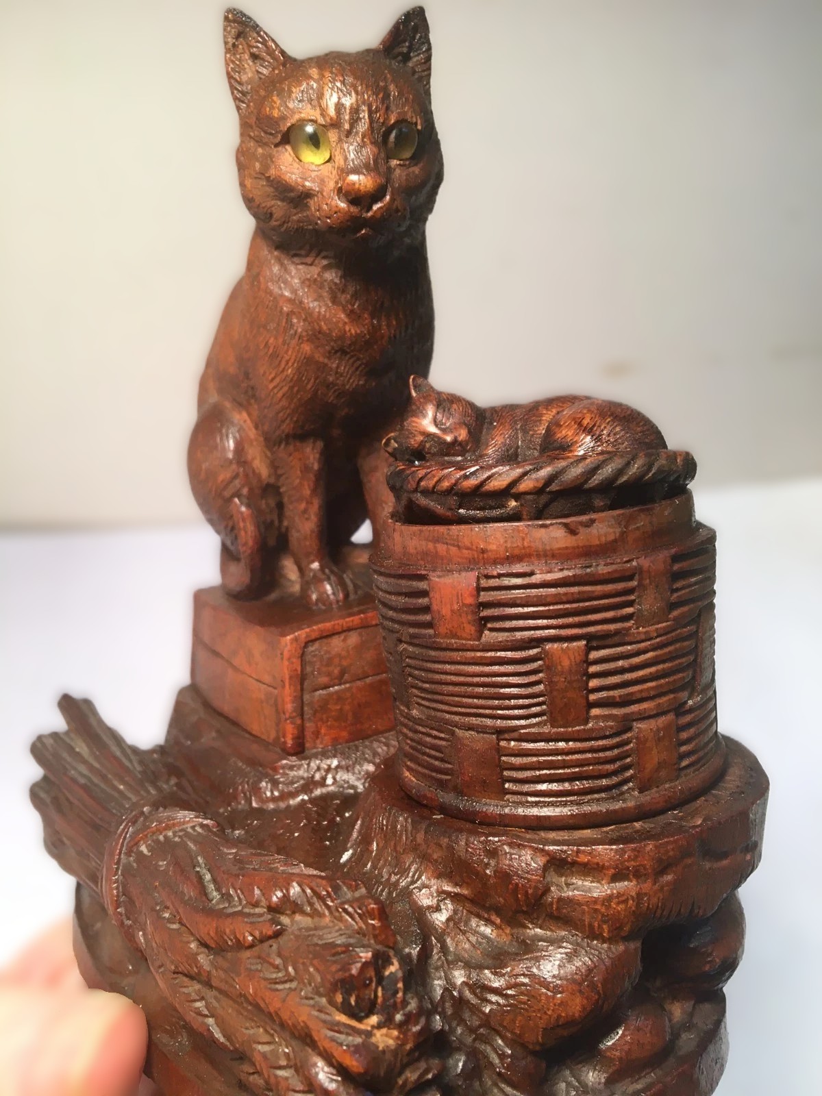 • Overall Form: A figural inkstand carved to depict an intimate domestic scene: a mother cat watching over her sleeping kitten all resting on a cushioned bed.