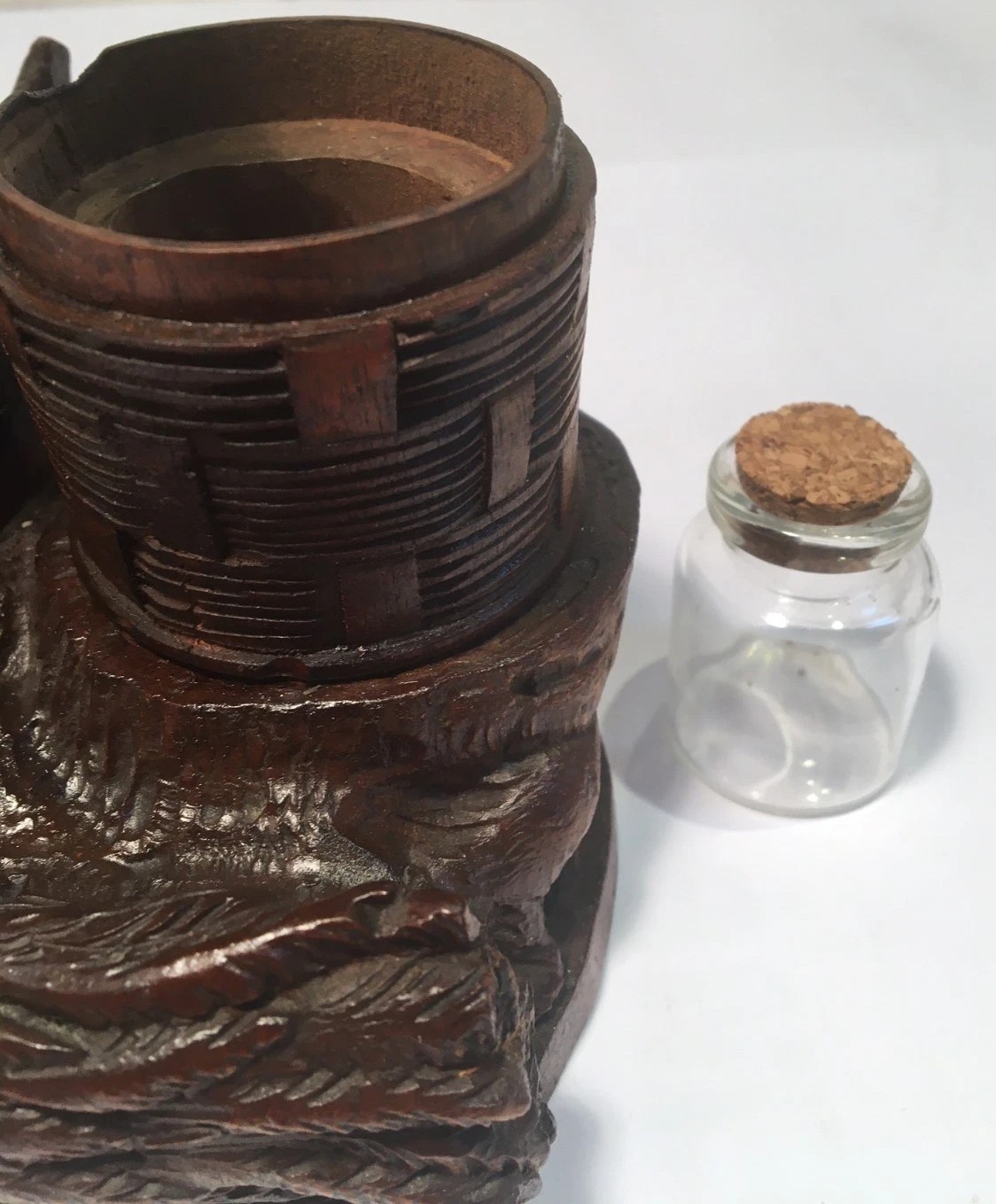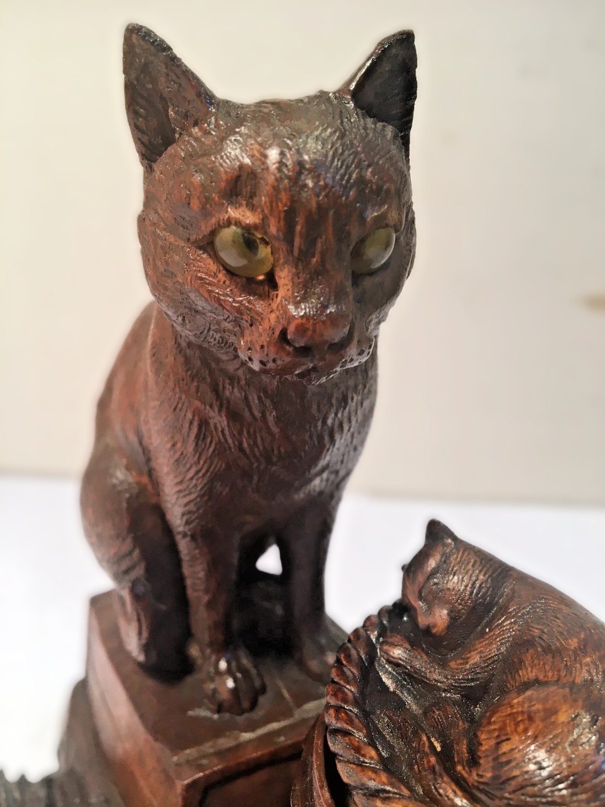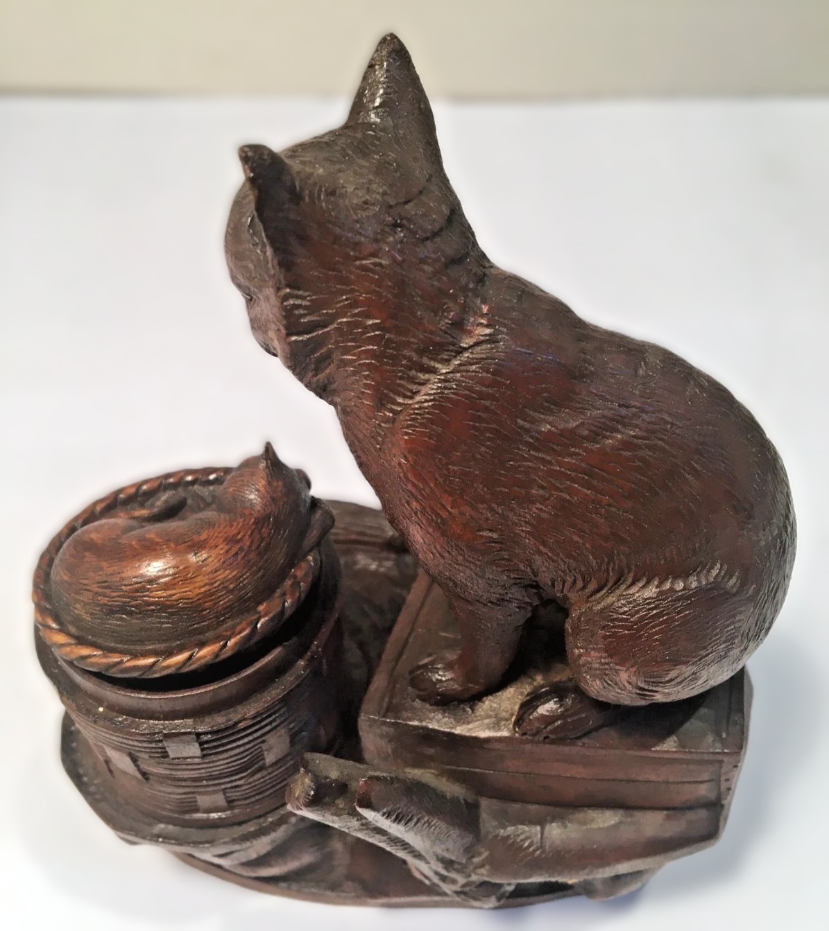 • Inkwell Mechanism: The functional element is concealed under the kitten. The kitten lifts to access the inkwell. This may originally have been hinged. Inside is a glass inkwell, but not original to the piece.