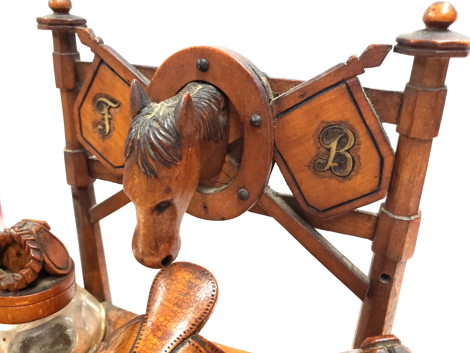 This is a Late Victorian hand-carved equestrian inkstand, dating to approximately 1885. While it has the intricate, naturalistic style often associated with the “Black Forest” carvings of Switzerland and Germany, this specific design is a classic example of English sporting art from the late 19th century, celebrating country estate life.