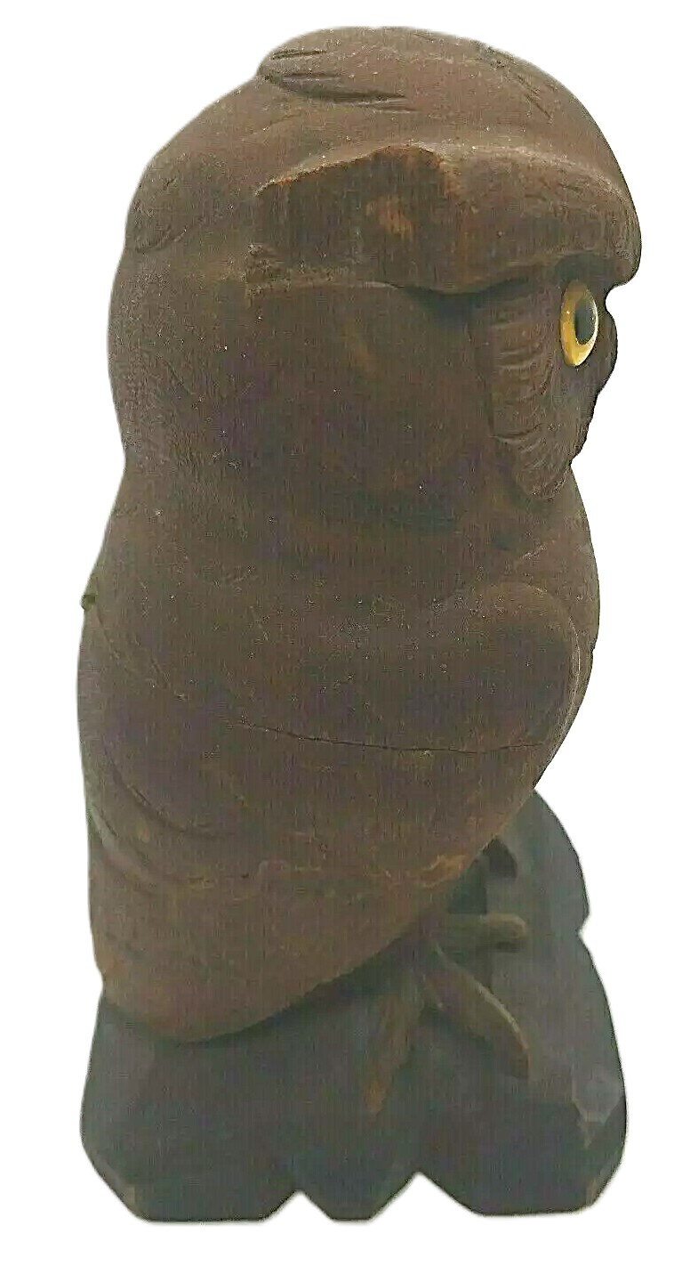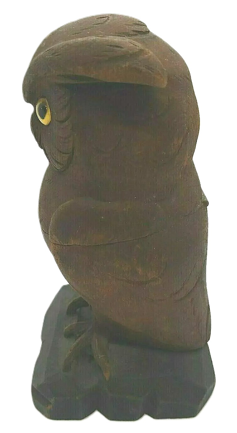 This hand-carved wooden owl showcases detailing in its feathers and facial features. The owl has striking, round glass eyes that are yellow with black pupils. It stands on a base designed to resemble a cluster of rocks.