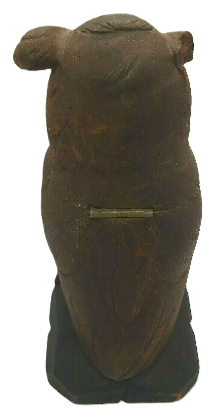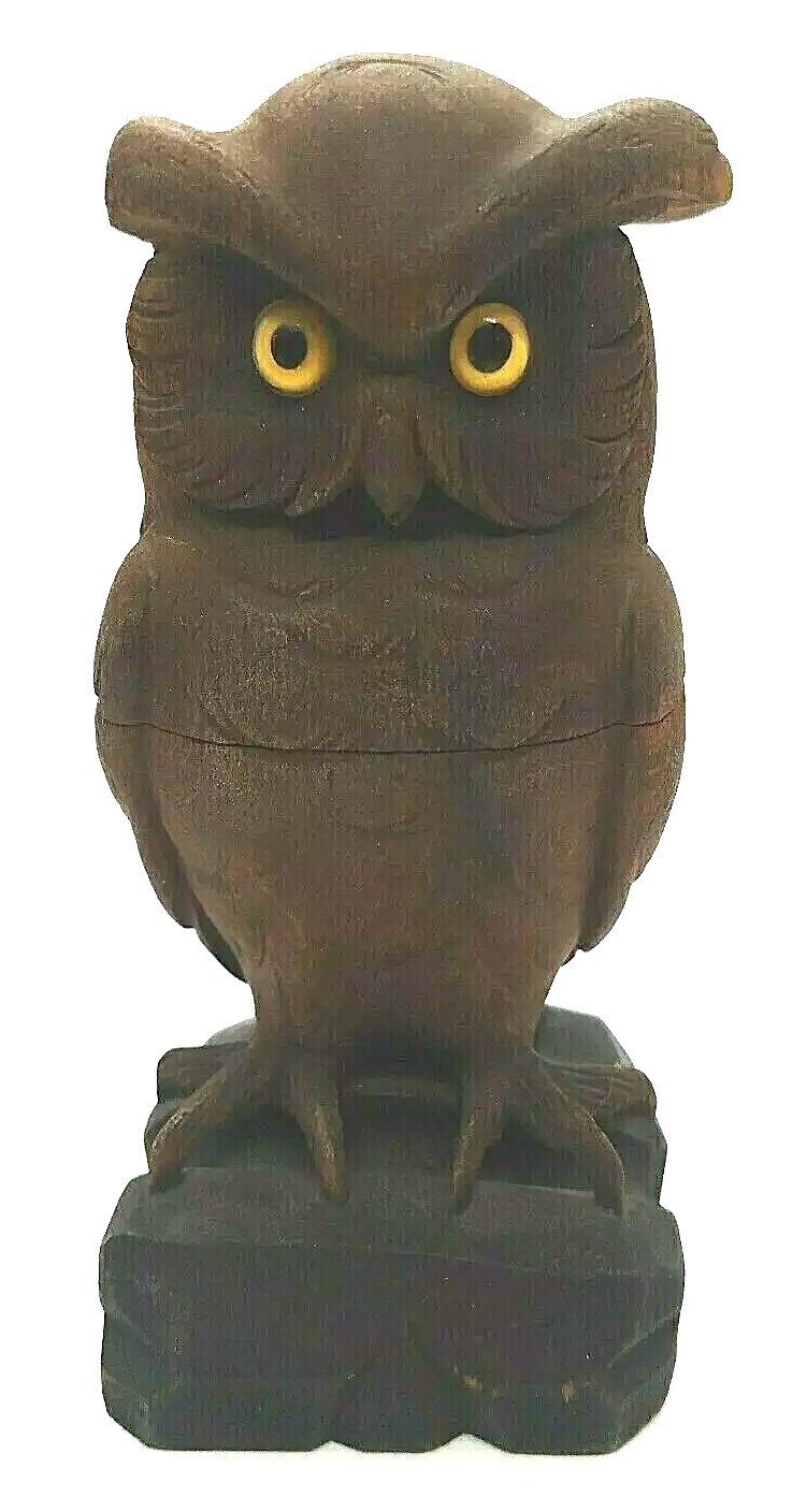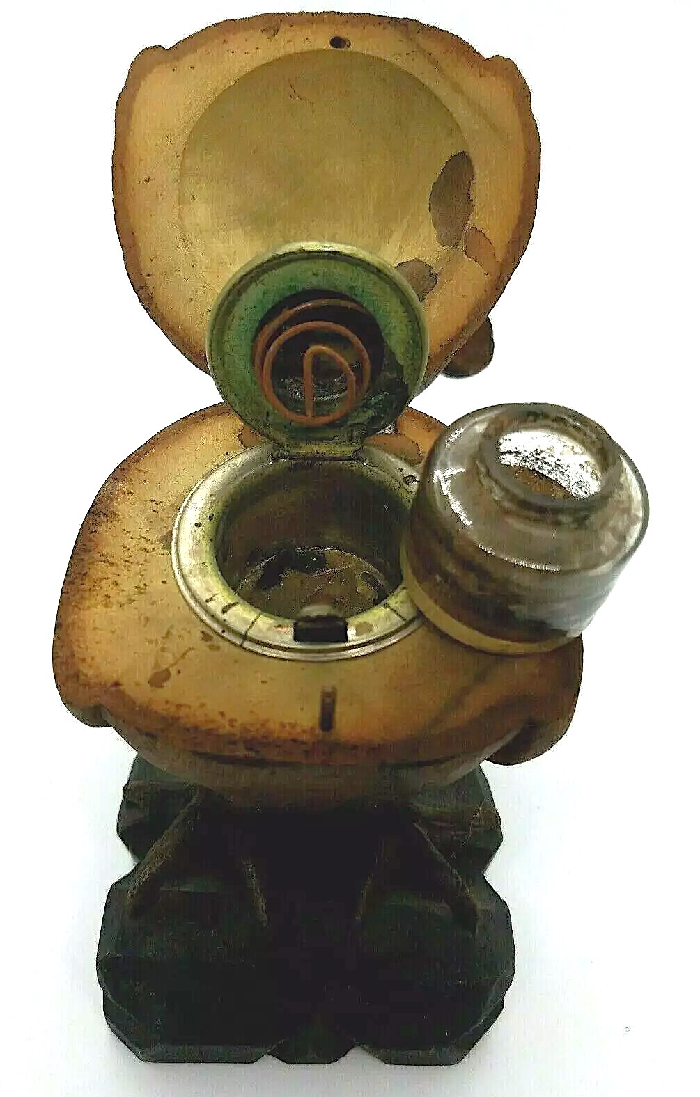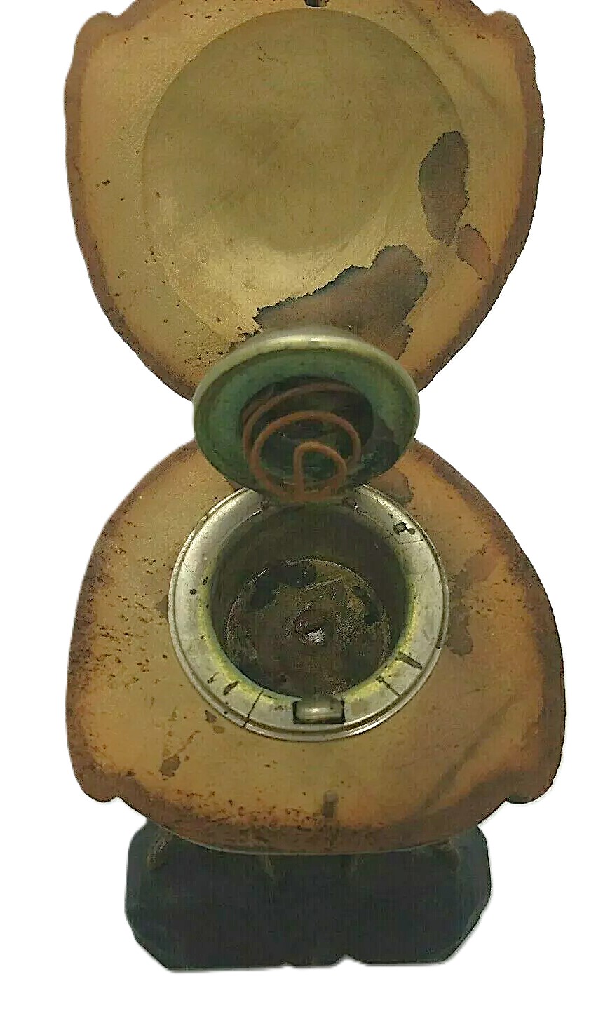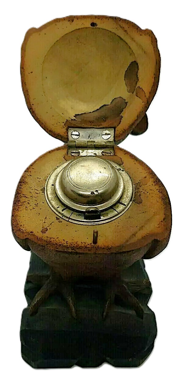 The owl’s head is hinged, allowing it to open and reveal a hidden compartment inside. This compartment houses a glass inkwell, which is covered by a spring-loaded lid to keep the ink secure and prevent it from drying out.