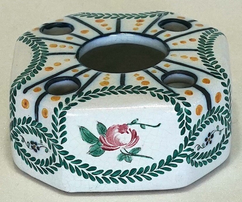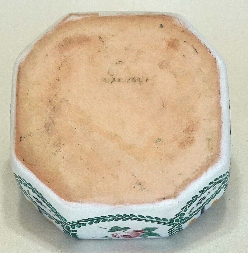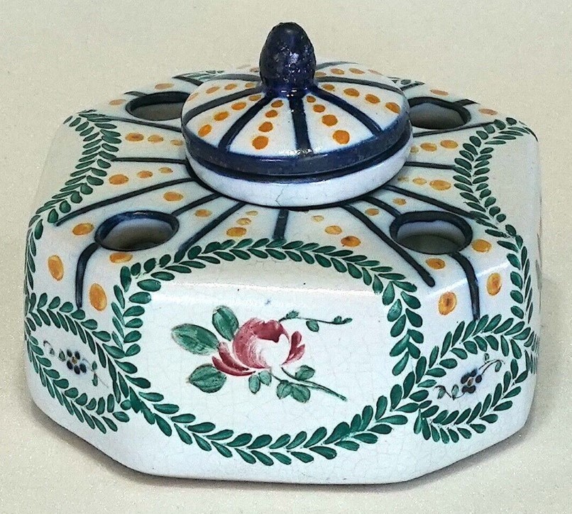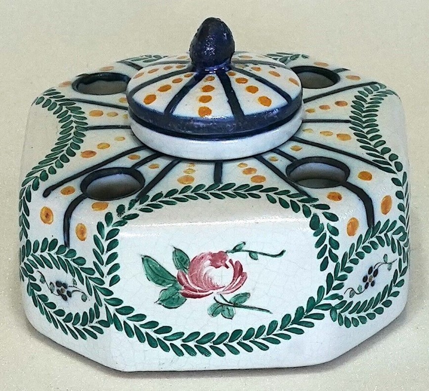 Eight-sided French faience inkwell or encrier, hand painted in white, green, blue, and orange accenting pink roses on four sides. Crazing has occurred throughout the ink pot insert.