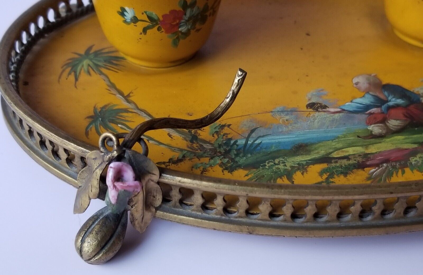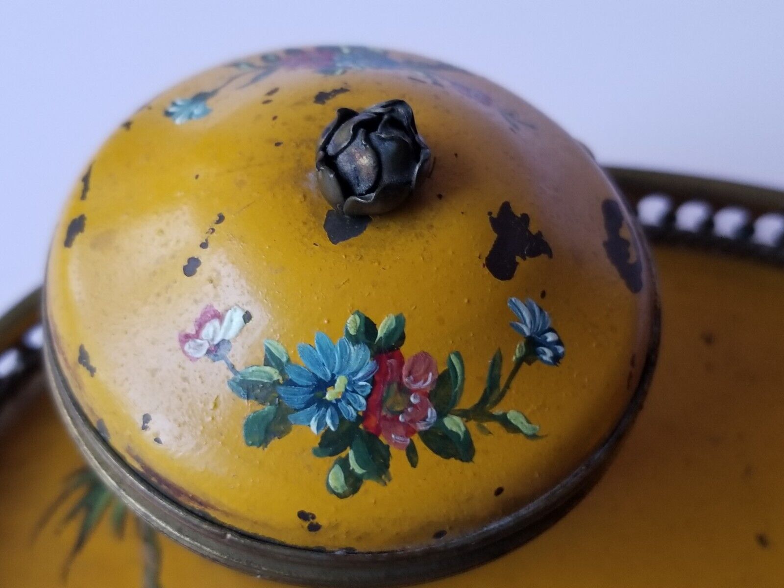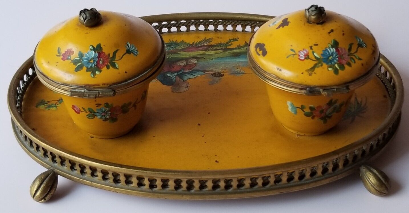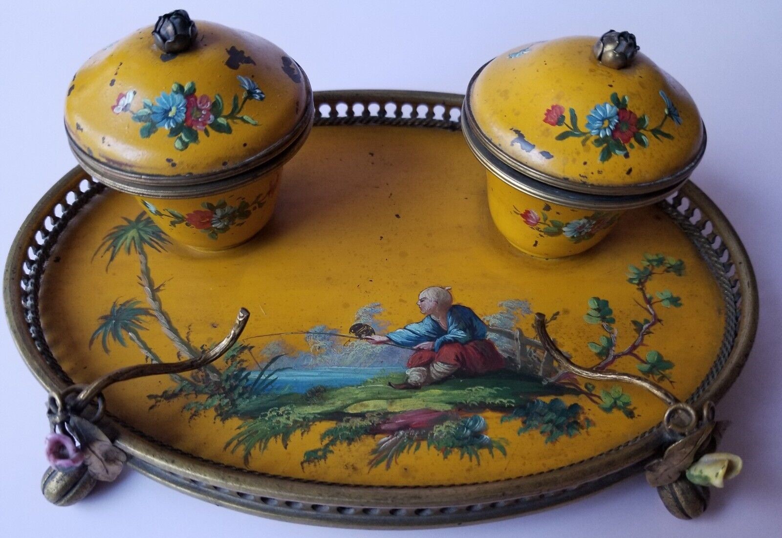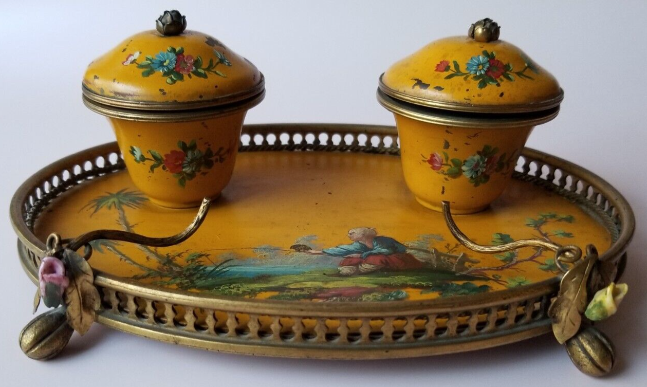 Double inkstand featuring enamel paint over metal. Each end of the pen holder is in the form of a branch with a rose bud. The finials on the hinged inkwell lids are formed as a rose.