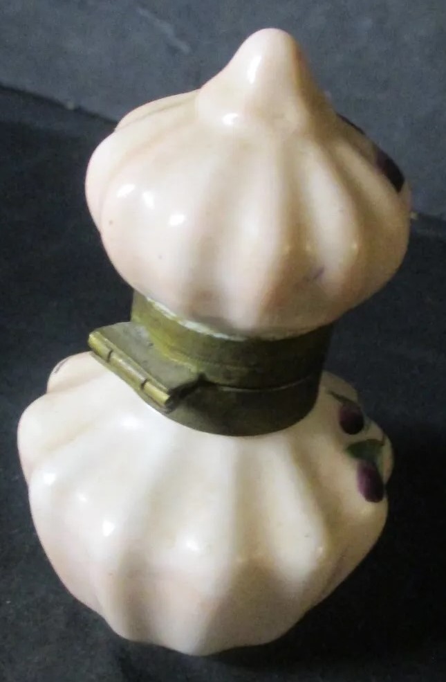 A porcelain inkwell with hand painted floral decoration (columbine?) and a ribbed dome lid with brass mounting.