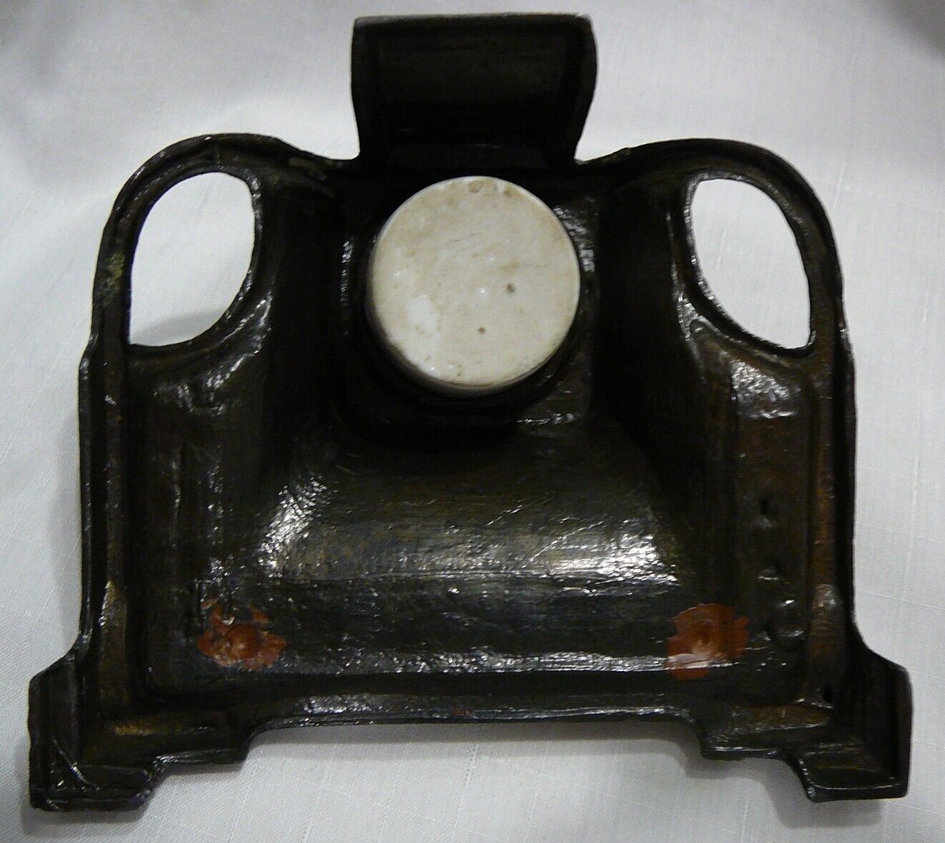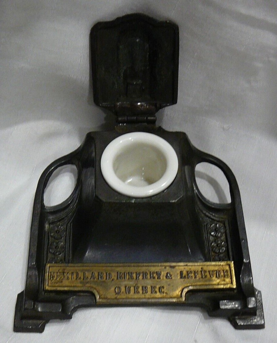 This inkwell advertises Rémillard, Rinfret & Lefèvre, founders of a Company of Import and General Trade in 1920, in Québec City, Canada. In front of the Inkwell is a bronze plaque marked ”Rémillard, Rinfret & Lefèvre”.