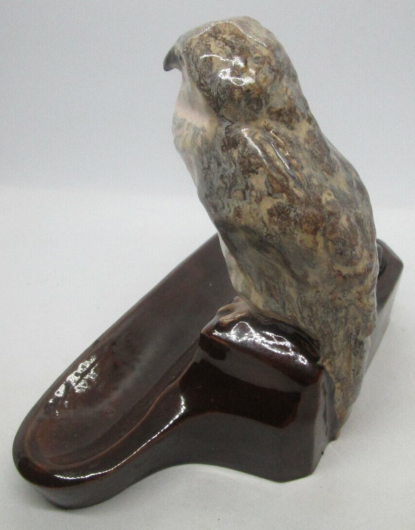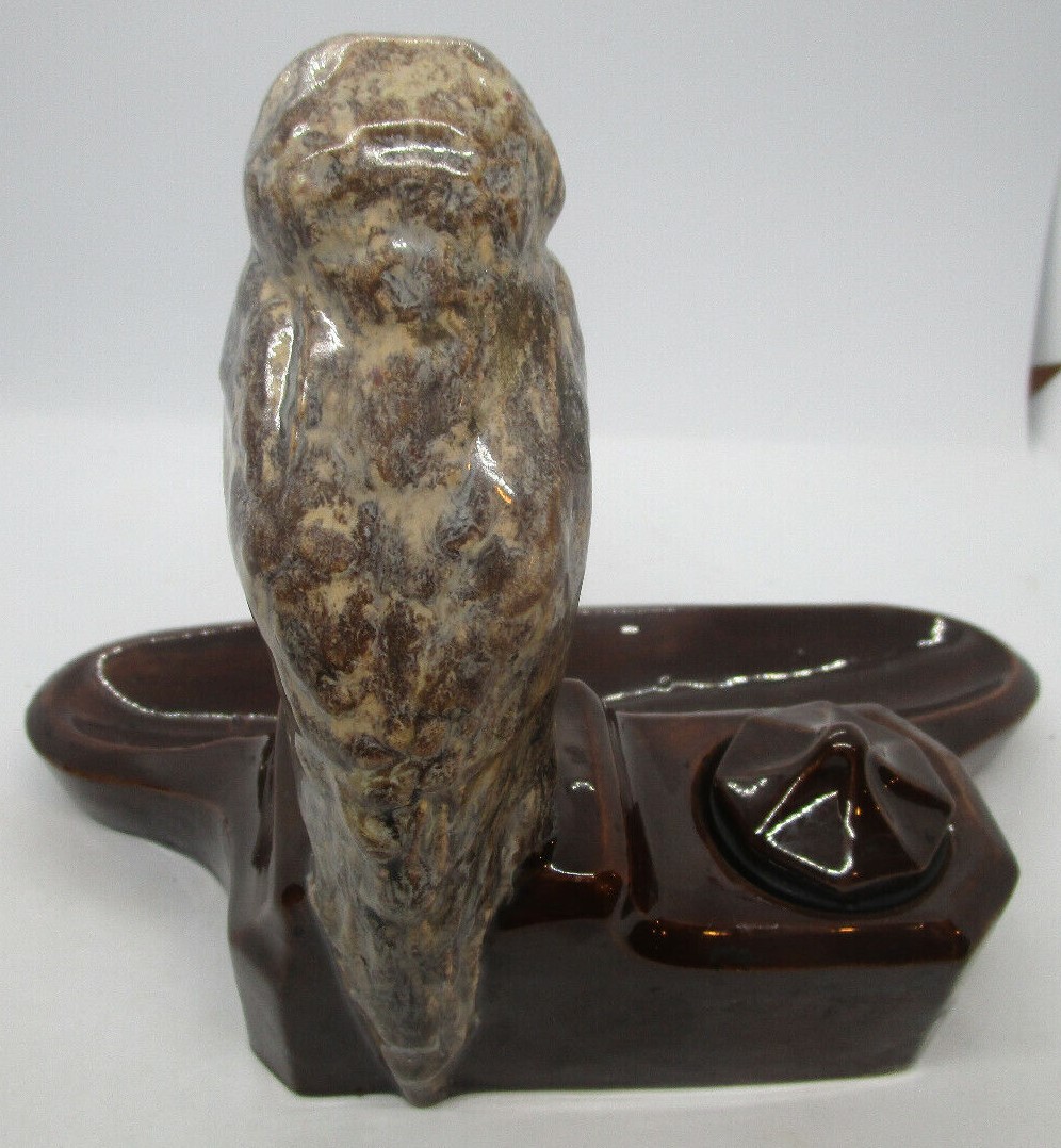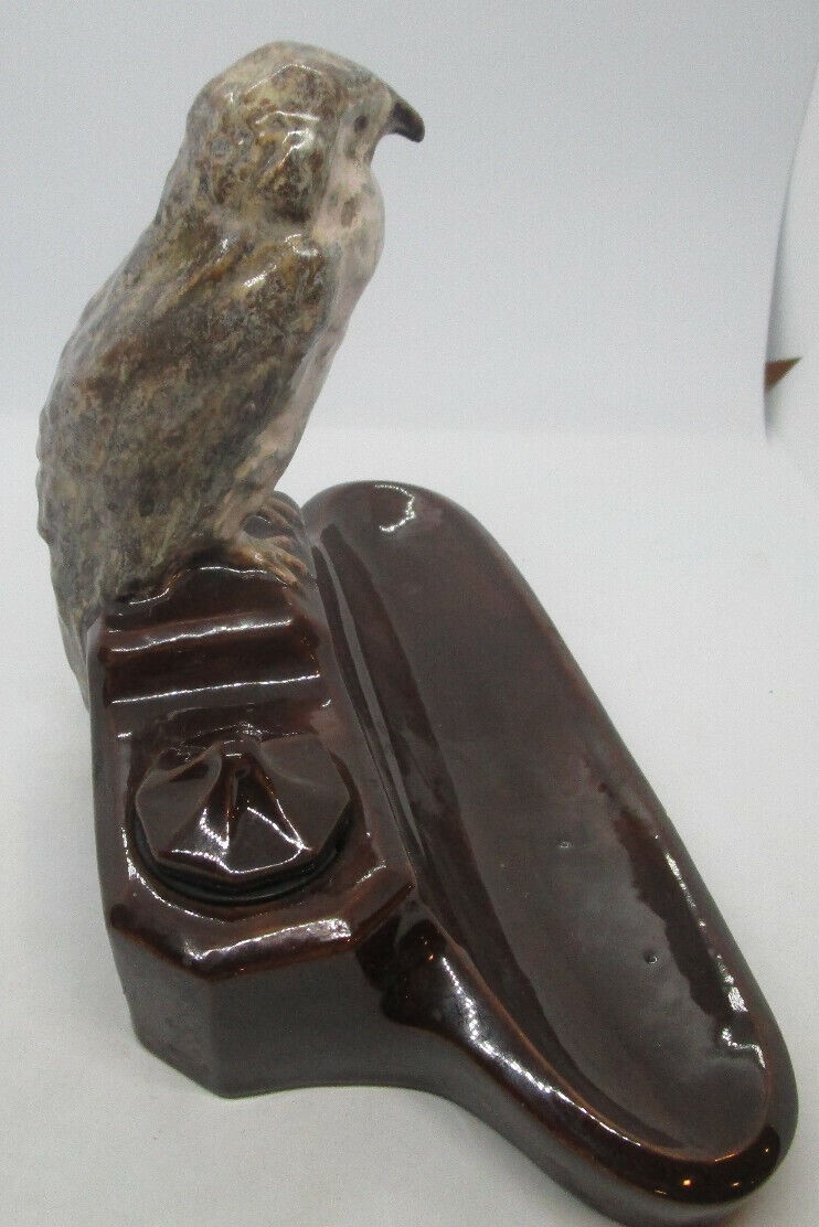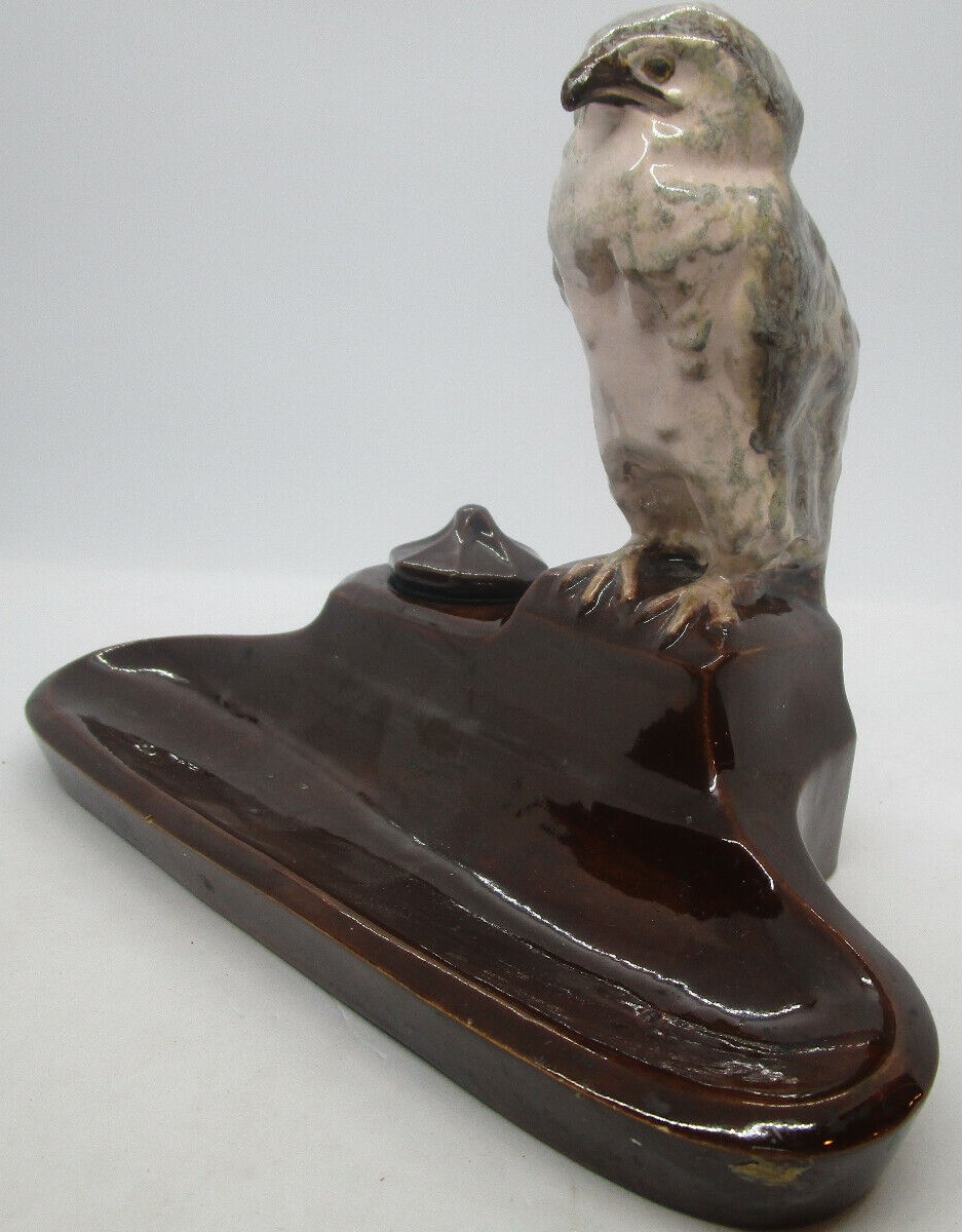 Glazed ceramic pottery rendition of a Harrier hawk, seated on a brown glazed inkstand.  Marked KS Bechyne, Bohemia.