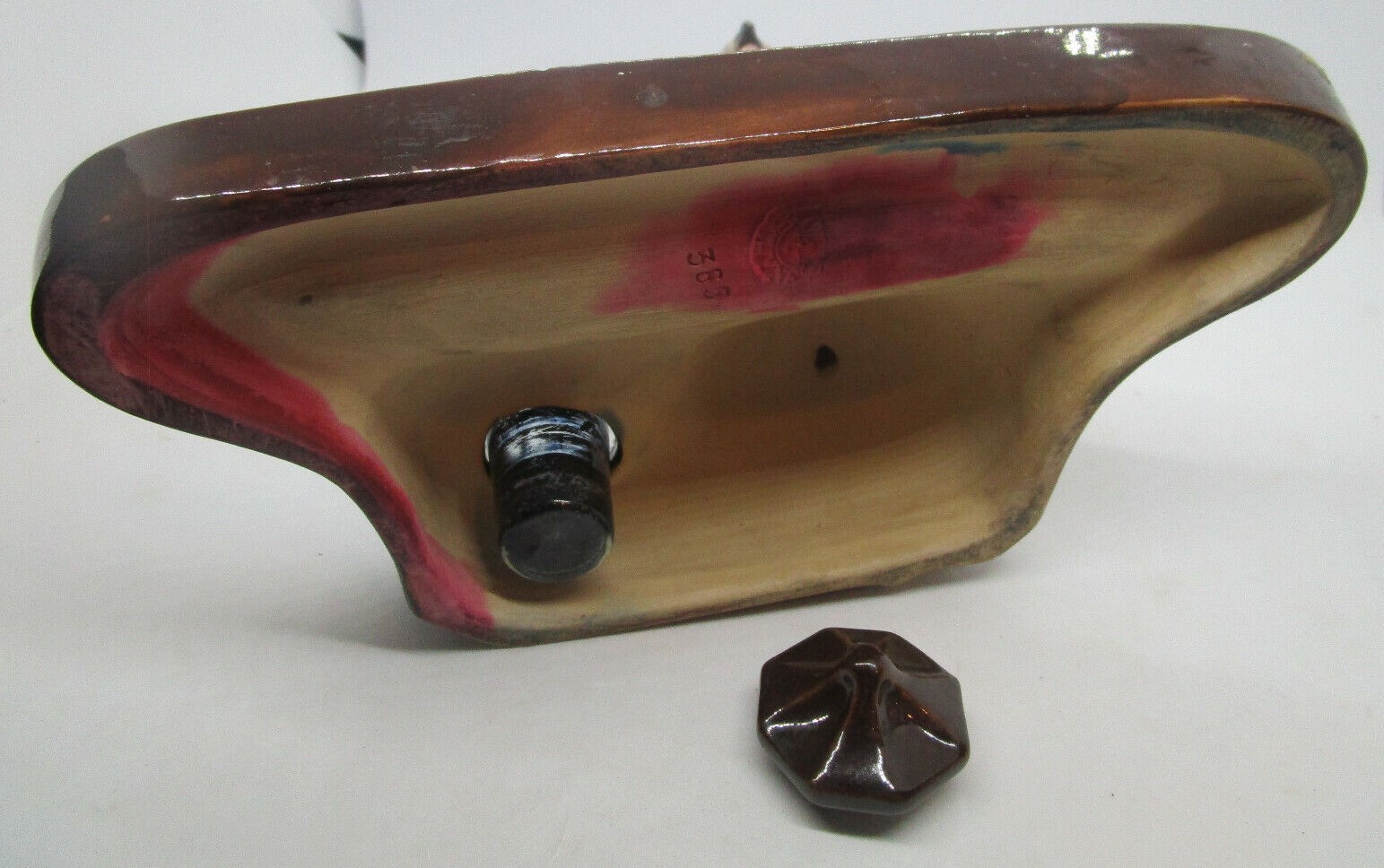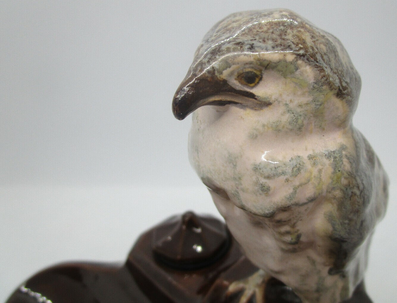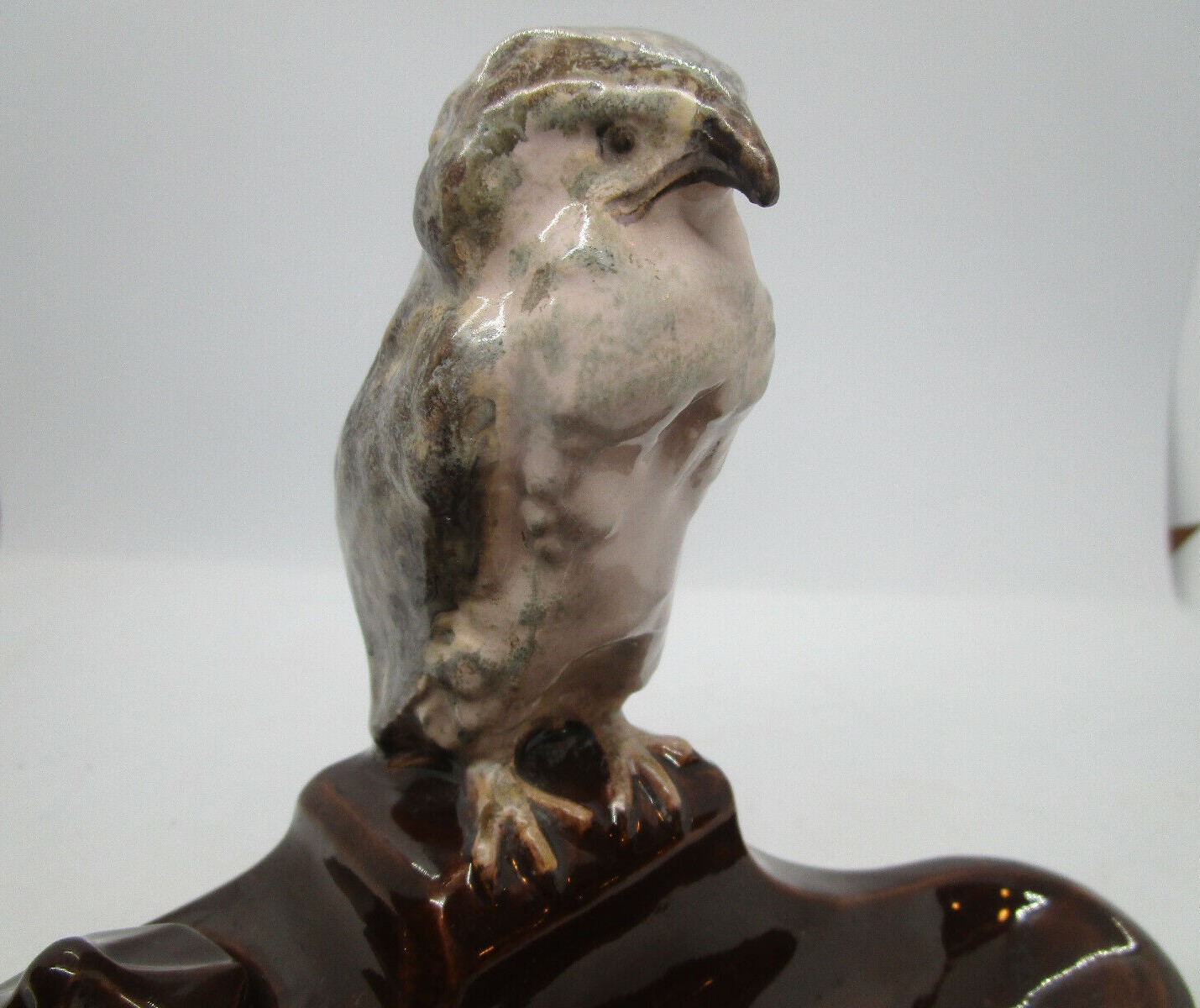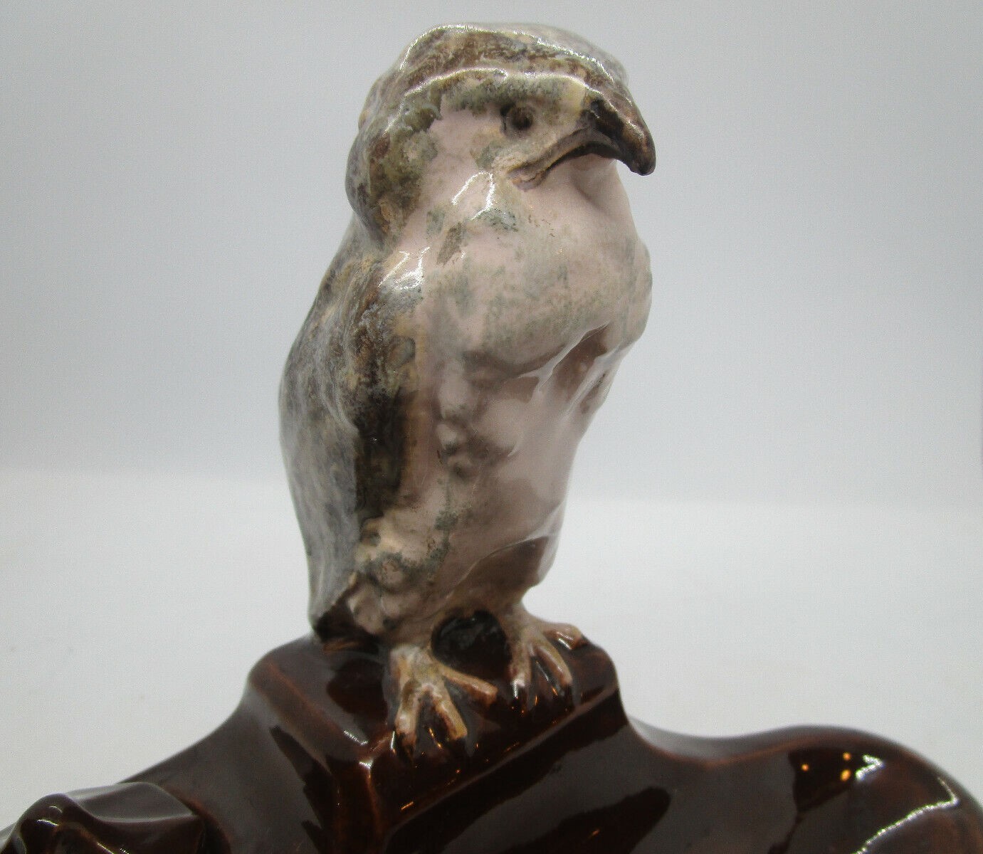 Glazed ceramic pottery rendition of a Harrier hawk, seated on a brown glazed inkstand.  Marked KS Bechyne, Bohemia.