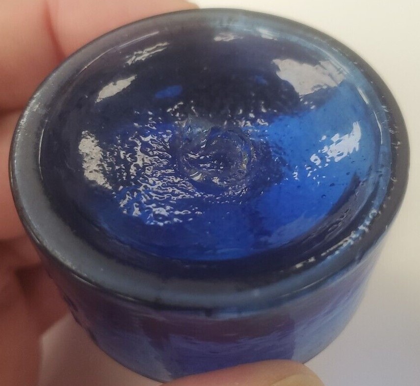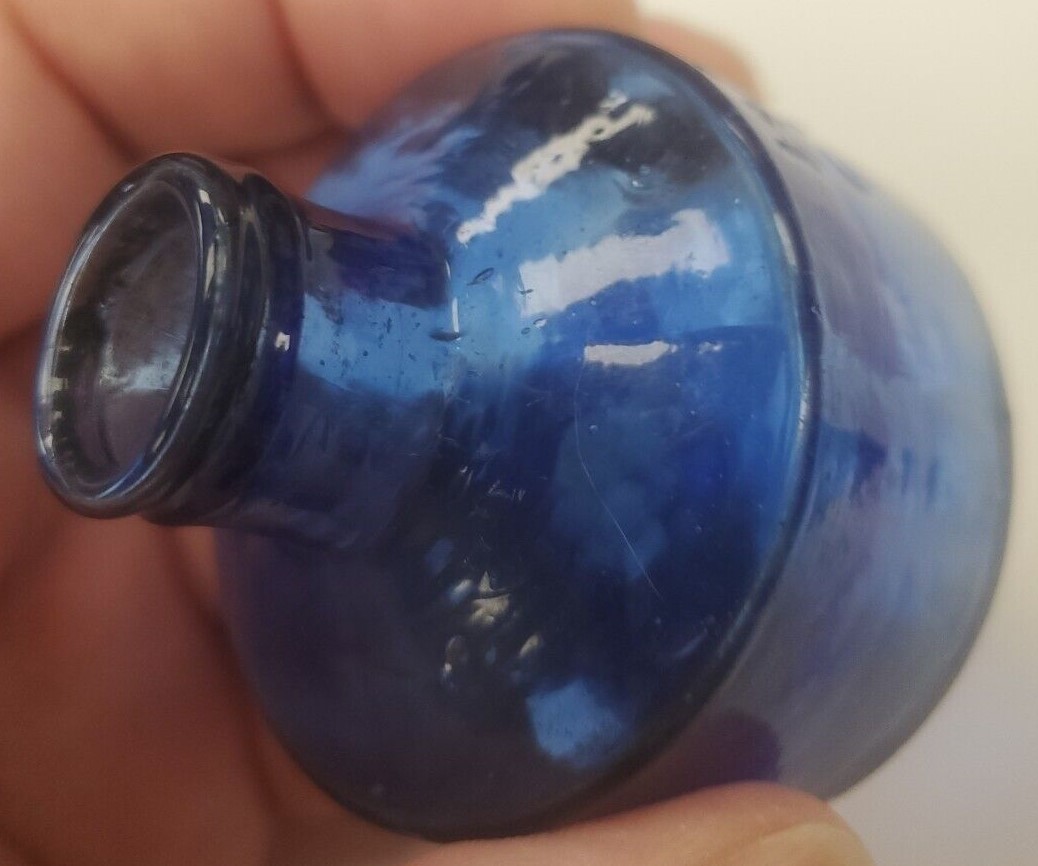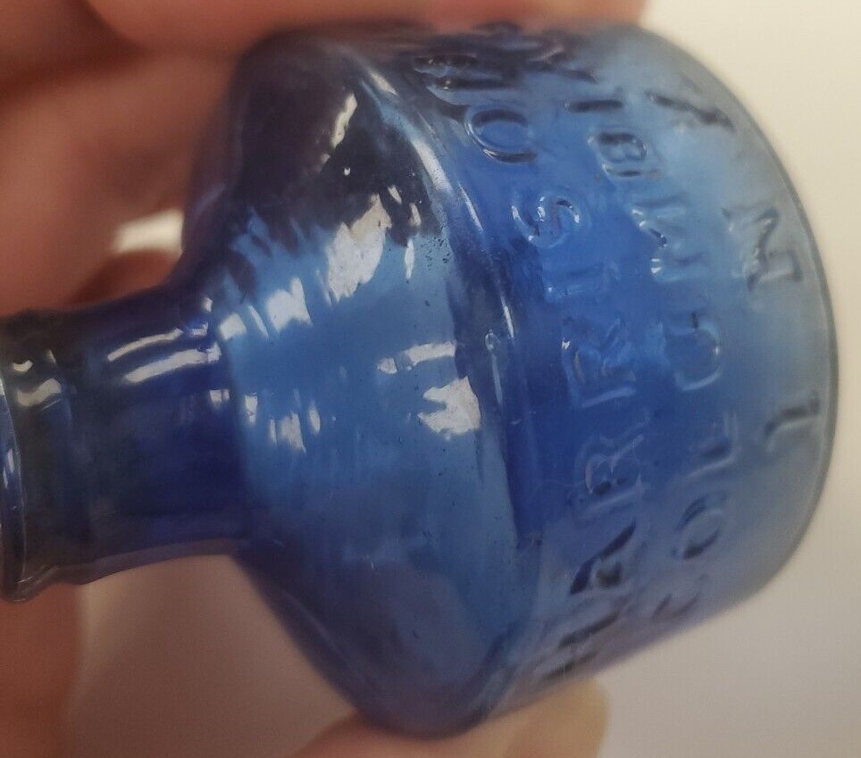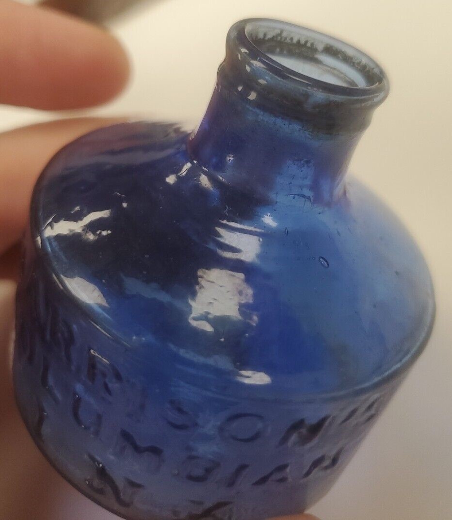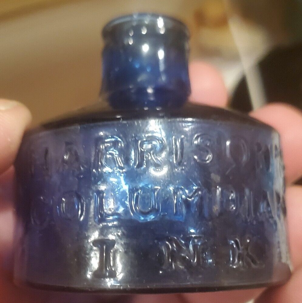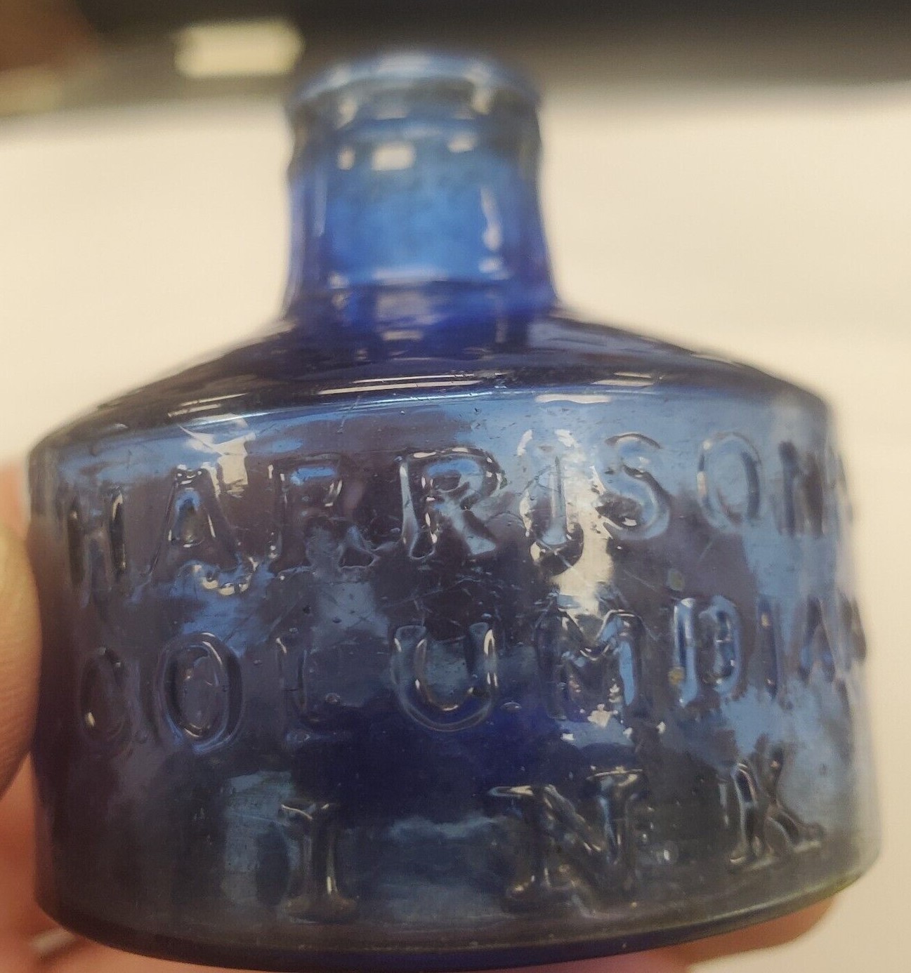 Cylindrical, medium cobalt blue ink bottle with an inward rolled mouth and tubular pontil scar. Bold embossing – “Harrison’s Columbian Ink”.