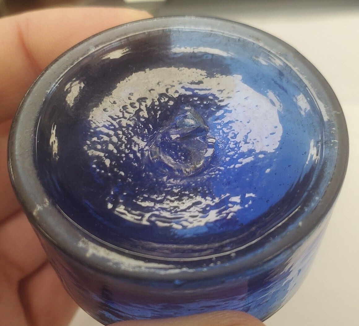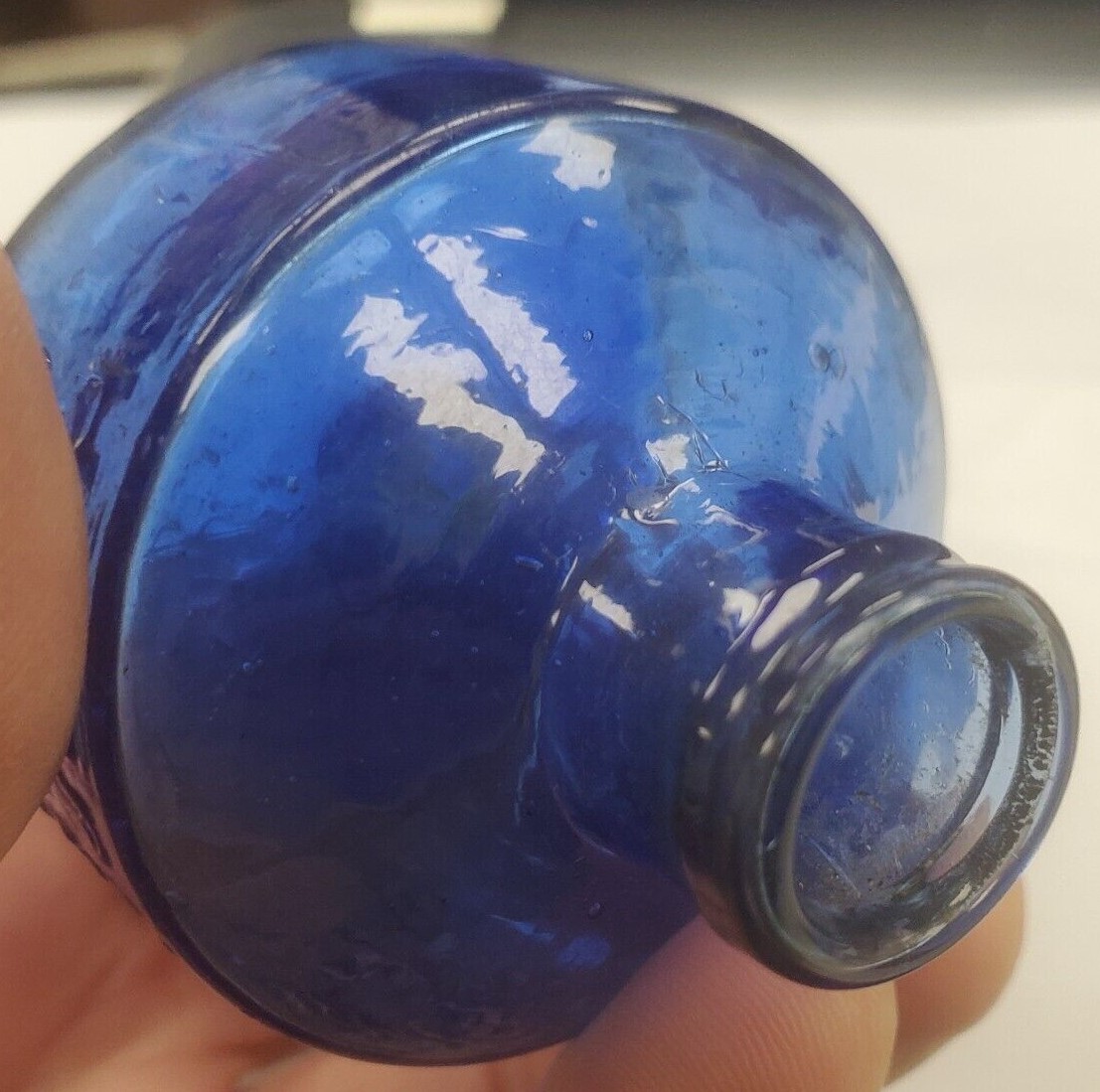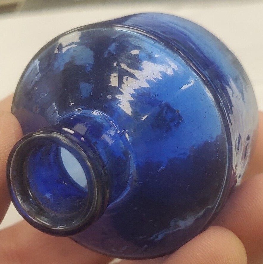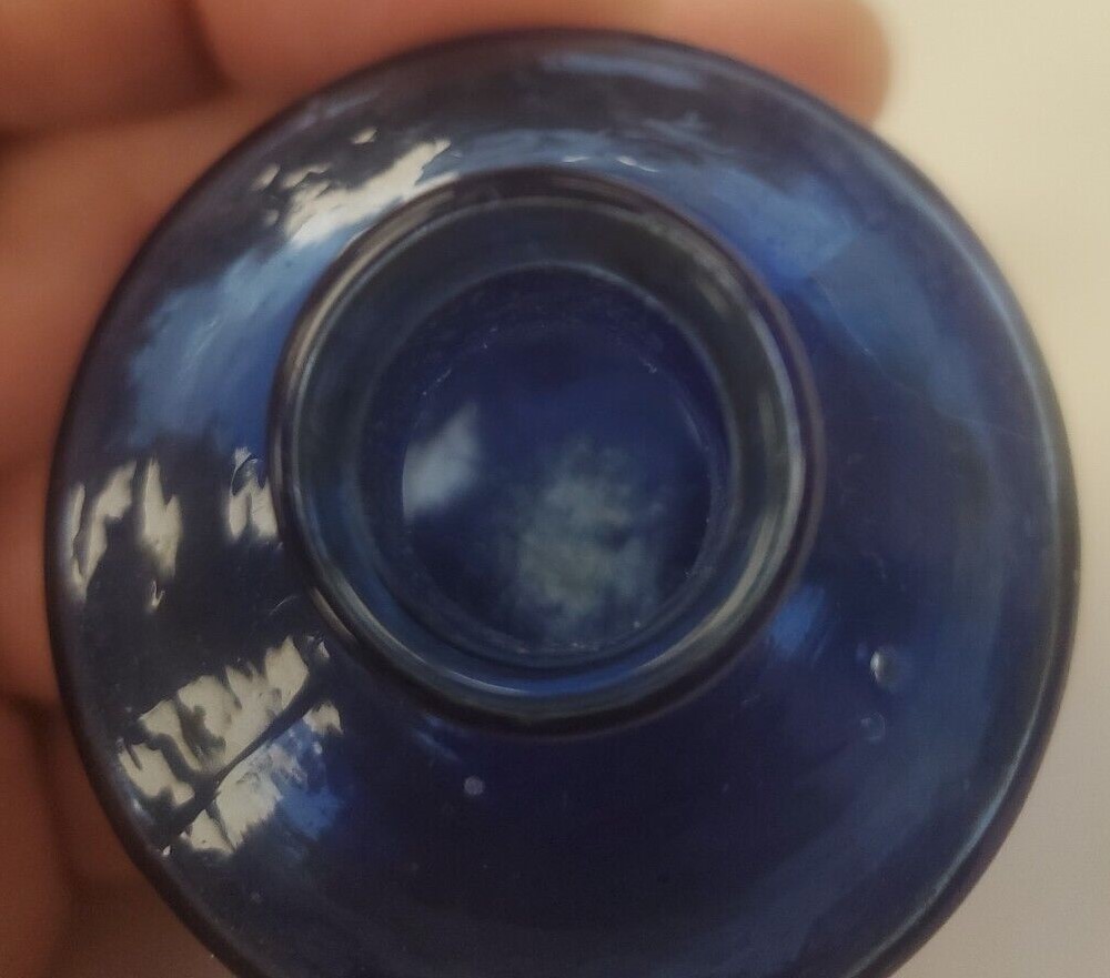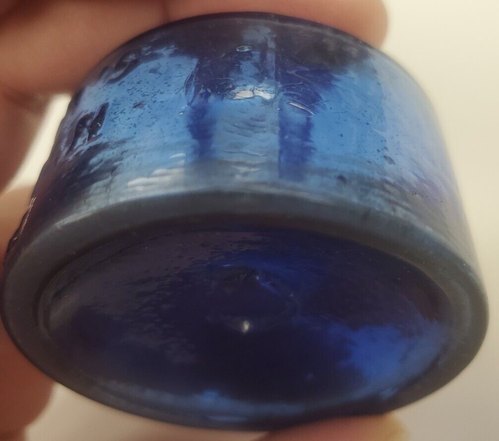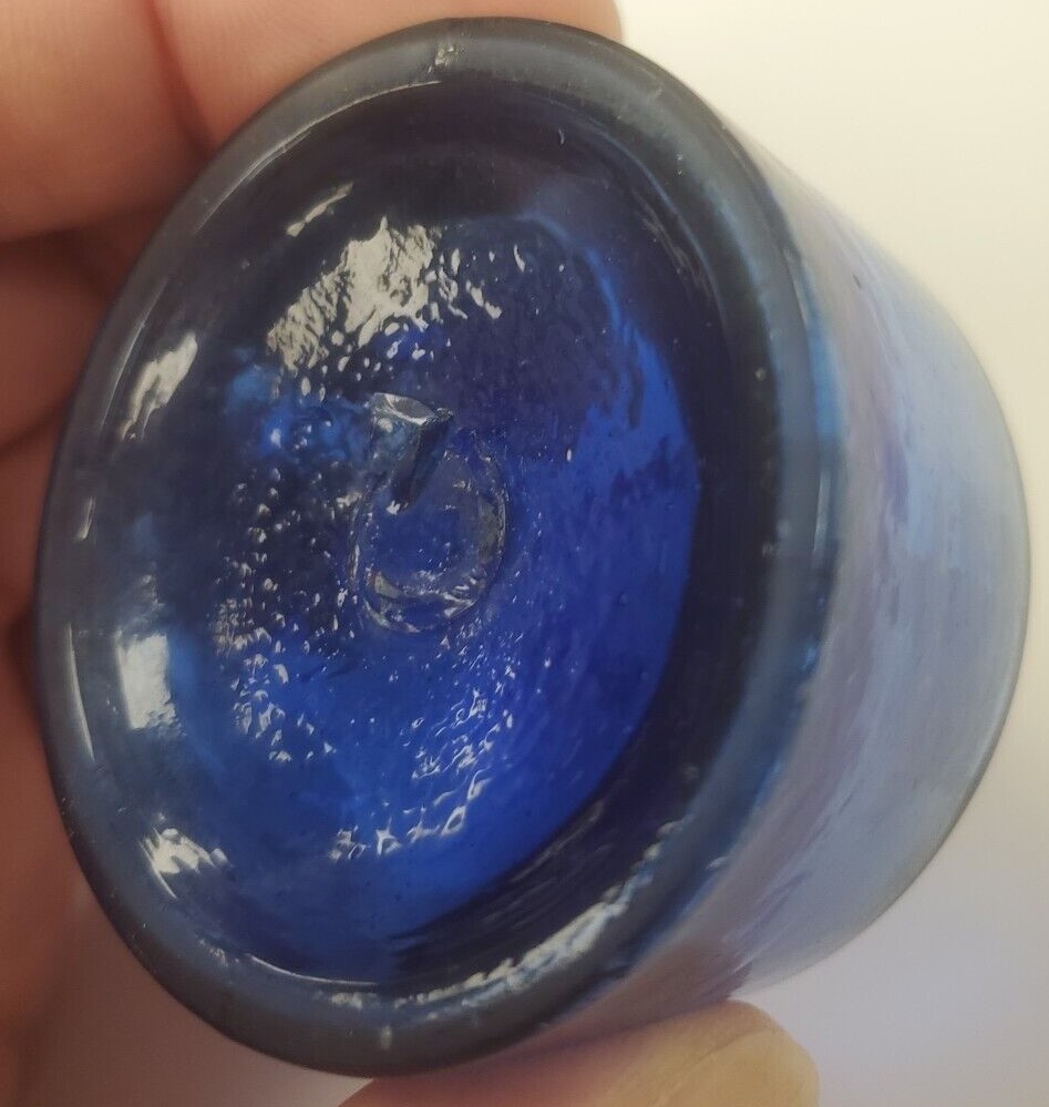 Cylindrical, medium cobalt blue ink bottle with an inward rolled mouth and tubular pontil scar. Bold embossing – “Harrison’s Columbian Ink”.