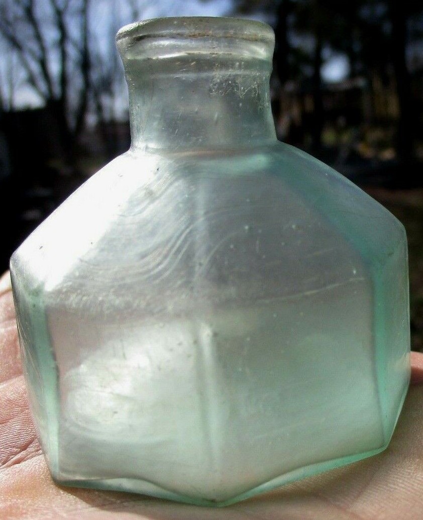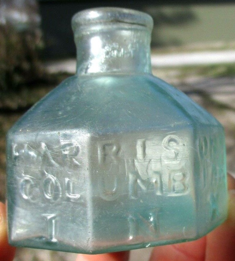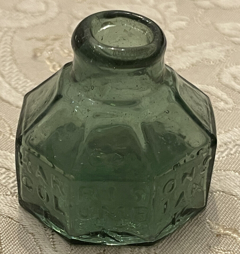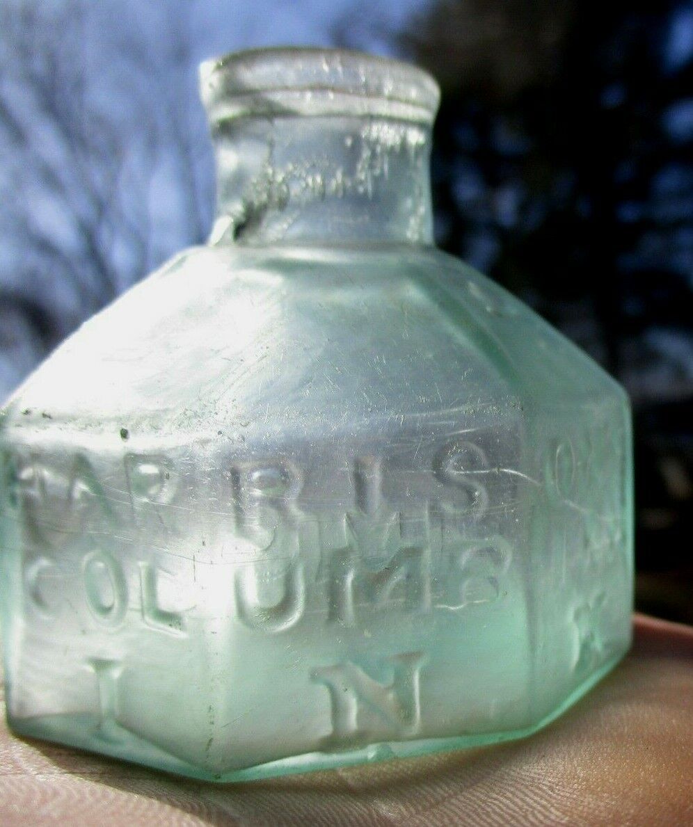 Aqua 8-sided ink bottle embossed “Harrison’s Columbian Ink.” It has a slightly offset open pontil scar and a crude rolled lip. It was hand-blown and is 2 ¼” high.