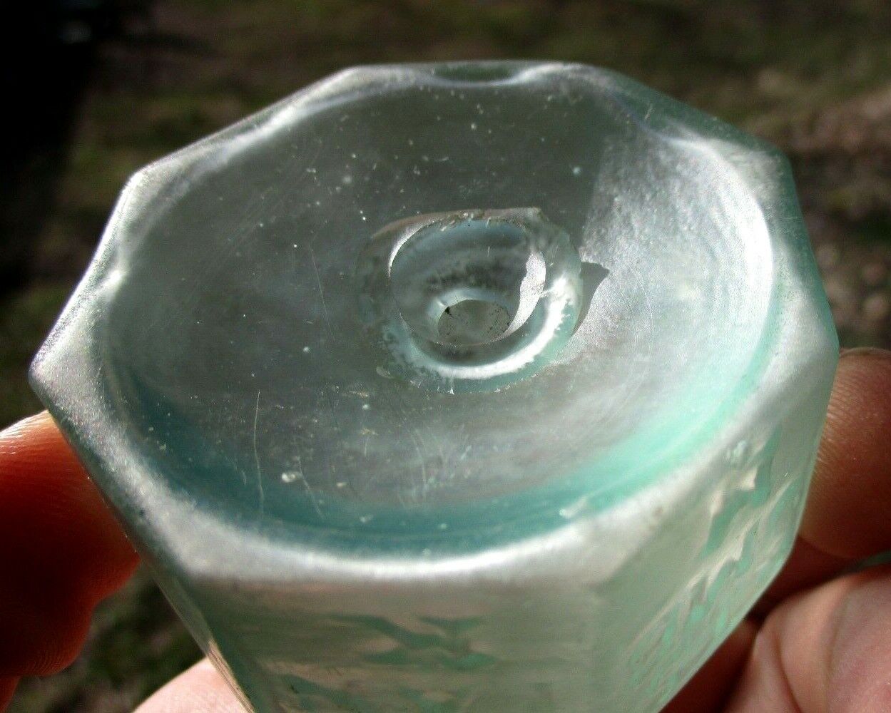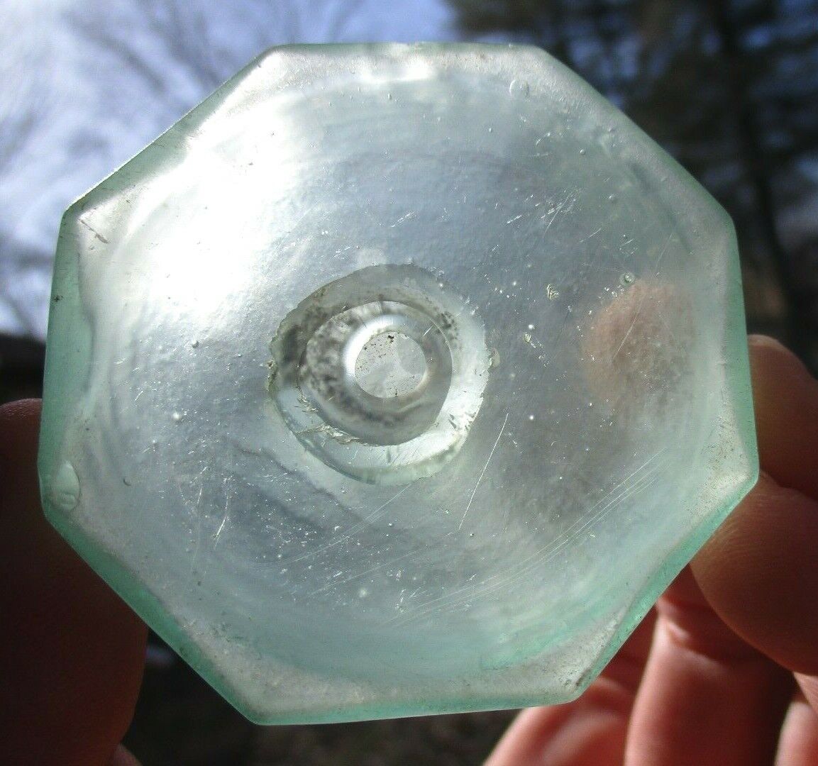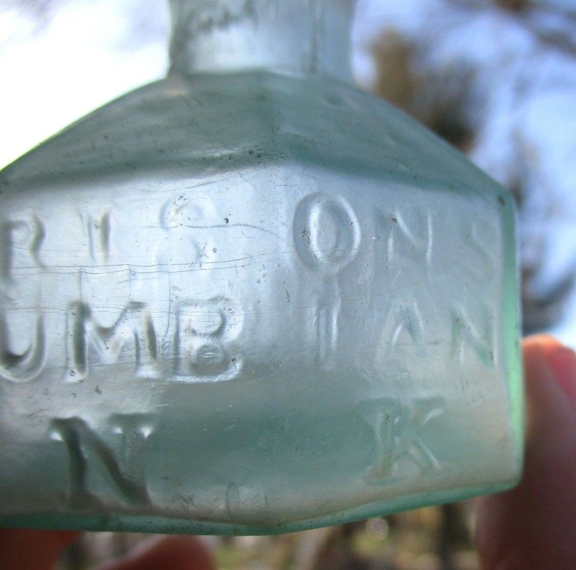 Aqua 8-sided ink bottle embossed “Harrison’s Columbian Ink.” It has a slightly offset open pontil scar and a crude rolled lip. It was hand-blown and is 2 ¼” high.