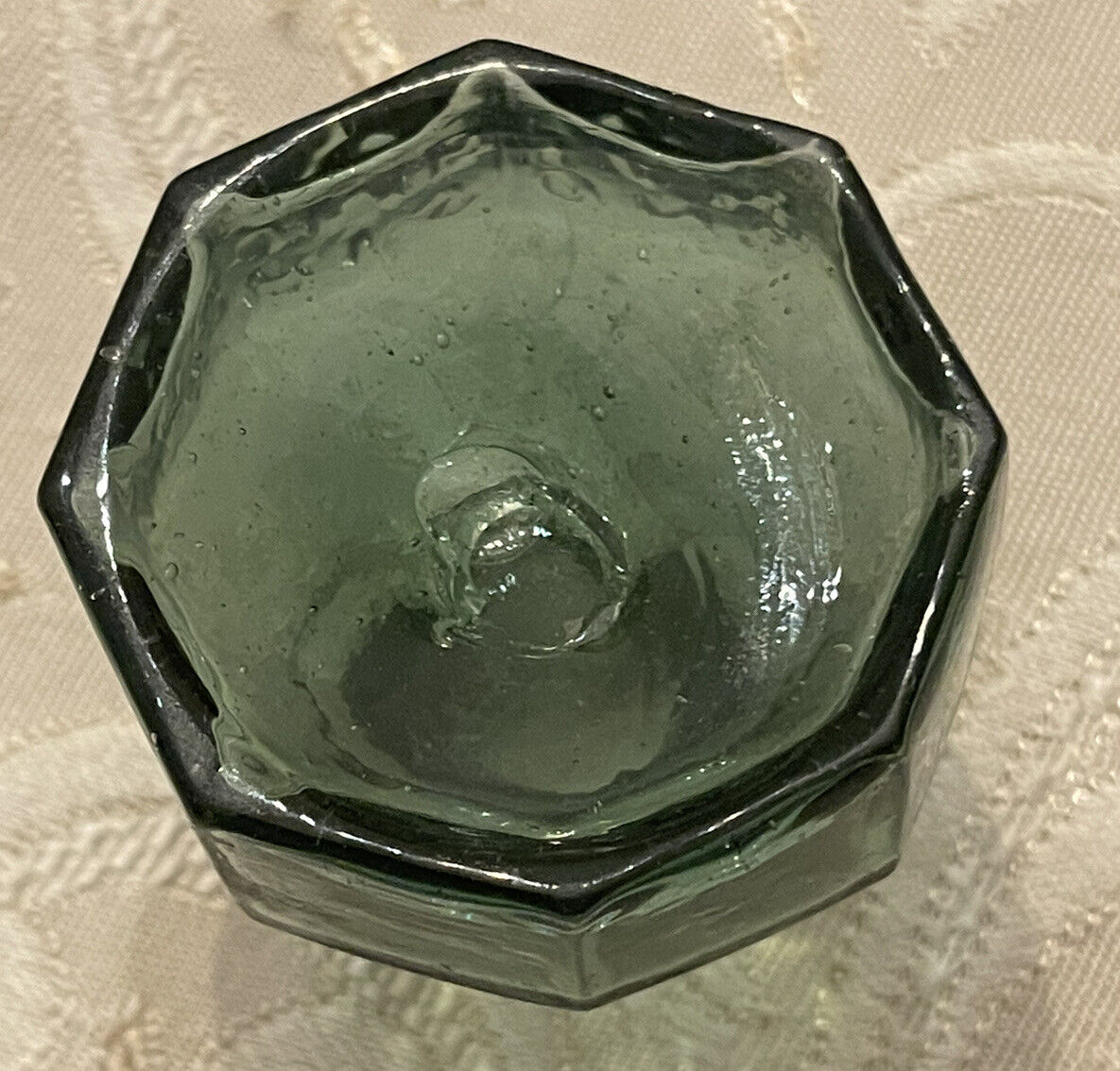 Deep dark green, hand-blown, 8-sided octagonal ink bottle with open pontil – embossed “Harrison Columbian Ink”.
