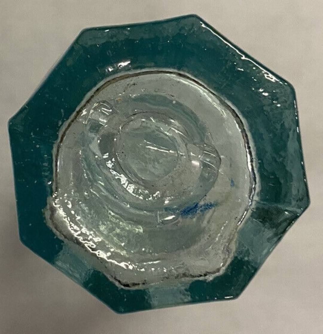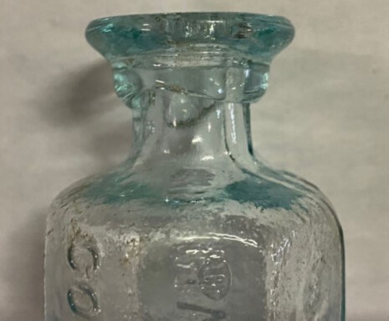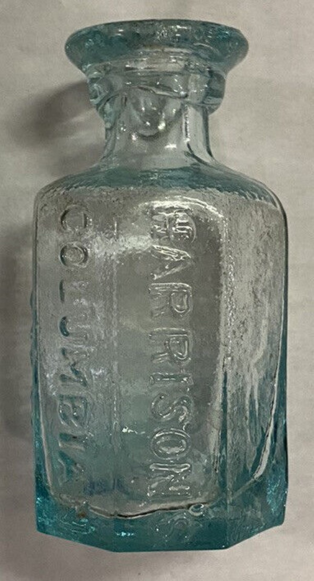 Open pontil aqua colored ink bottle for Harrison’s Columbian Ink with applied top.