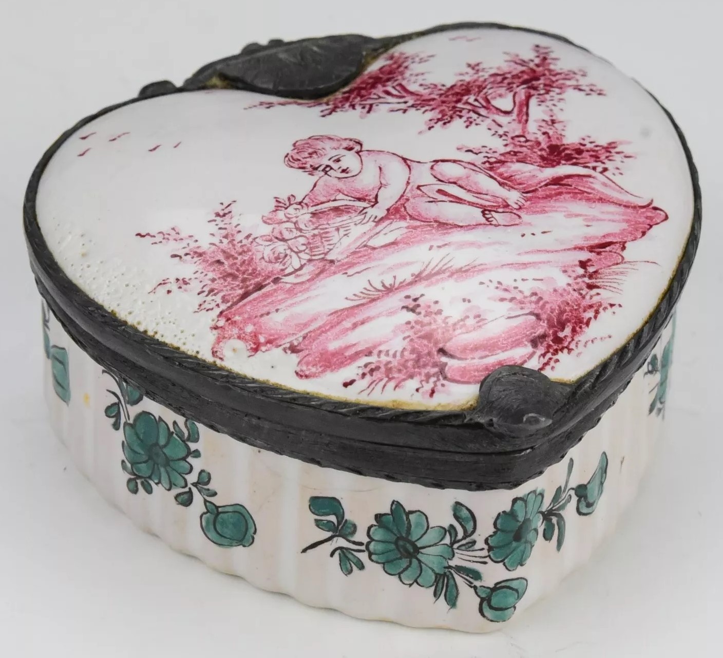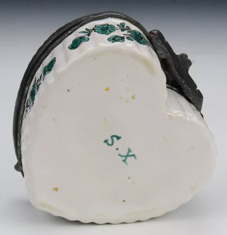 An early heart-shaped faience inkstand crafted by Sceaux ceramic factory with an interior pewter inkwell. Made of soft paste porcelain, it features a landscape with a putto pulling flowers out of a basket. The edge of the box is decorated with green floral sprays. The interior inkwell is framed in pewter with a cross-hatched design. Sceaux, historically known for its ceramic work, produced this piece during the 18th century in France. The inkstand is signed on the bottom “S. X.”