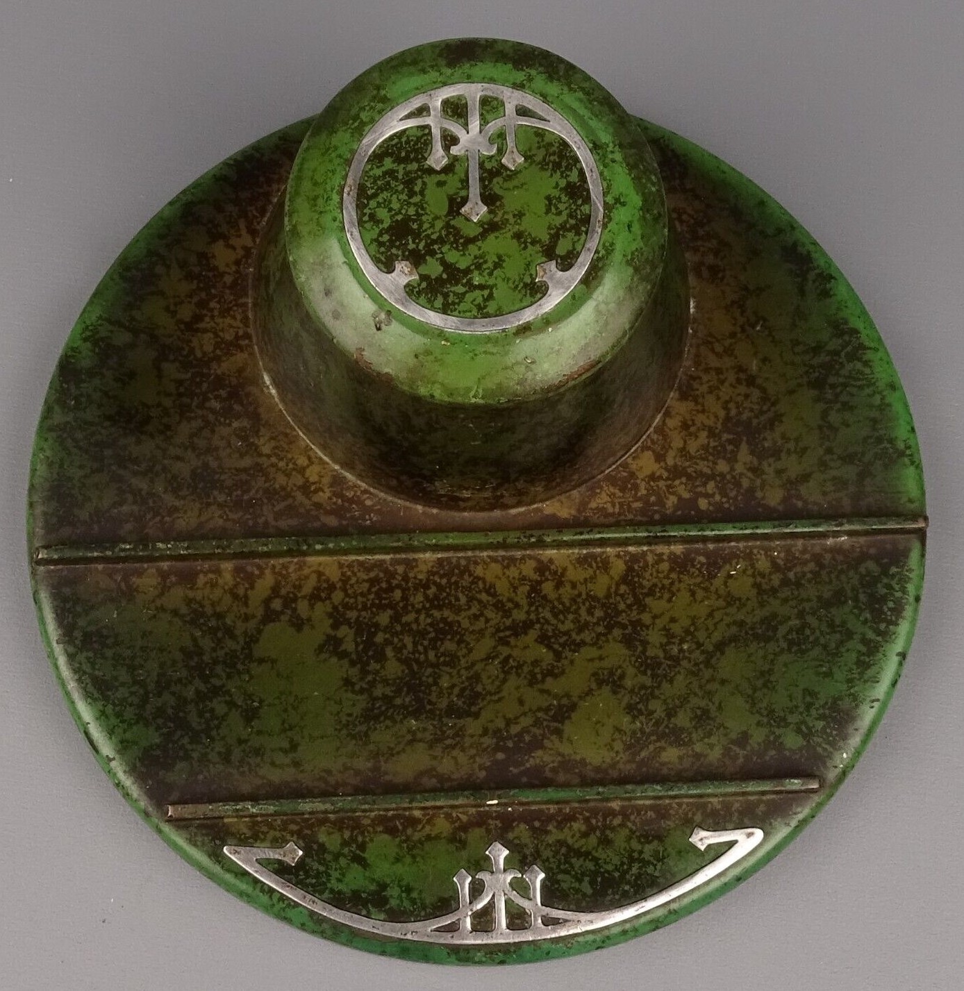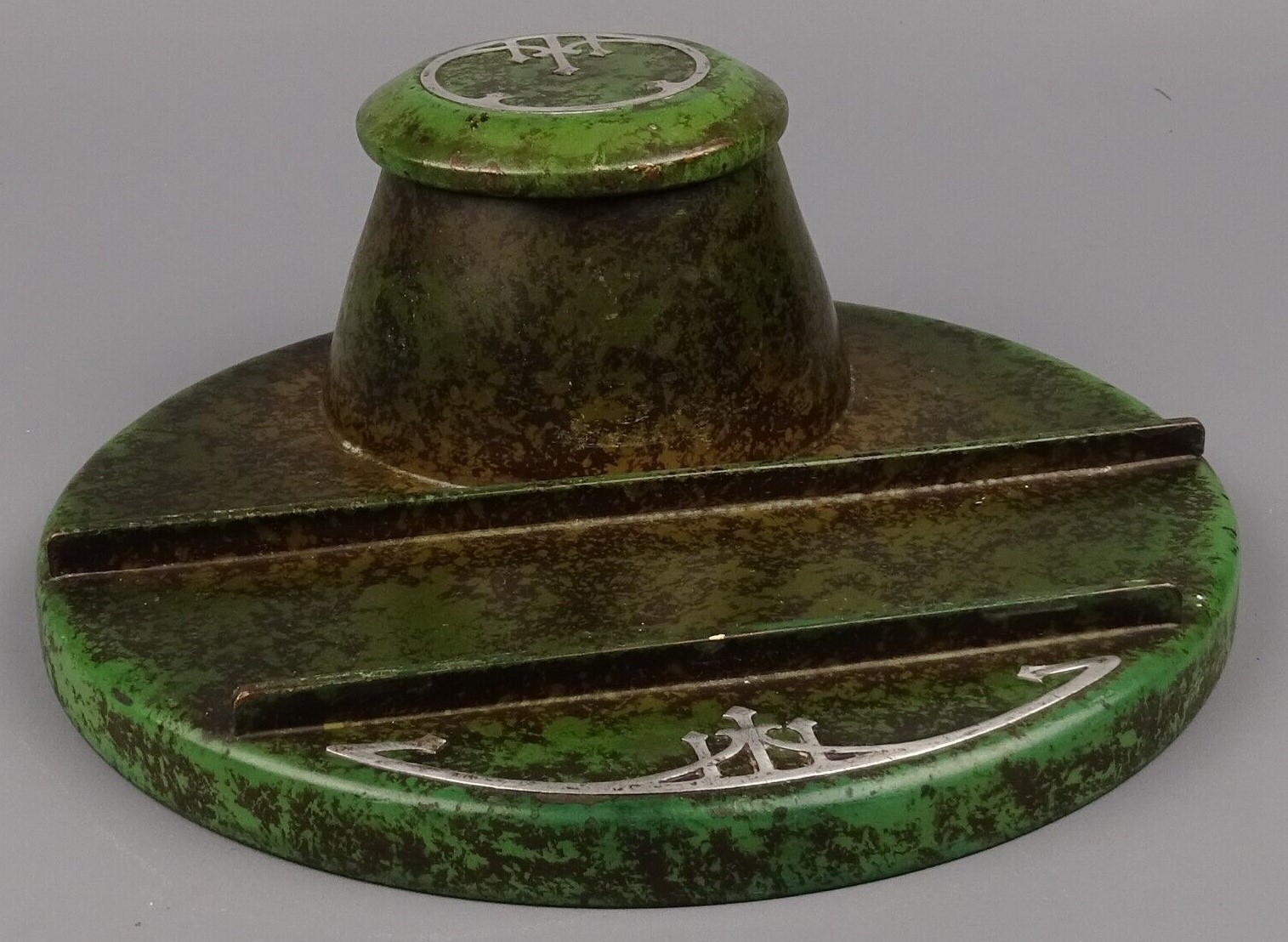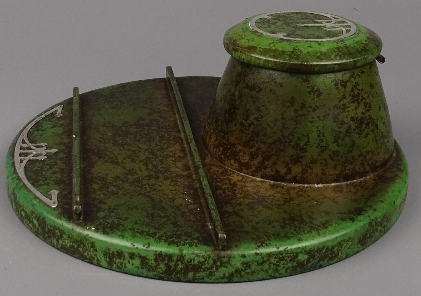 Heintz sterling on bronze inkwell and blotter in a mottled green finish. The inkwell is numbered #1144.