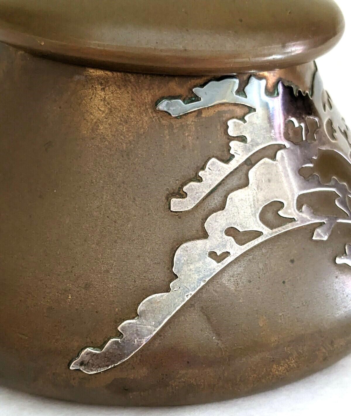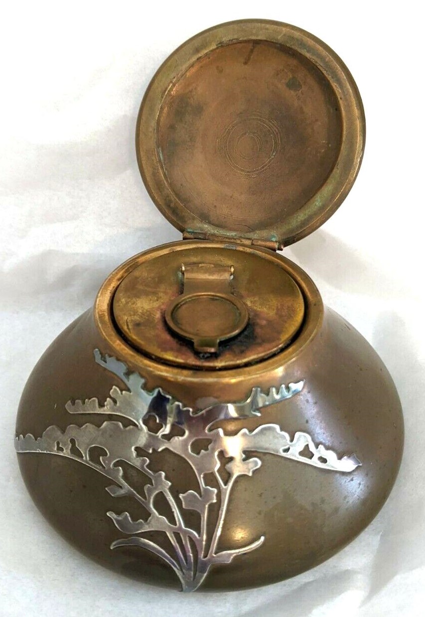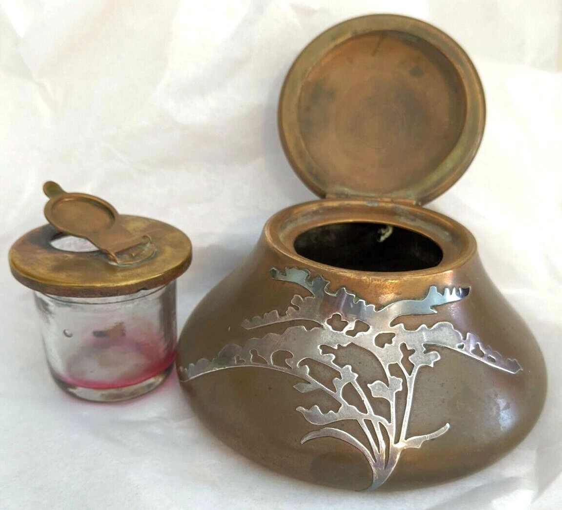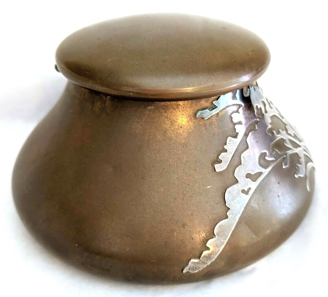 This inkwell with a rounded body and domed lid boasts a silver overlay of stems and leaves. It was made by the Heintz Art Metal Shop (H.A.M.S. logo stamped on the underside) and is numbered 1098. The original insert with hinged cover is present.