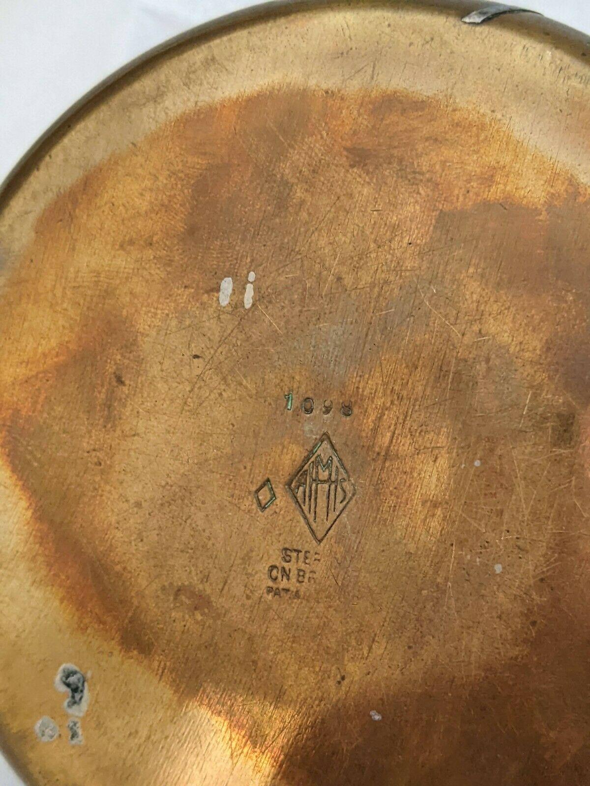 – From a circa 1916 trade catalog: “Heintz wares have won an enviable reputation among buyers of art goods, because of originality and beauty of design, and unusual quality of attractiveness. The articles are of bronze, and are decorated with sterling silver designs, permanently applied by our patented process. Beautiful colored finishes have been produced after much thought and experiment.”