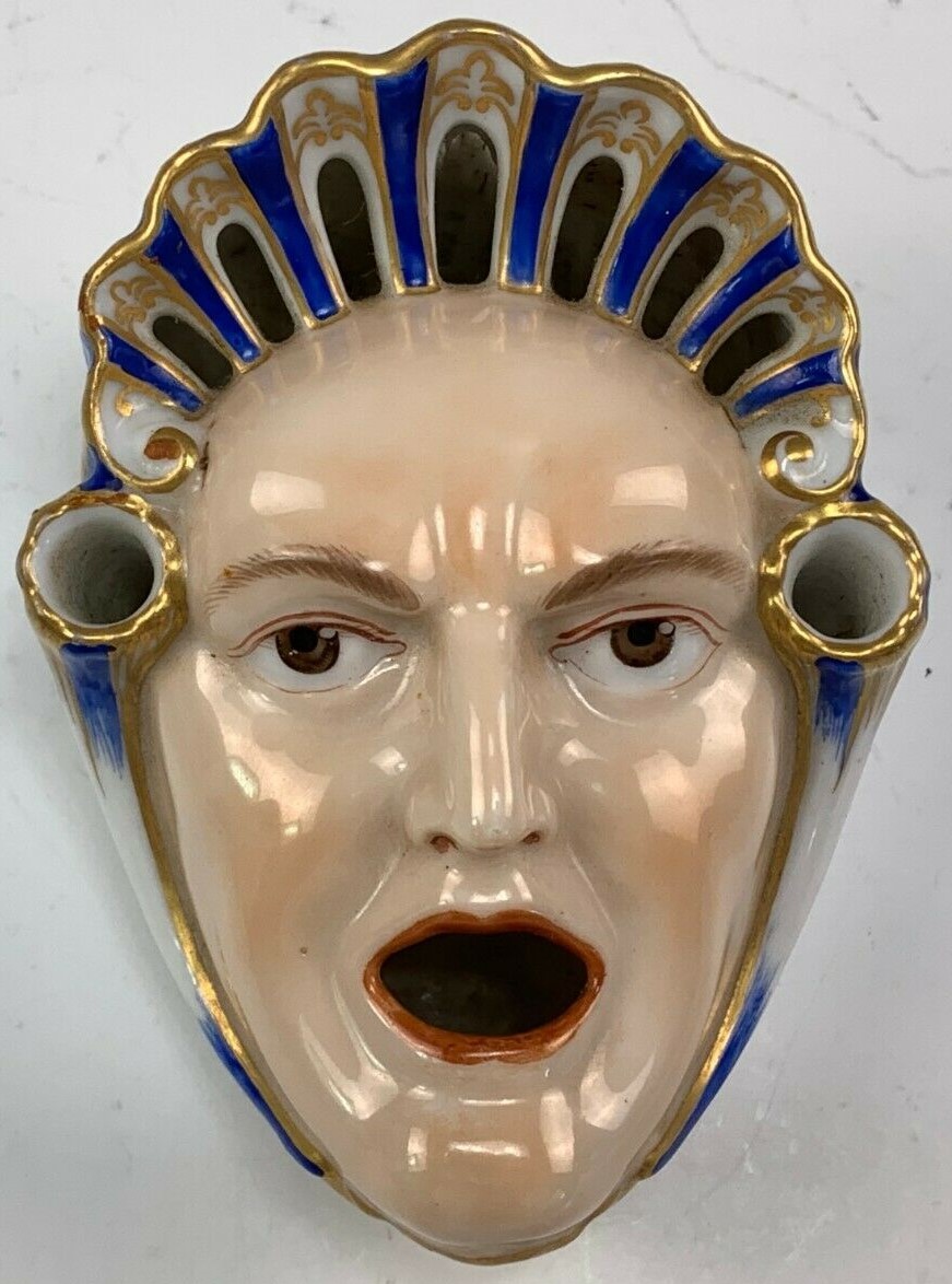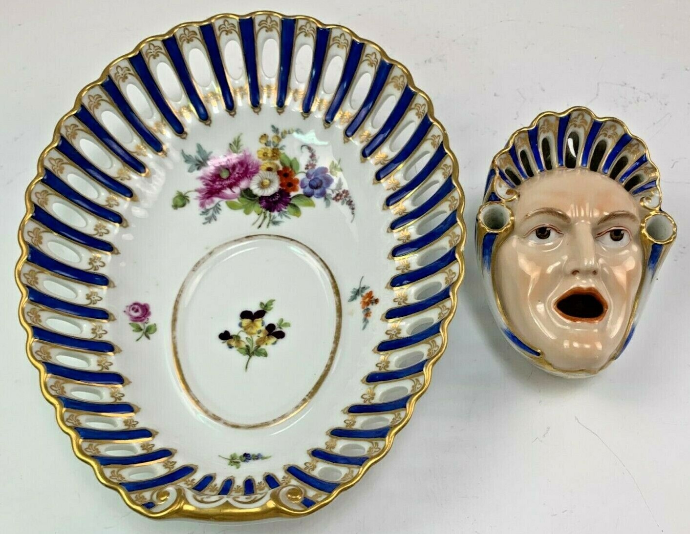 This unusual inkwell design was created by Carl Gotthelf in the early 1800’s. The inkwell itself depicts an older woman with an open mouth (the inkwell) and has two holes at the sides to hold writing instruments. The set is a Meissen blank decorated by Helen Wolfsohn of Dresden, with a mark on the tray dating this to around 1886. The set is in perfect condition with exquisite detail to the woman’s face and royal blue trim, repeated in the shell-shaped tray that is 8 ½” by 6 ½”. The separate face inkwell is about 4″ by 3″ and fits into the designated well of the tray, which has reticulated edges and hand painted flowers. The mark is on the tray as shown.