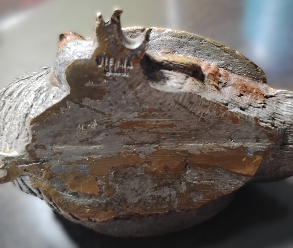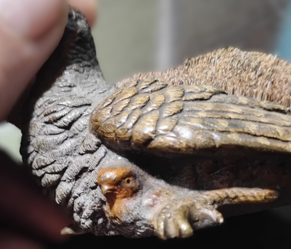 - Figural Form and Material: The pen wipe is sculpted in the form of a hen, with realistic detailing of her feathers. A chick’s head is depicted popping out from underneath her body. The piece is made of bronze. Vienna bronzes are typically cast in multiple pieces and then assembled, with intricate hand-finishing and cold-painting applied.