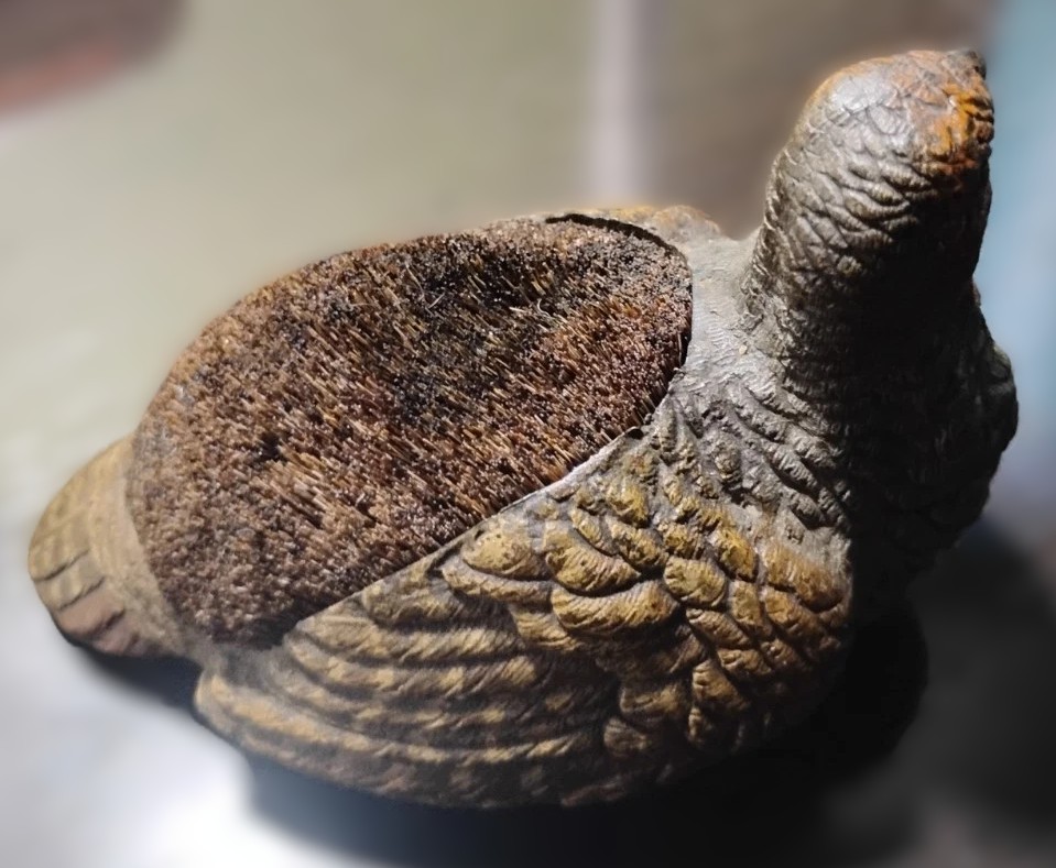 - Brush/Bristles: The functional “pen wipe” component is comprises the hen’s body. It consists of a cluster of bristles, which would have been used to clean excess ink from a dip pen nib. These bristles are made of boar hair.