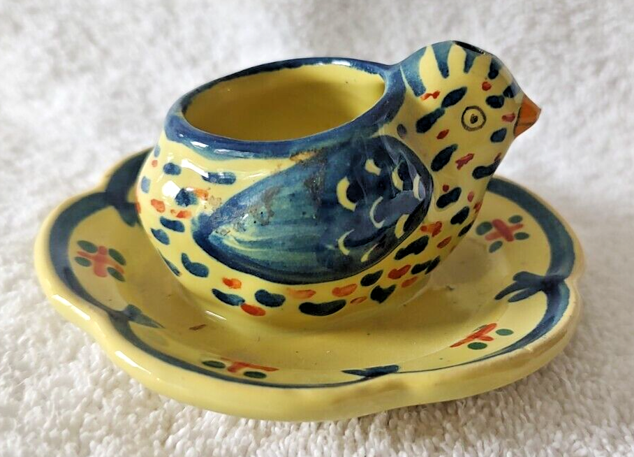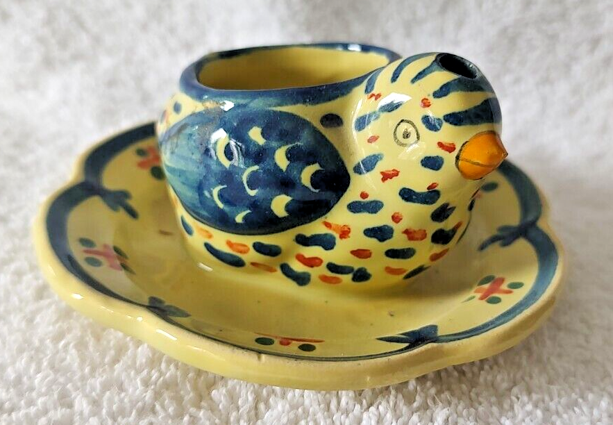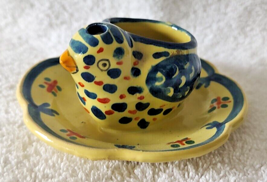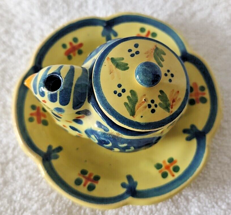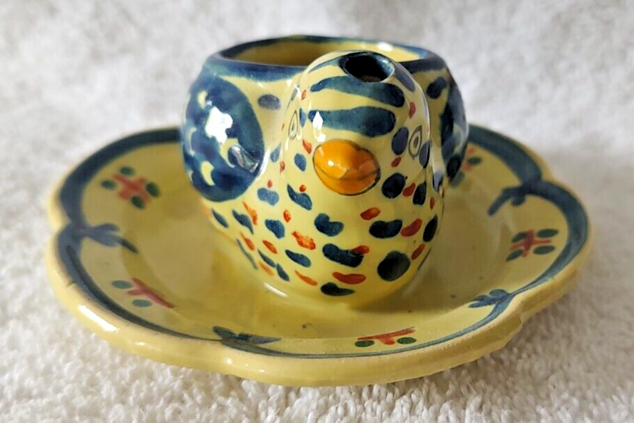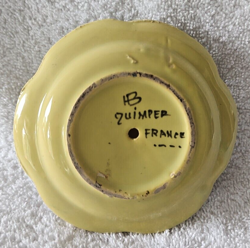 This Henriot Quimper figural bird inkwell is hand painted in pastel yellow and dark blue and is signed on the bottom.
