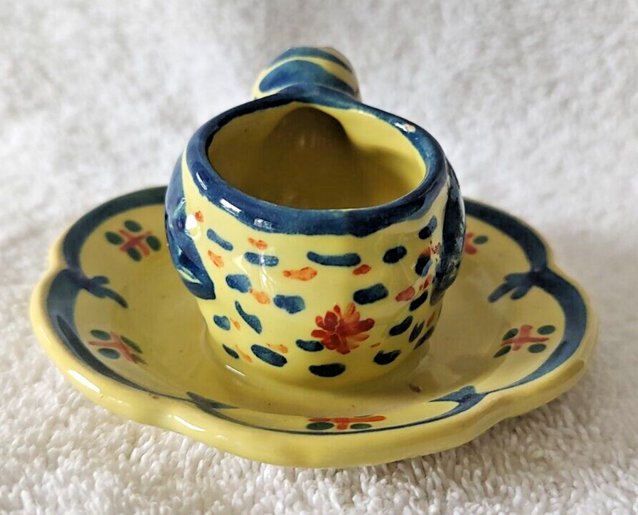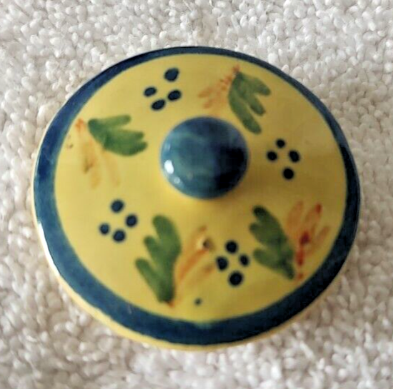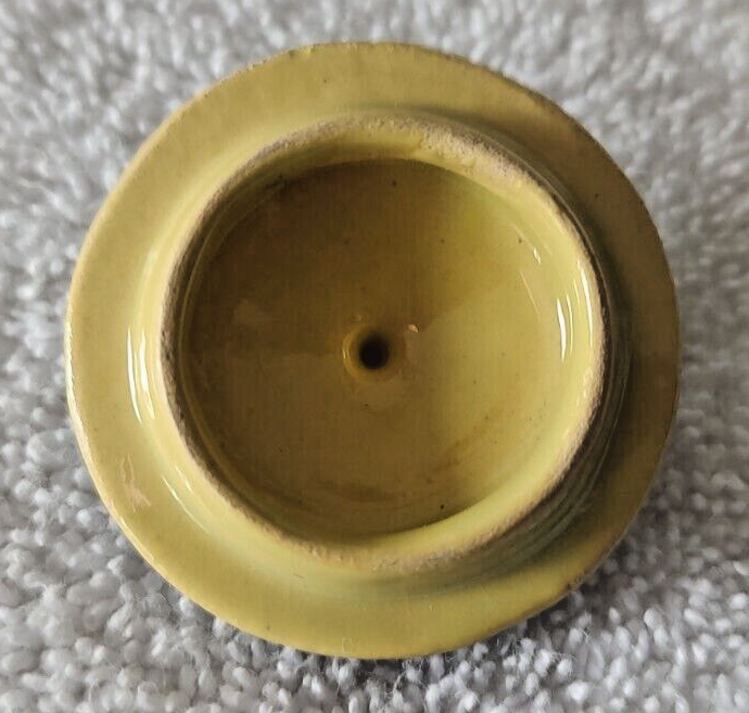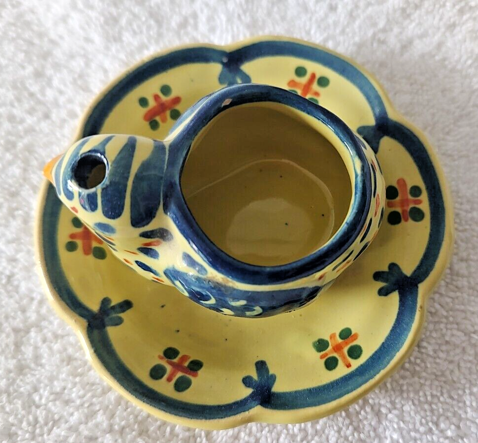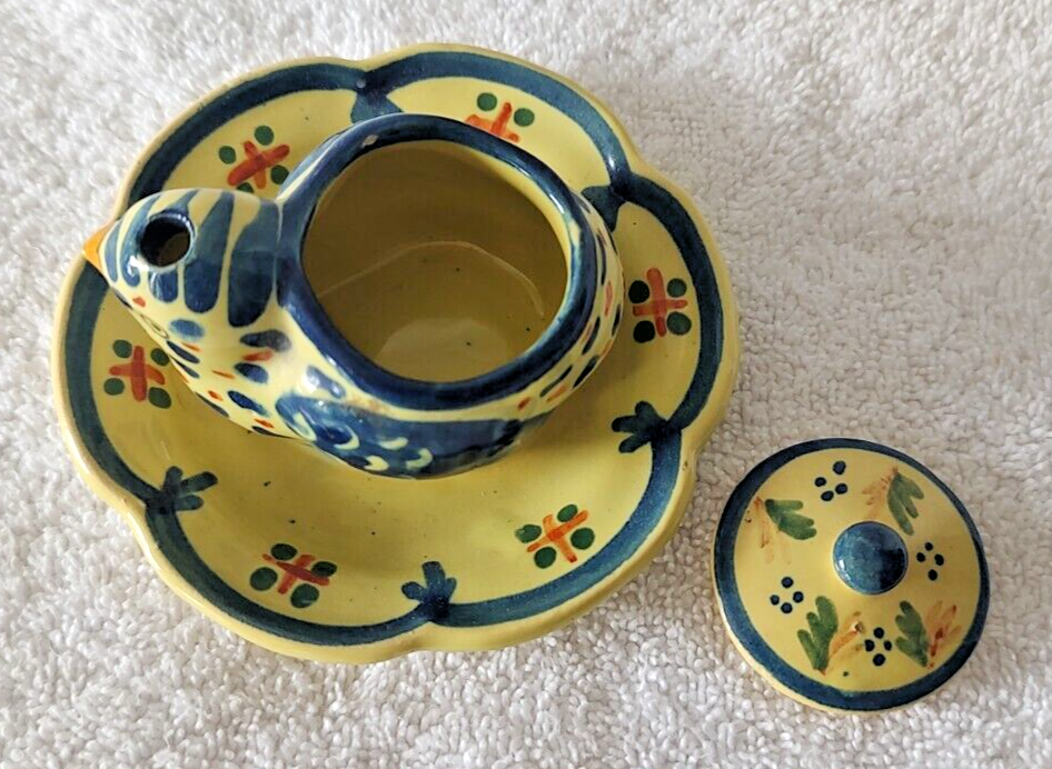 This Henriot Quimper figural bird inkwell is hand painted in pastel yellow and dark blue and is signed on the bottom.