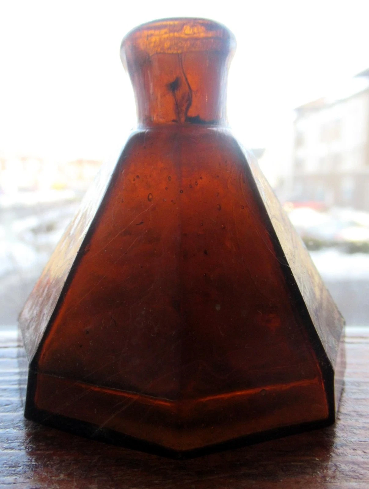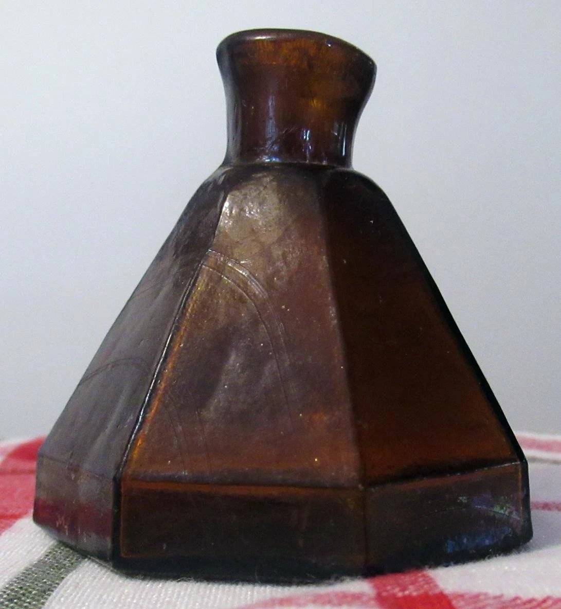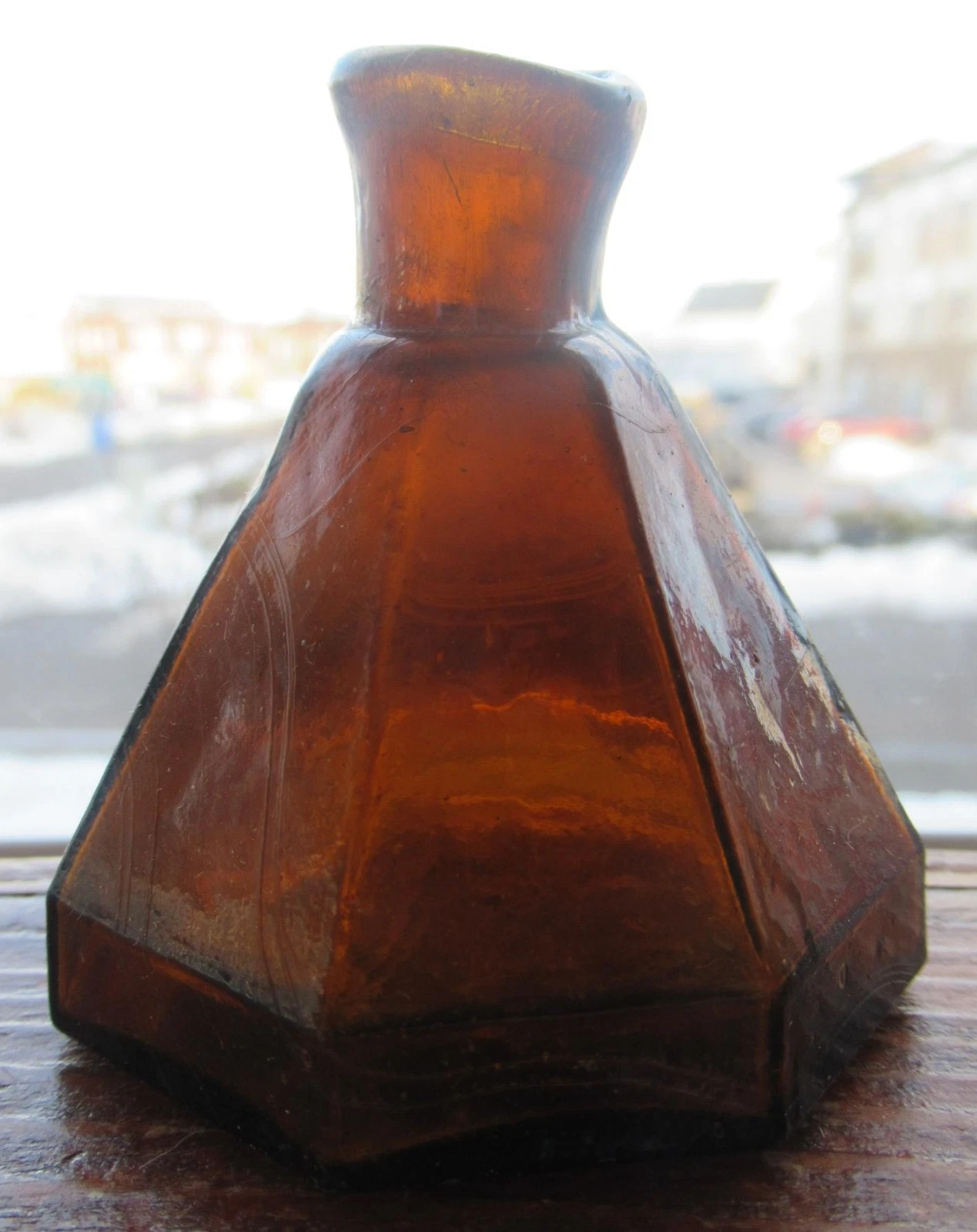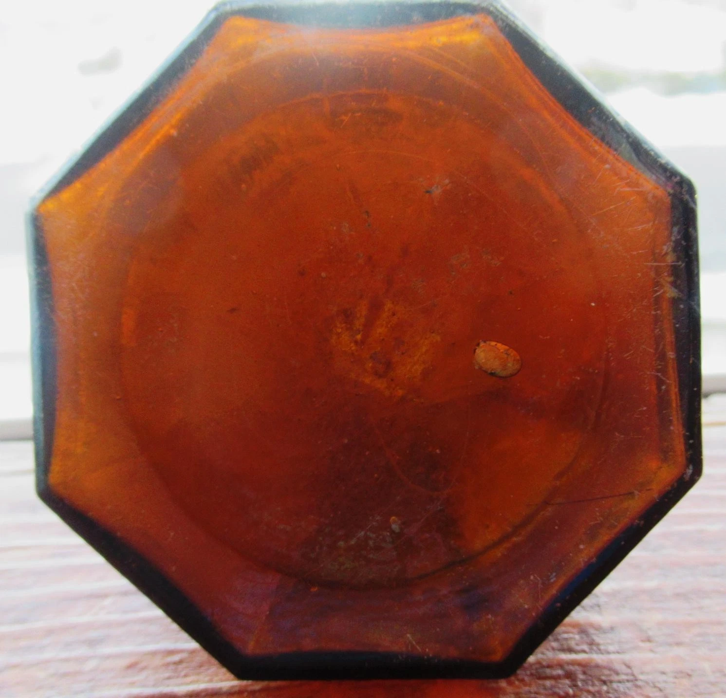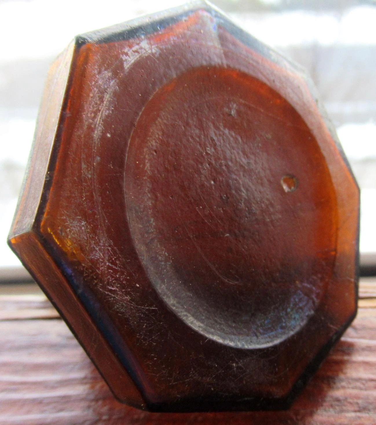 Standing at 2 ⅜ inches tall, this bottle features the classic 8-sided octagonal “umbrella” shape. The form is well-proportioned, with crisp angles on the panels that taper upward toward the neck.