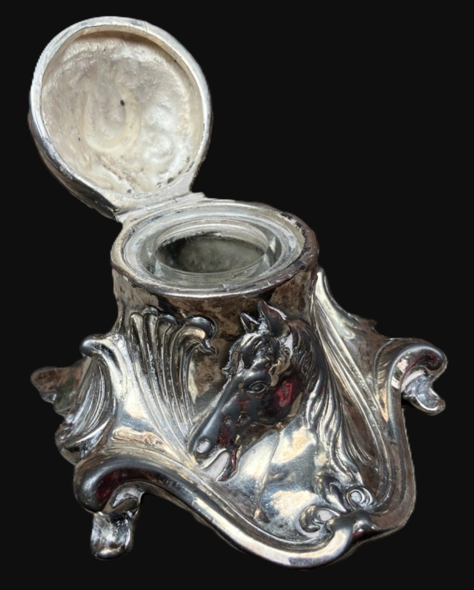 - The Equestrian Series: This inkwell was part of a popular “Equestrian” or “Sporting” line. During this era, horse-themed decor was highly fashionable for men’s libraries and studies. The horseshoe handle on the lid was a common Victorian/Edwardian symbol for “Good Luck,” often paired with the horse relief to create a cohesive theme.