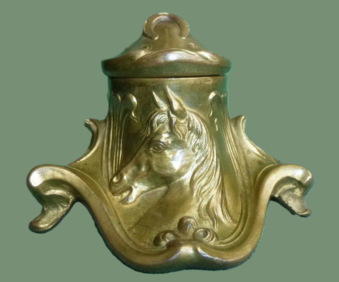 Jennings Brothers made this inkwell in different finishes (silver, brass, bronze). Three examples are pictured.