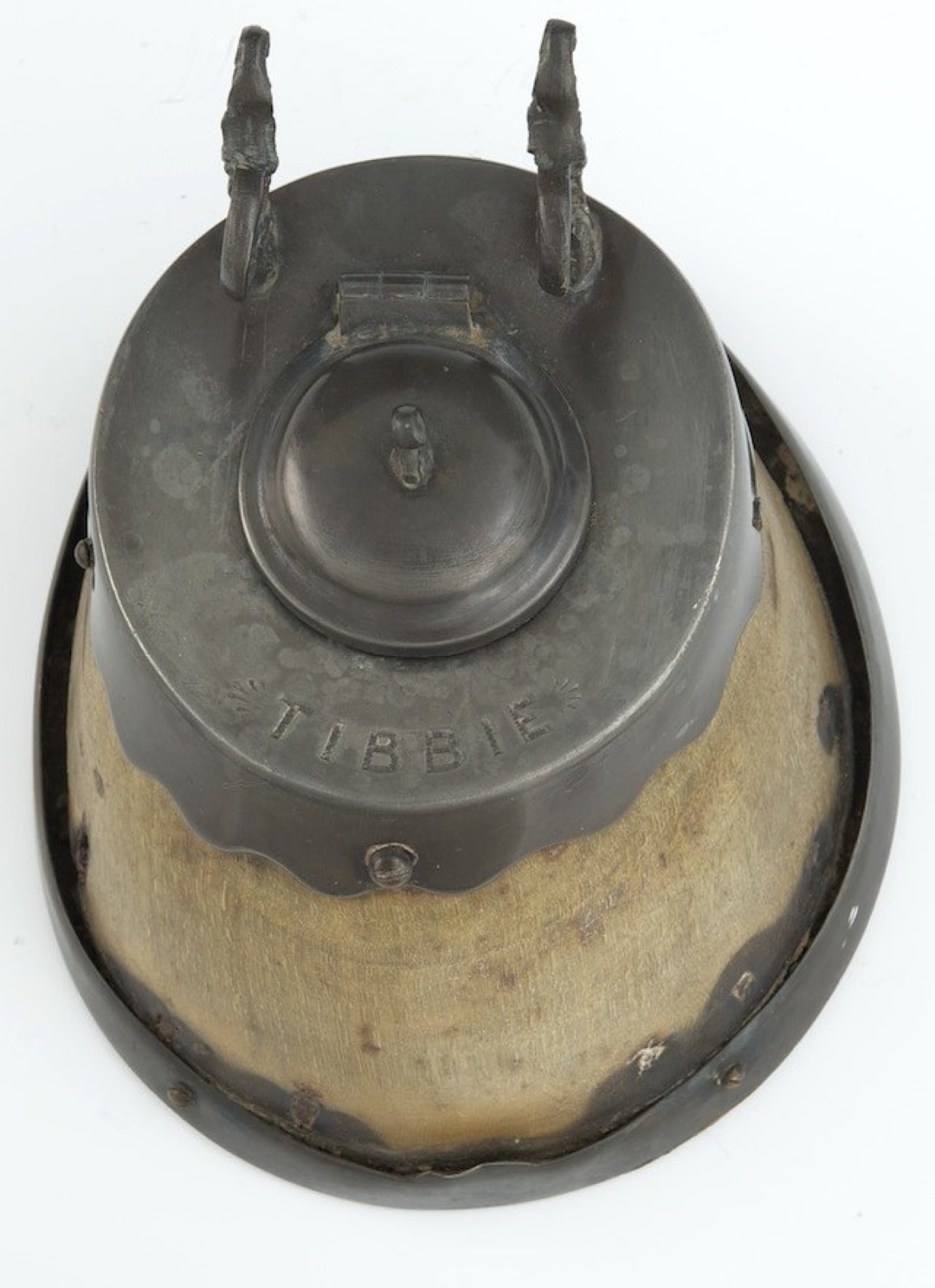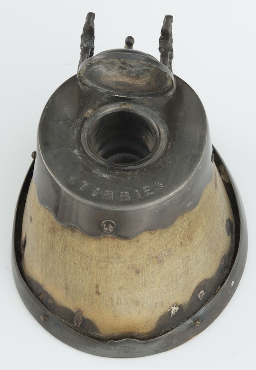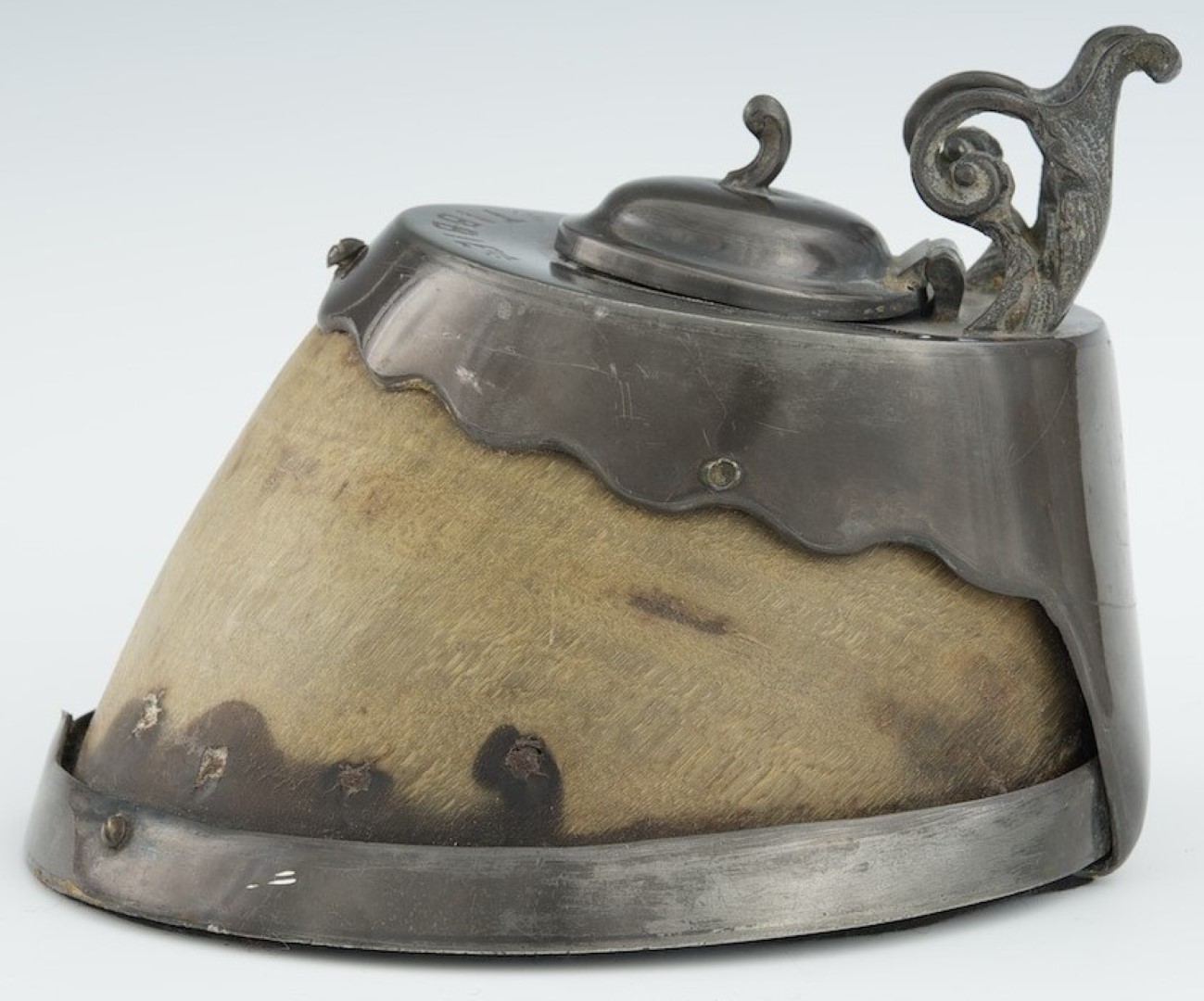Remembering “Tibbie” the horse, his hoof was made into an inkwell having pewter mounts, the cover engraved with his name. A pen holder is attached, and a hinged cap opens to access the interior inkwell with glass insert.