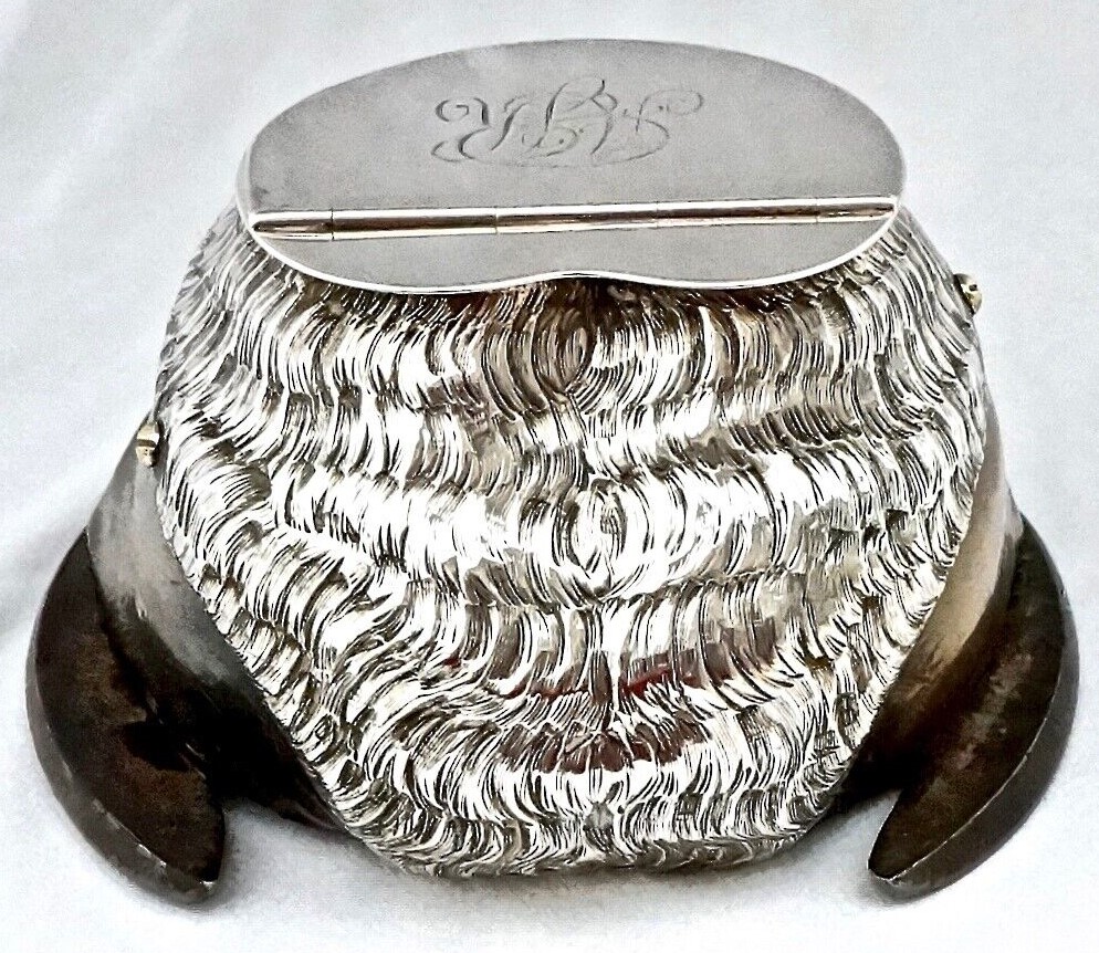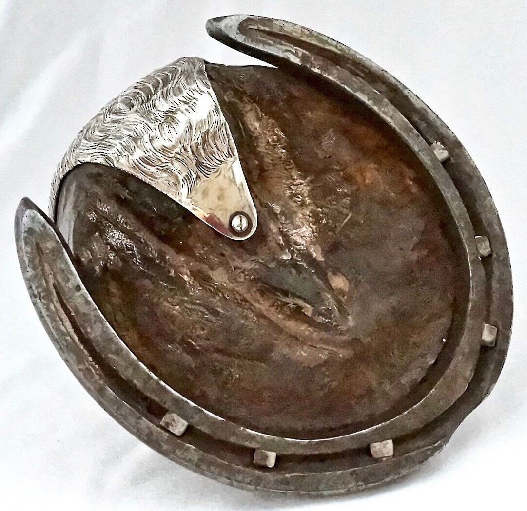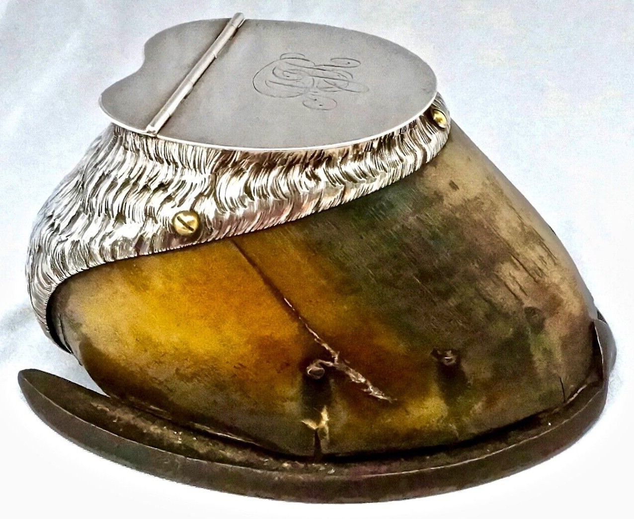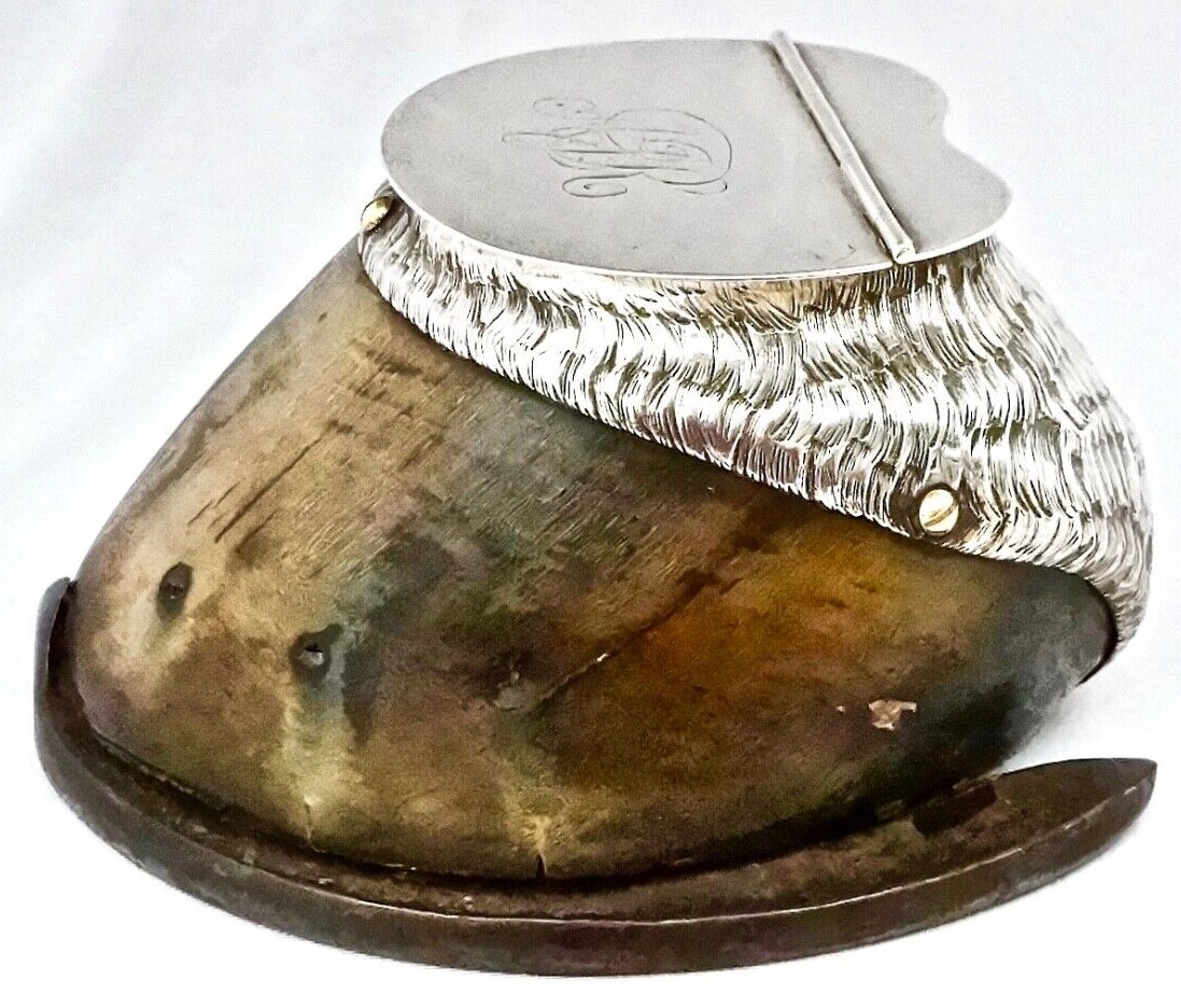 Edwardian sterling silver mounted horse’s hoof inkwell hallmarked Birmingham 1904 by C.T. Burrows & Sons (Charles Turman Burrows). The attractive silver mount uses a large amount of silver. The heel was crafted to look like real horsehair. The lid is engraved with the initials “AJR”. The hoof is shod with a cast iron shoe, firmly fixed.