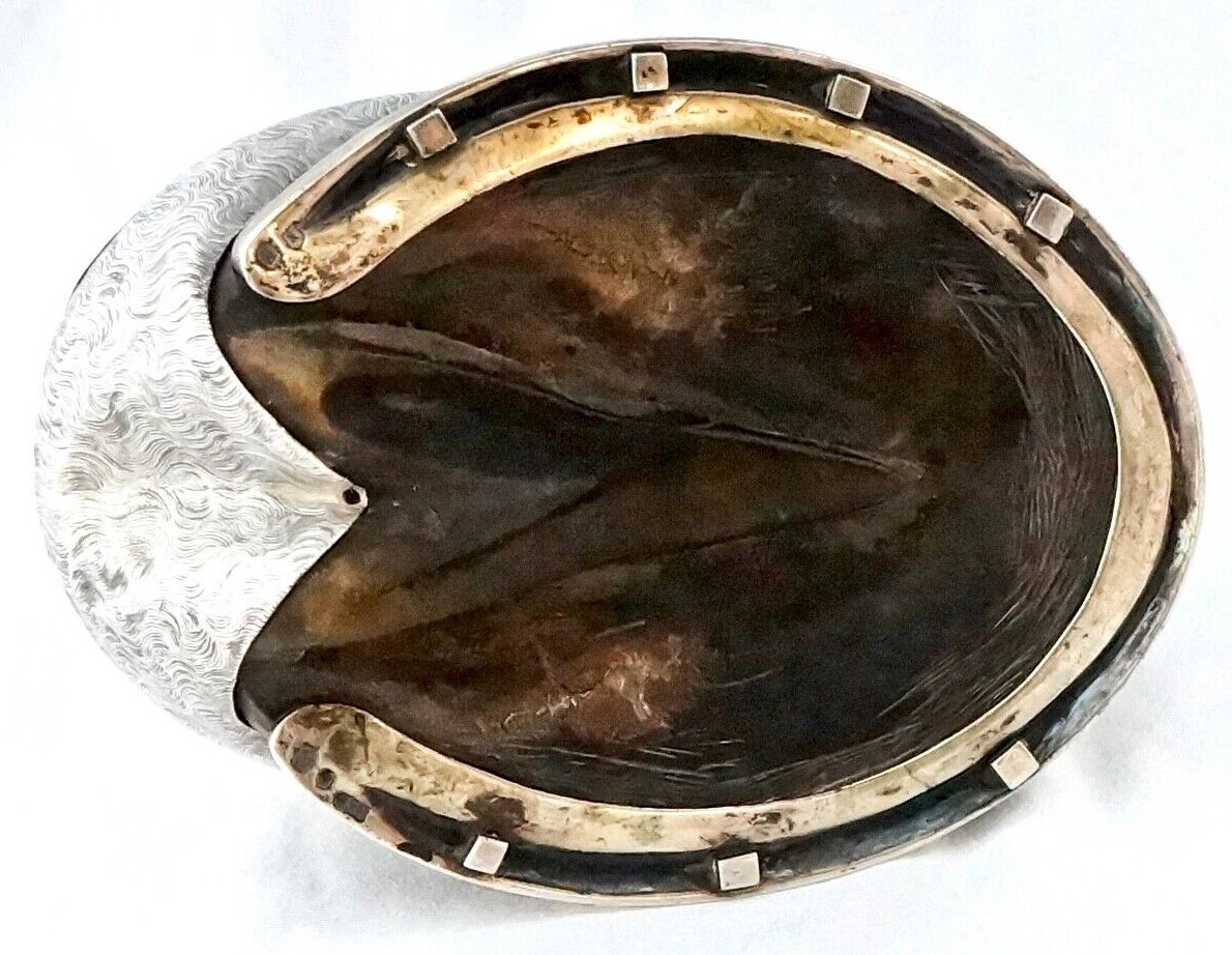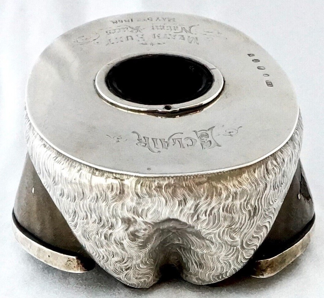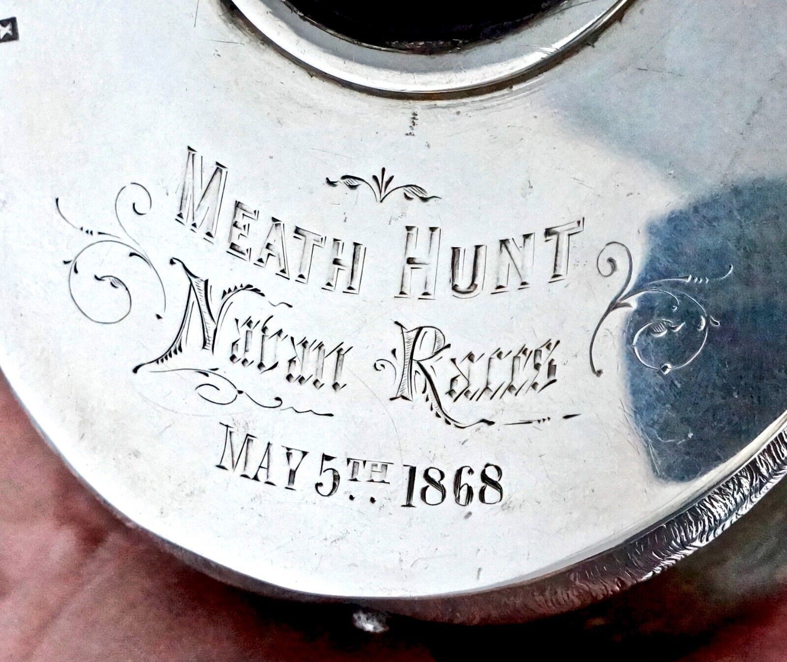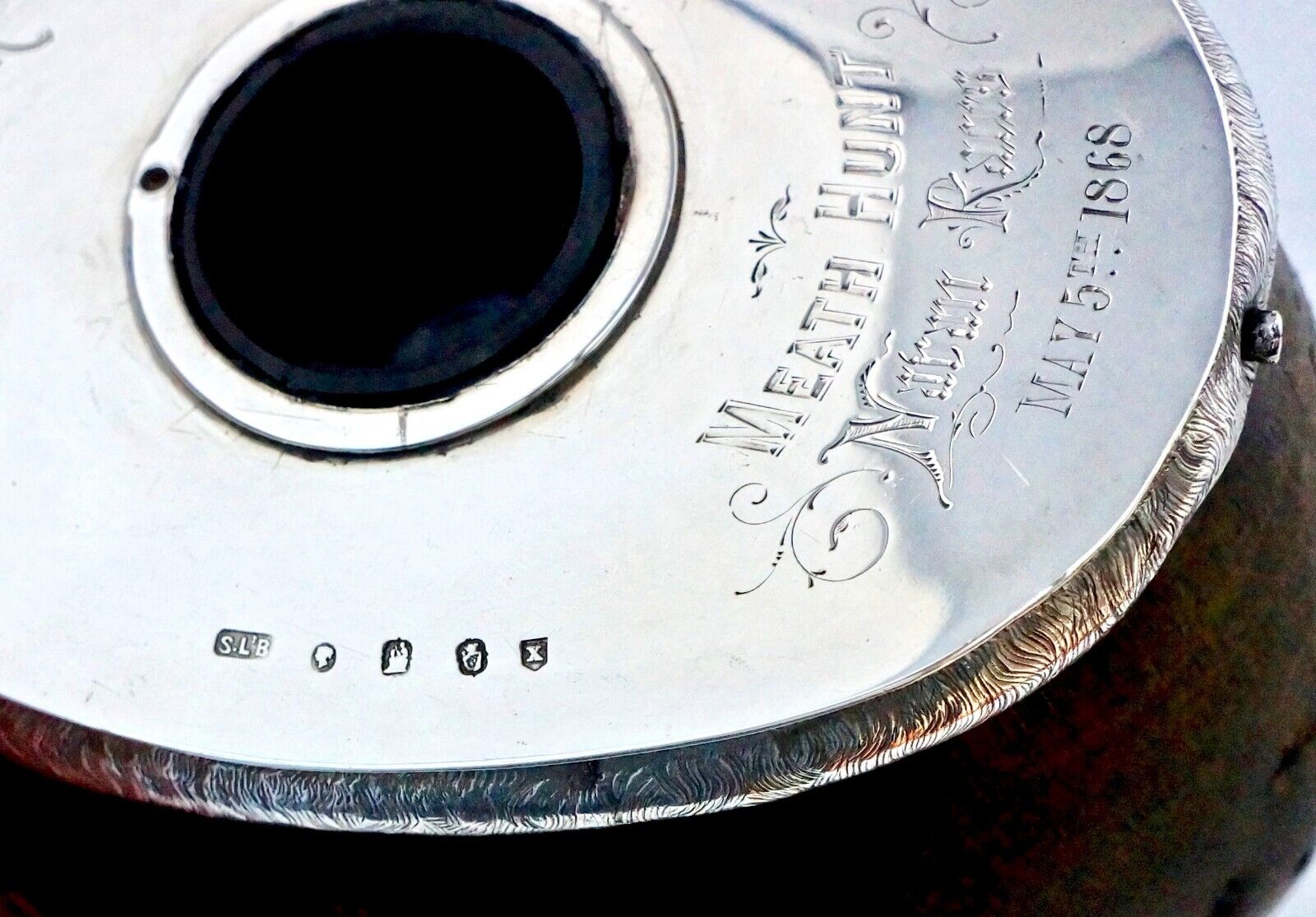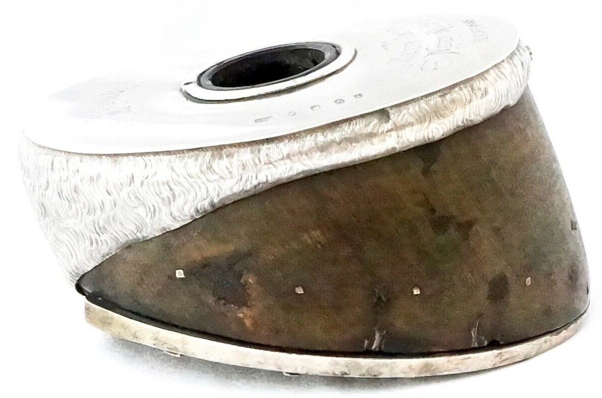 Victorian Irish sterling silver taxidermy horse hoof inkwell relating to the famous Meath Hunt, a foxhunting hunt based in County Meath, Ireland. The horse hoof has a hallmarked sterling silver mount depicting a realistic horsehair design. The engraving reads “MEATH HUNT Navan Races MAY 5th 1868”. The of the horse, ÉCLAIR, is also engraved. The hoof also has a hallmarked sterling silver shoe, the hallmarks the same as the silver mounting.
