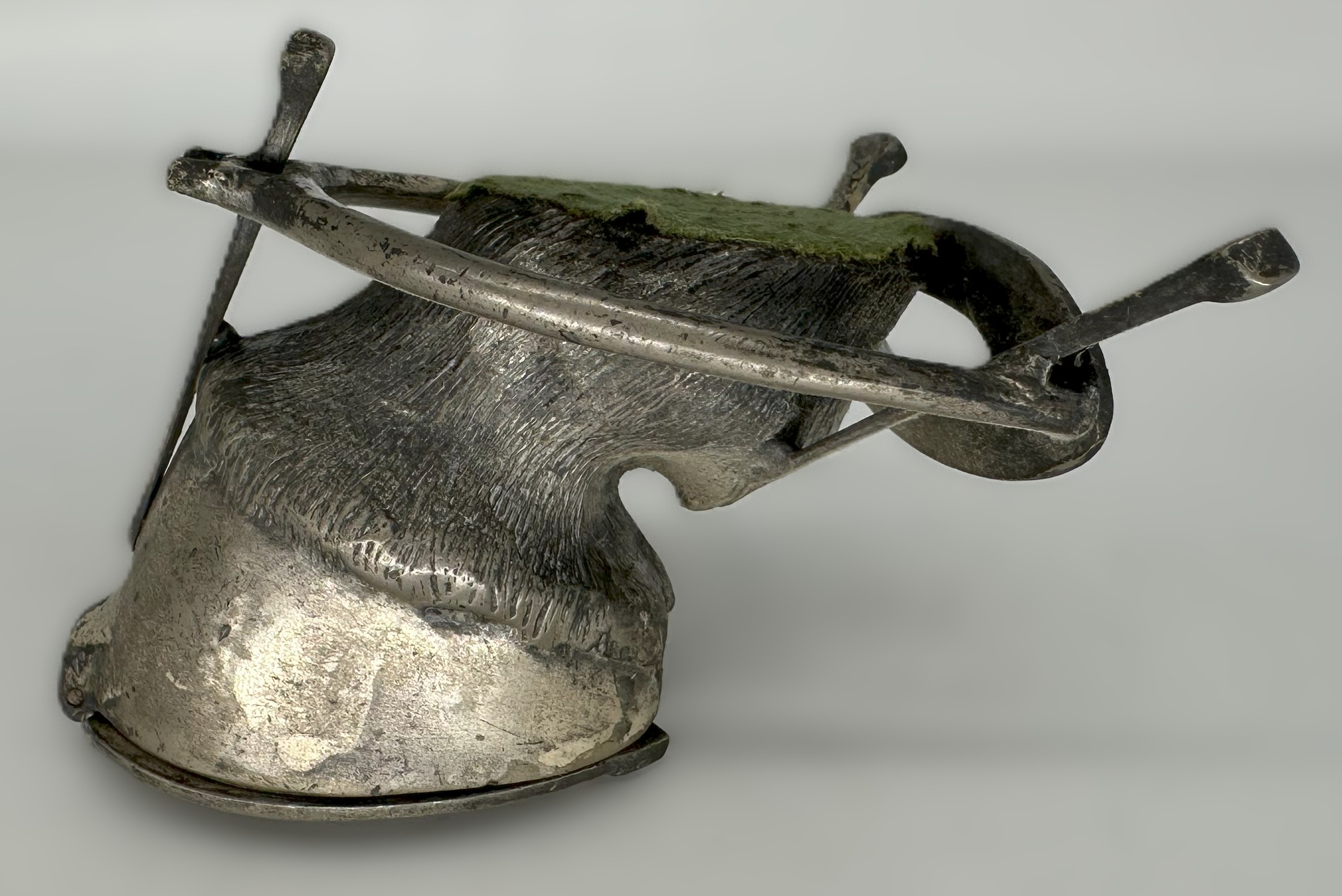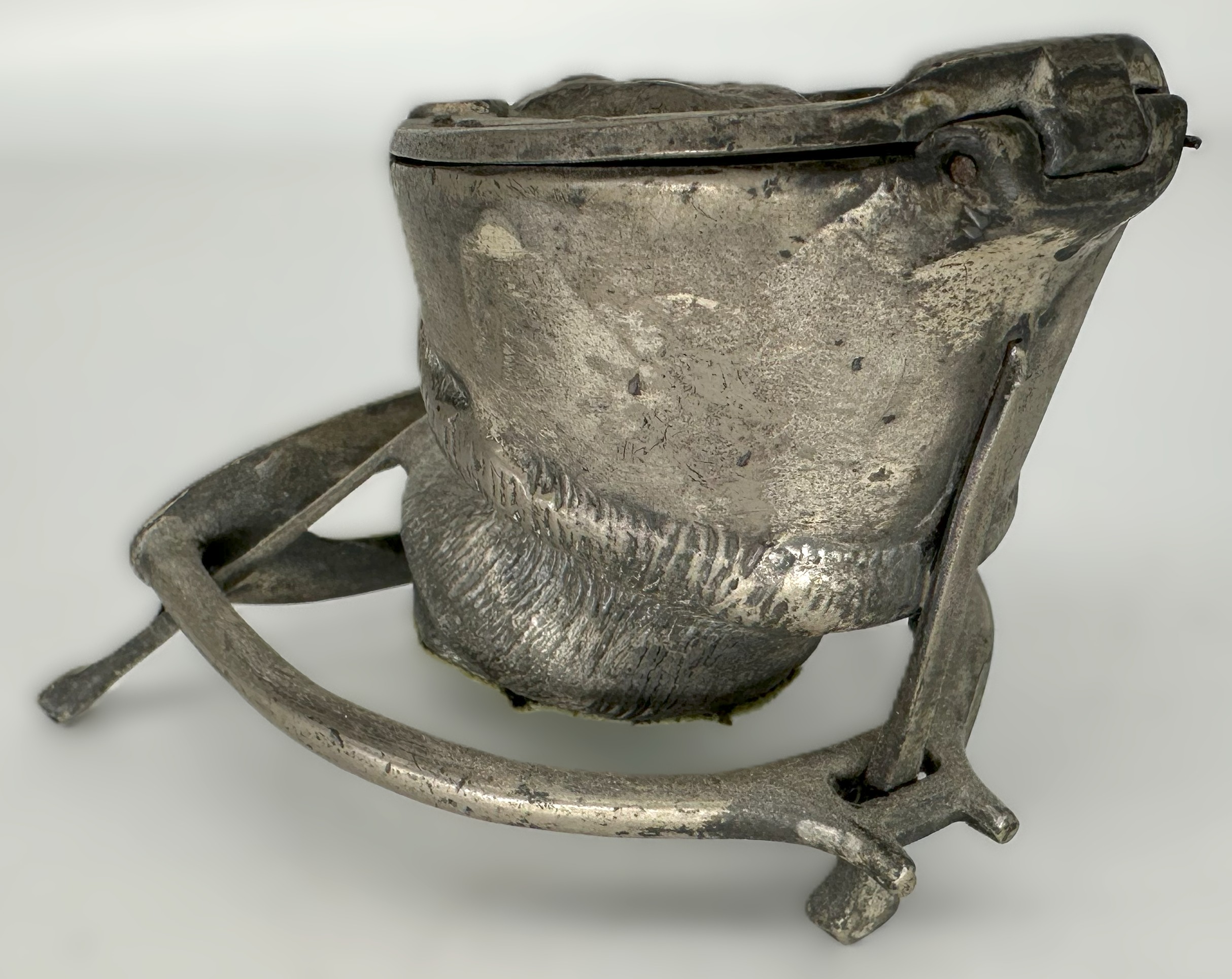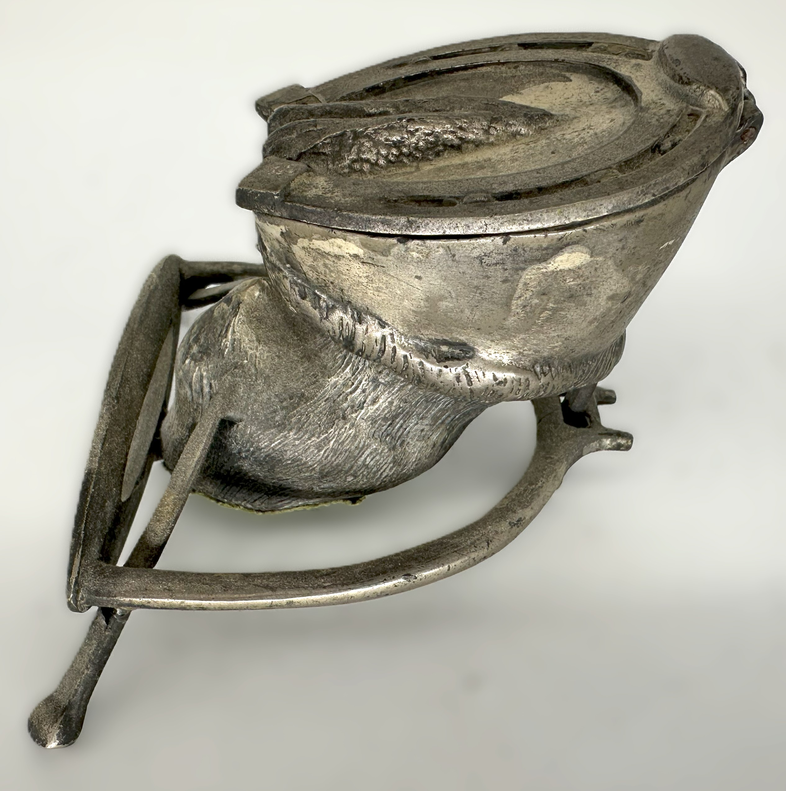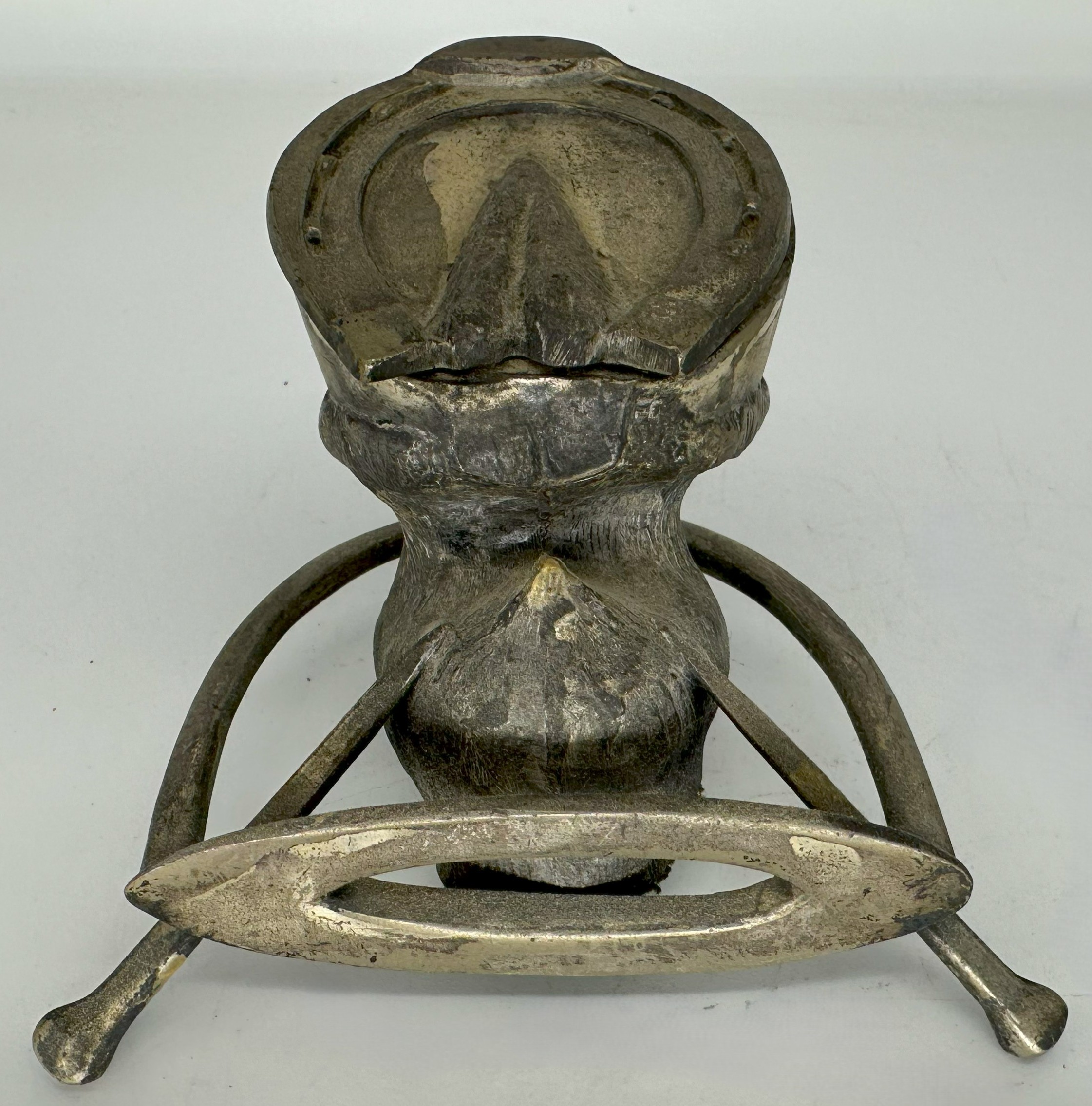 - The Hoof: It is a metal casting of a horse’s hoof, detailed to resemble the texture and contours of a real hoof. The bottom of the horse-shoed hoof is hinged and opens to reveal the glass inkwell insert.