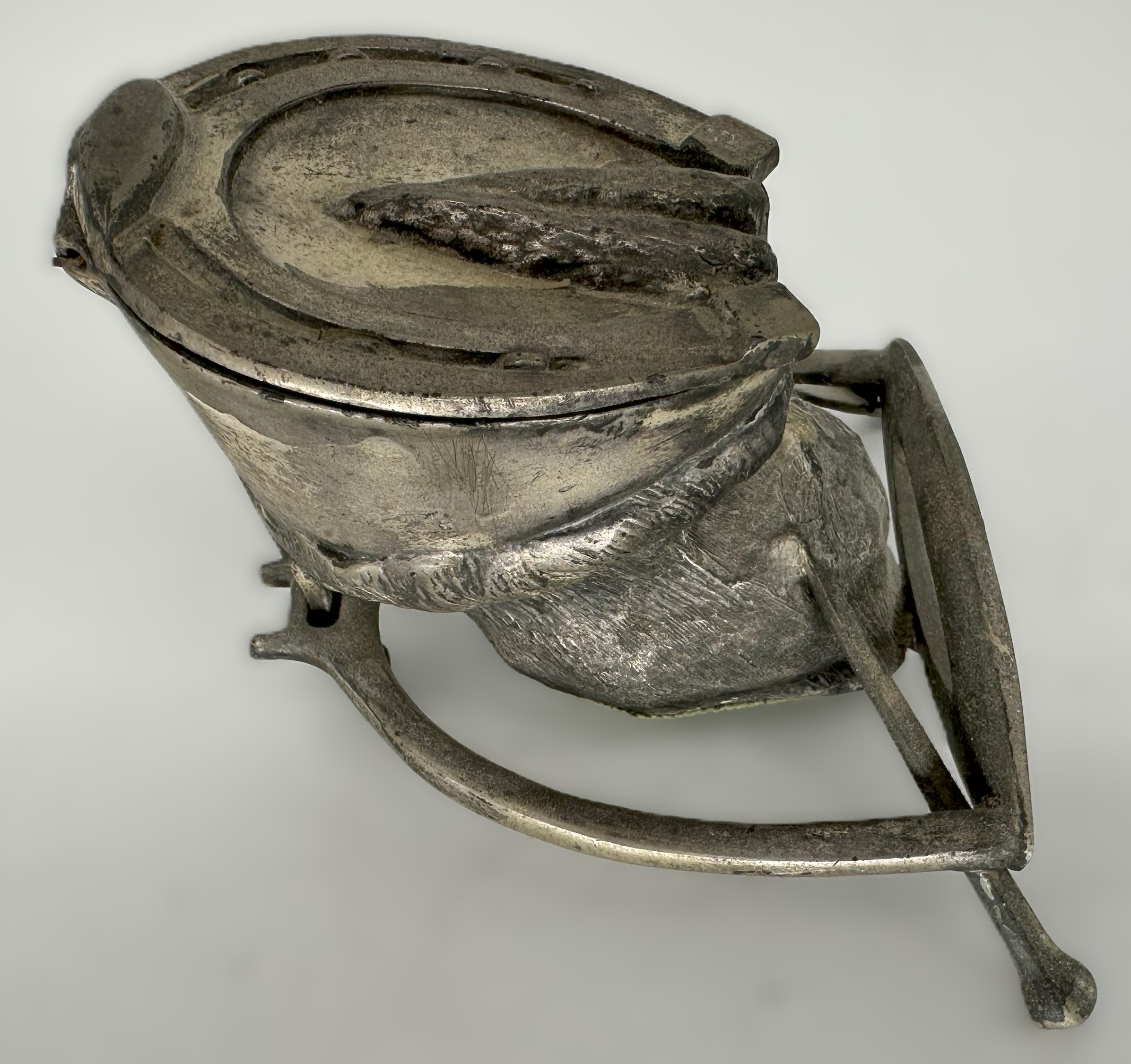 Horse’s hoof inkwell in an unusual form. The hoof is turned upside down, so that the bottom of the horse’s hoof (with horseshoe) opens for access to the inkwell.