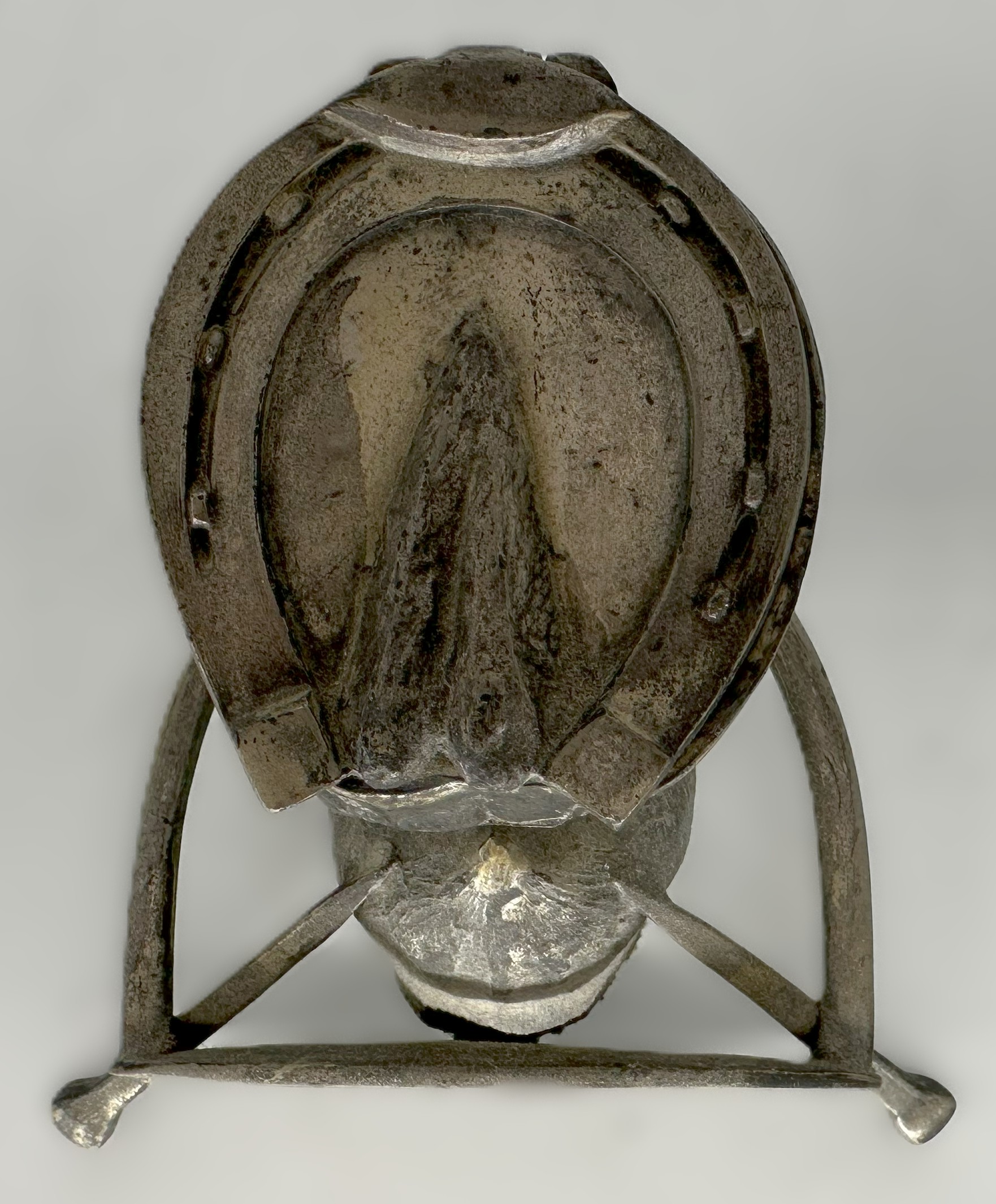 - Overall Form: The piece is a smaller, fully realized metal sculpture replicating a horse’s hoof and horseshoe.