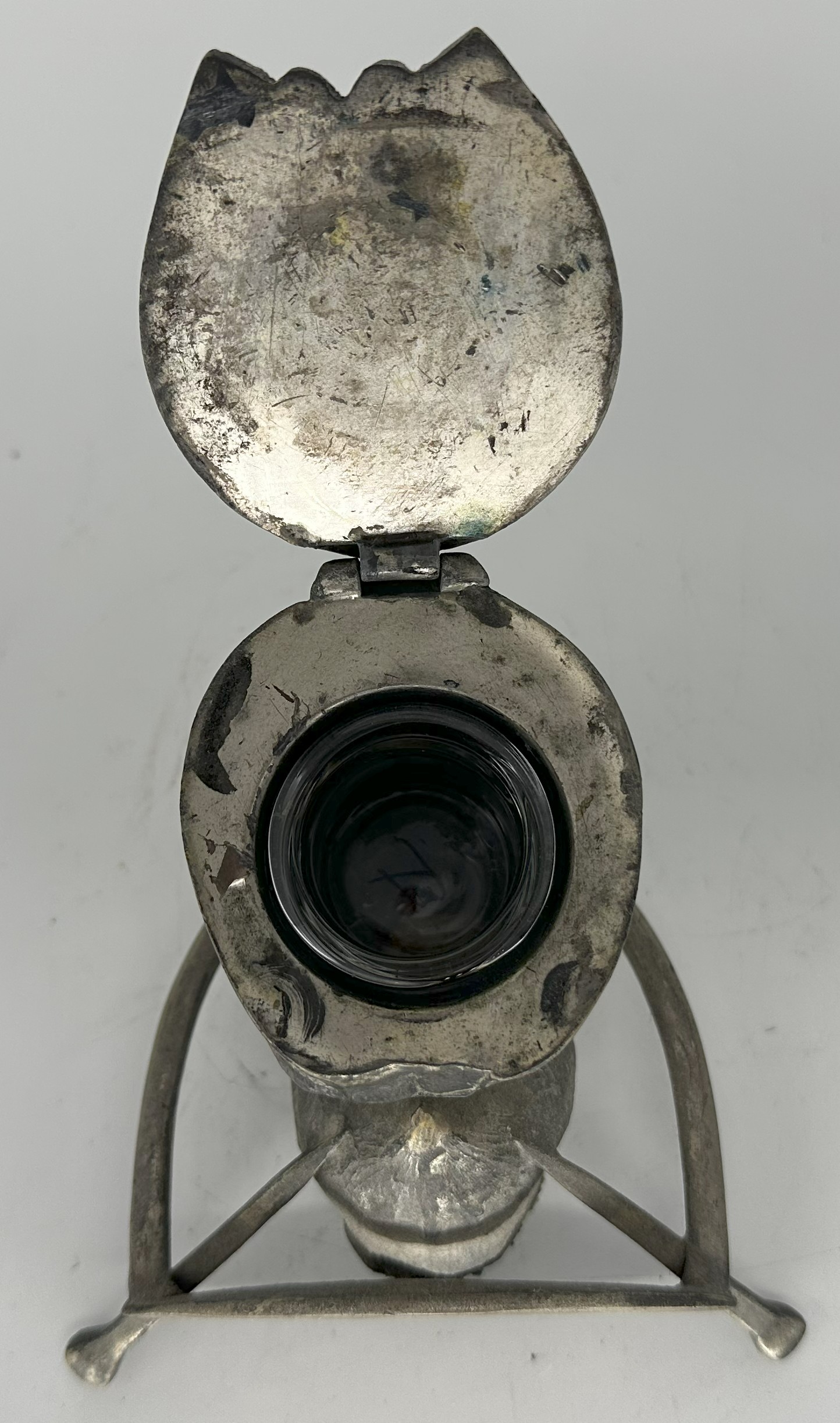 - Materials: Cast spelter with glass inkwell insert.