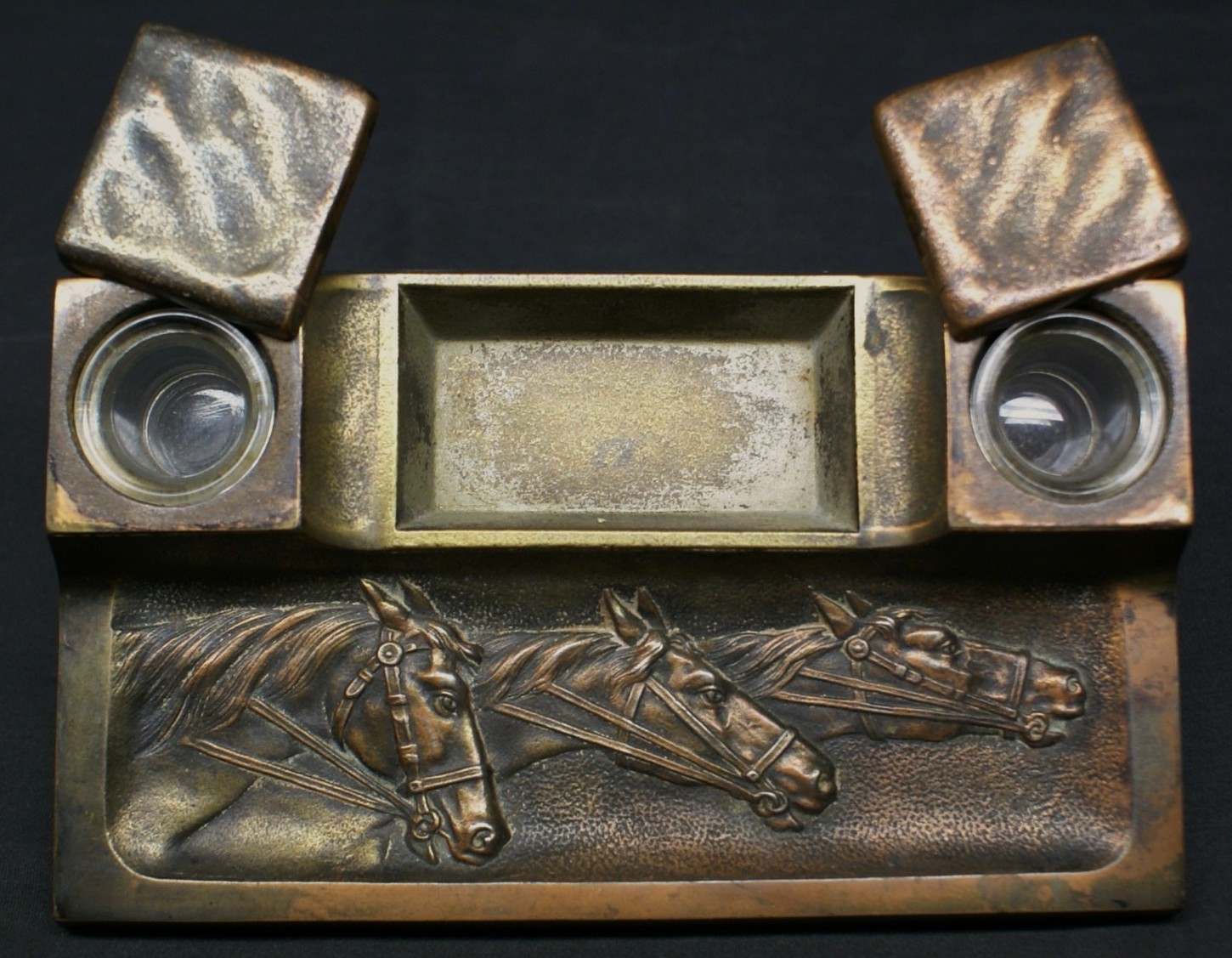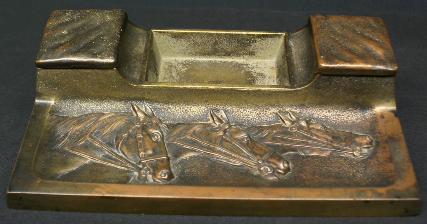 Brass double inkstand featuring three racing horses in high relief decorating the pen tray. The flat square lids covering the inkwells pivot on pins to open. In the center, between the inkwells, is a compartment for pen nibs etc.